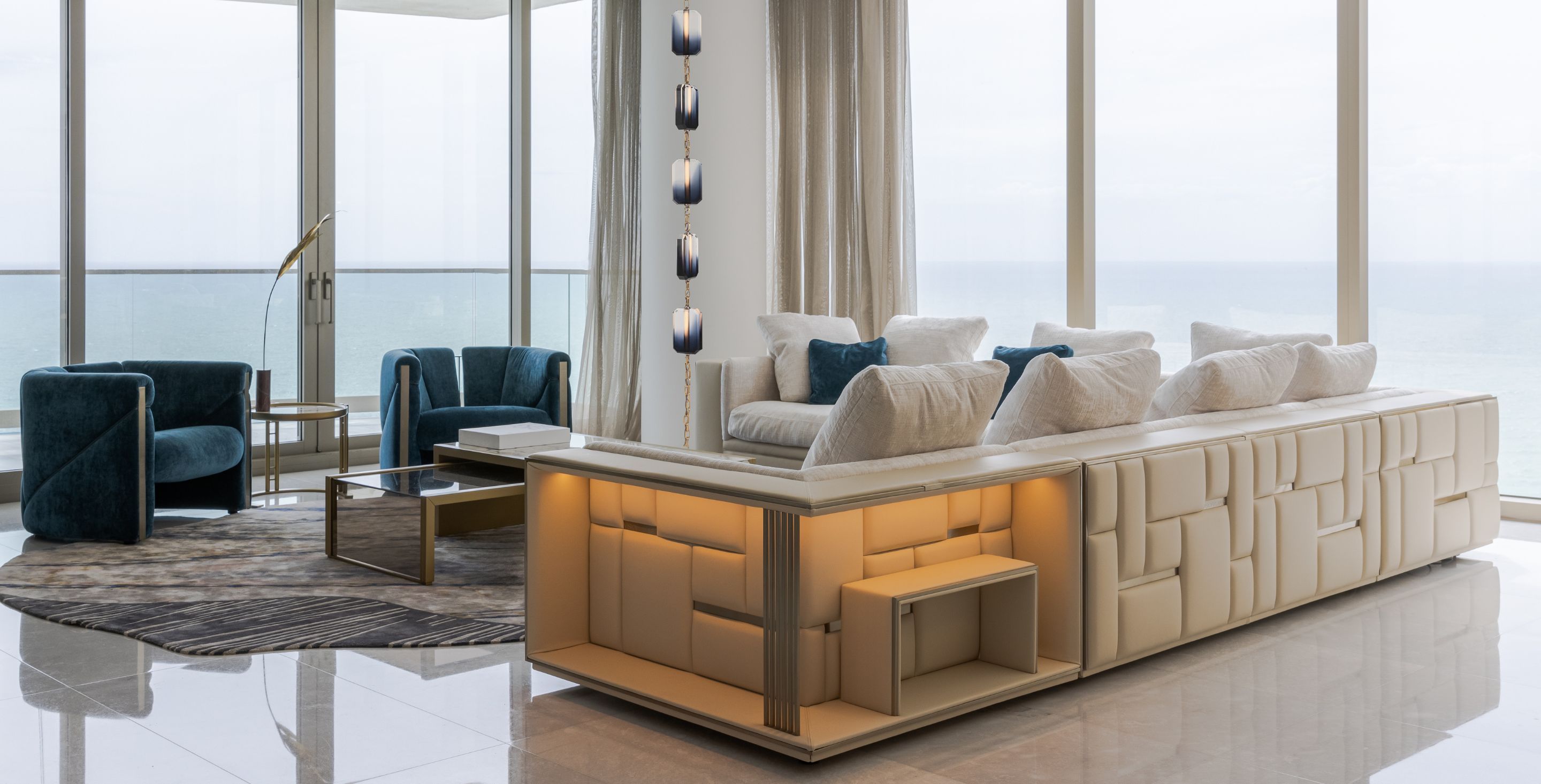 Modular sofa with sturdy wood frame and elastic webbing. Features polyurethane filling. Abstract backrest/arms with cushioned panels, steel inserts, and logo engravings. Available finishes. Features LED bookshelf, magnetic headrest, and wireless charging.