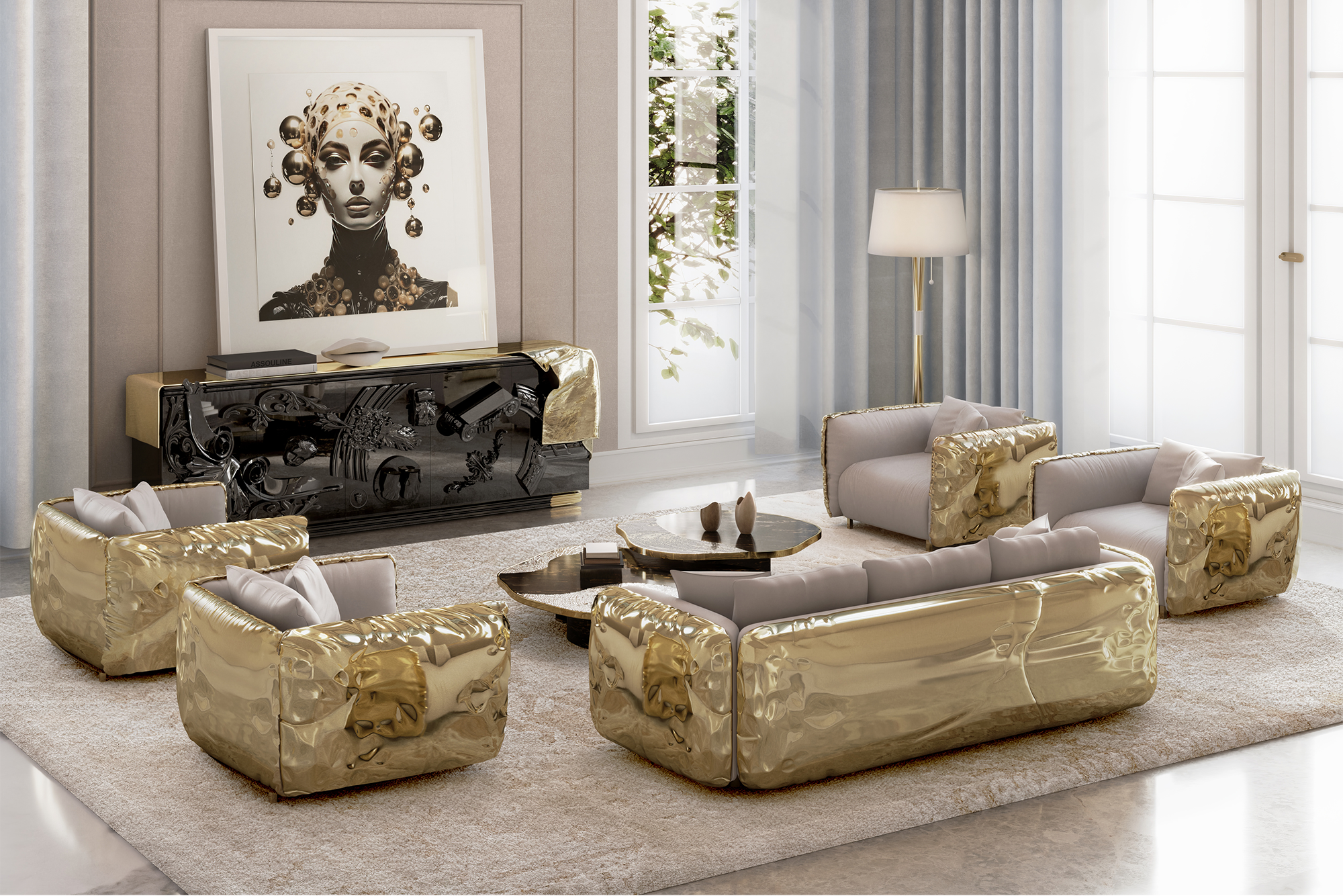This brass style living room series perfectly blends modern luxury and classic elements, with an exquisite and atmospheric overall design that showcases unique artistic charm. The spatial layout is reasonable, combining functionality and aesthetics, with smooth lines and delicate material processing, showcasing elegant taste. The harmonious and unified combination of furniture creates a comfortable and warm living atmosphere. The clever embellishment of decorative elements adds a sense of hierarchy and delicacy to the entire space, making the living room an ideal place to showcase the owner's style and quality of life.