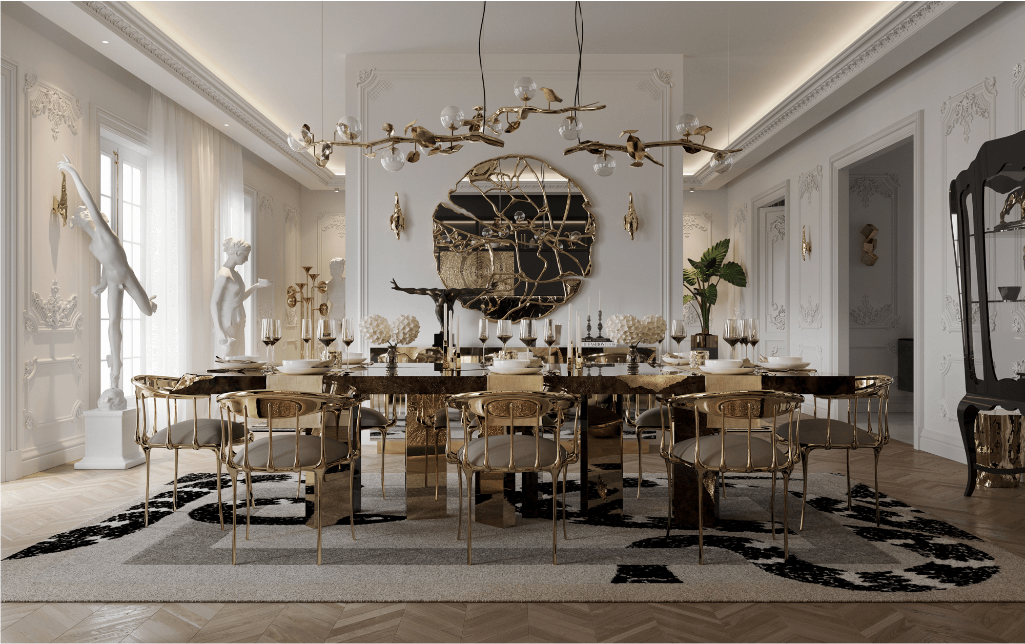 This brass style restaurant collection seamlessly blends luxury and art, creating an elegant and unique dining atmosphere. The overall design is centered around the elegant luster of brass material, paired with classic black and white main colors, outlining a low-key yet noble spatial style. The layout of the restaurant area is reasonable, emphasizing both functionality and aesthetics, with smooth lines and exquisite material processing showcasing extraordinary taste.