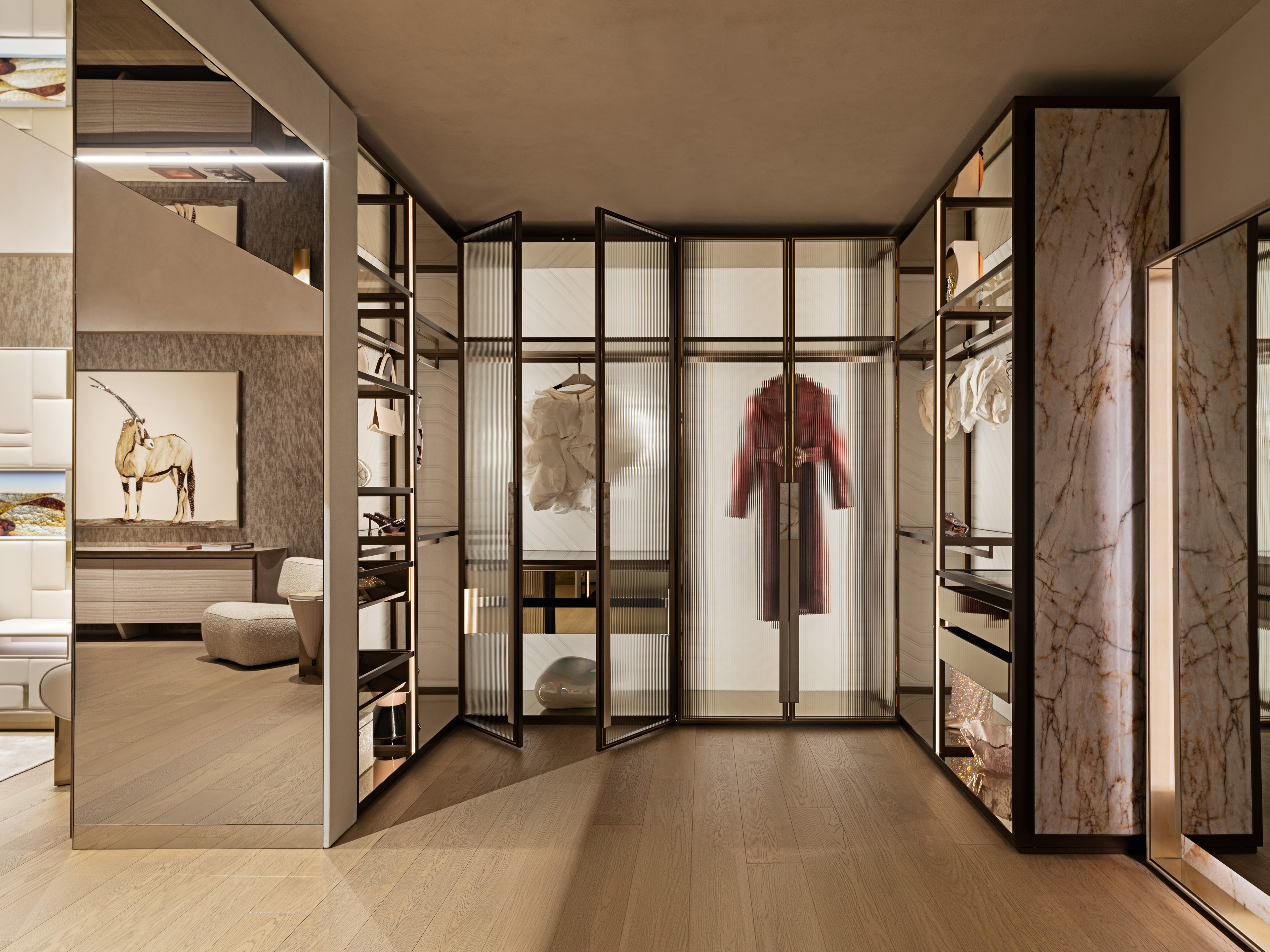 This walk-in wardrobe series perfectly blends modern luxury with practical functionality, creating a spacious and exquisite storage space. The overall design emphasizes the rationality of spatial layout, meeting the storage needs of different clothes and accessories through clever zoning and layering. High quality materials are carefully selected, with a warm touch and natural visual effects, showcasing extraordinary taste. The suspended clothes hanger and transparent glass cabinet door not only facilitate access, but also add a sense of lightness. Whether it's daily dressing or precious collection, this walk-in wardrobe series can provide you with an orderly and stylish exclusive space.