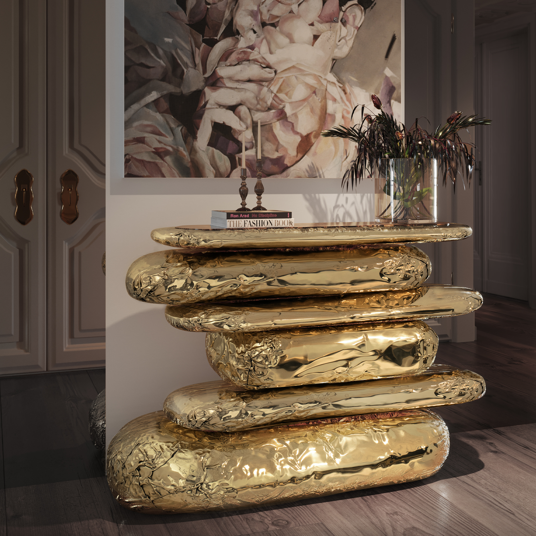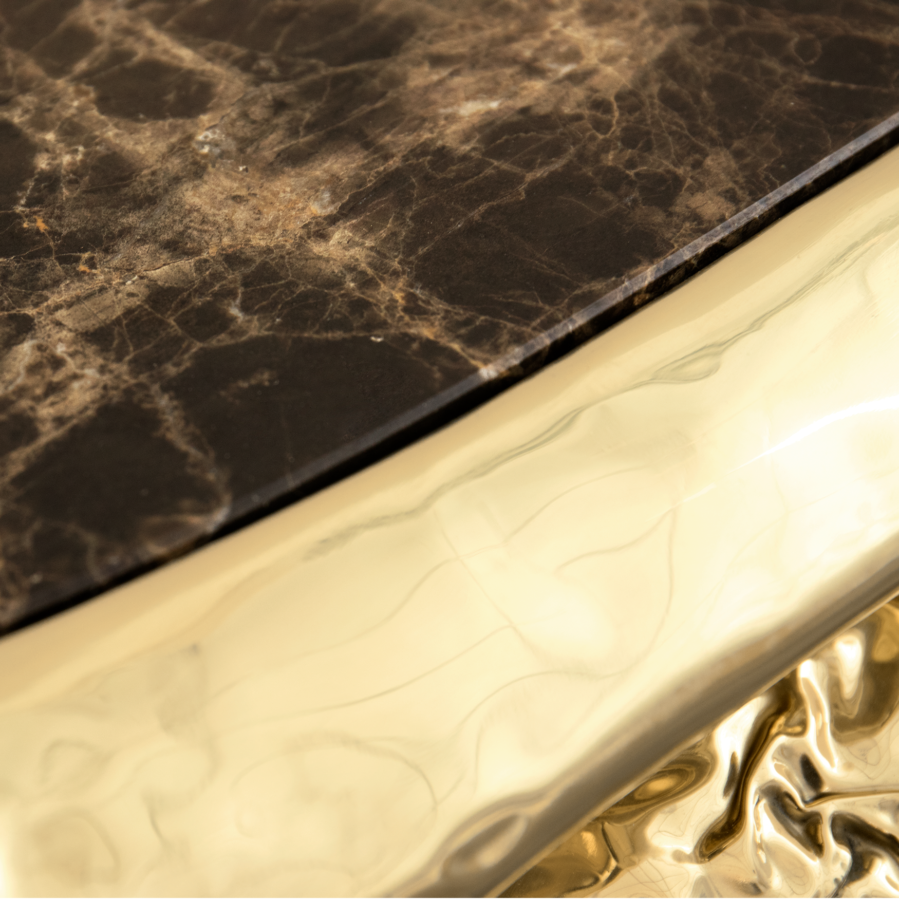 This foyer table perfectly combines the luxurious texture of brass and marble, with a clever contrast between the brass luster of the tabletop and the natural texture of marble, which is both elegant and full of artistic atmosphere, adding a sense of luxury and uniqueness to the foyer space.