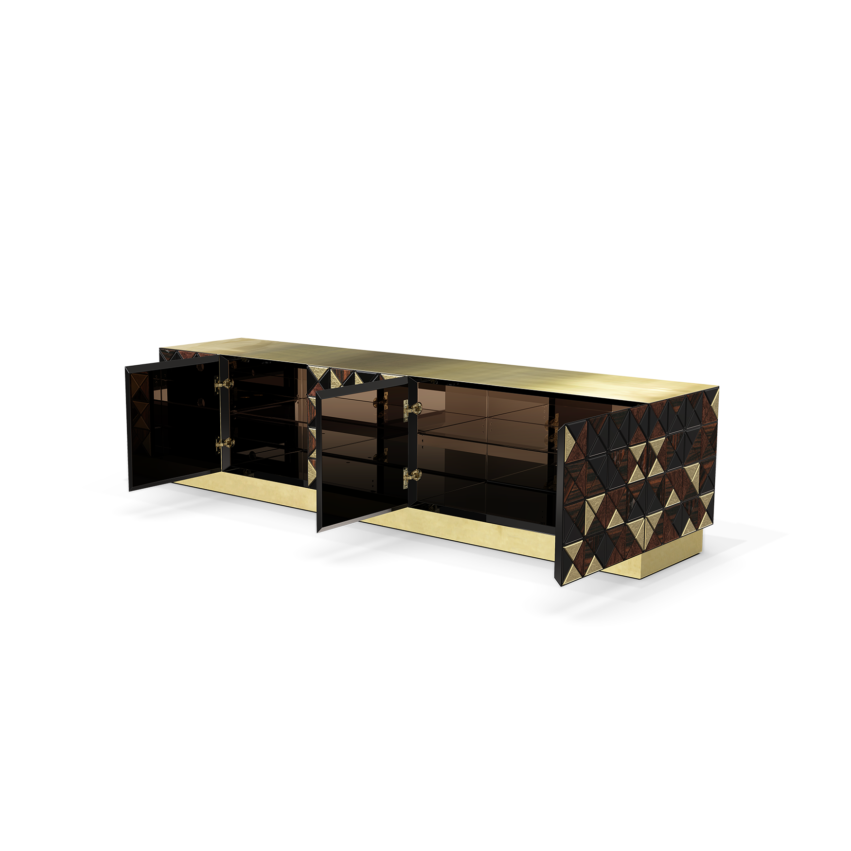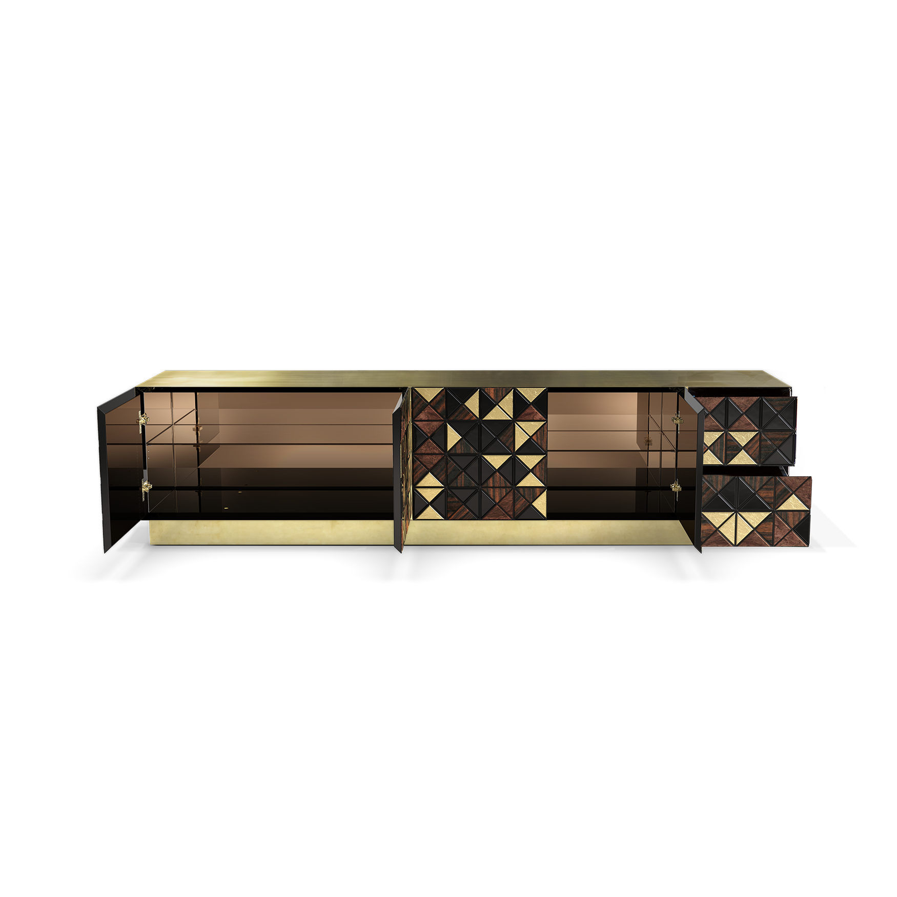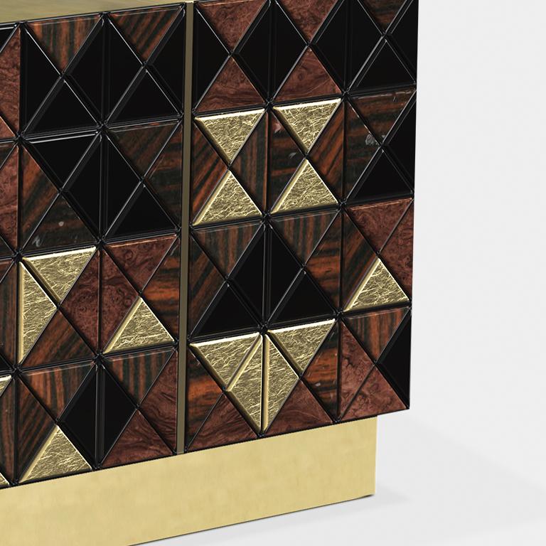This modern geometric design storage cabinet is inspired by the aesthetics of modern architectural geometry, with black and gold triangle geometry spliced together, and material contrast highlighting a noble temperament. Multi drawer sliding door design for convenient storage.