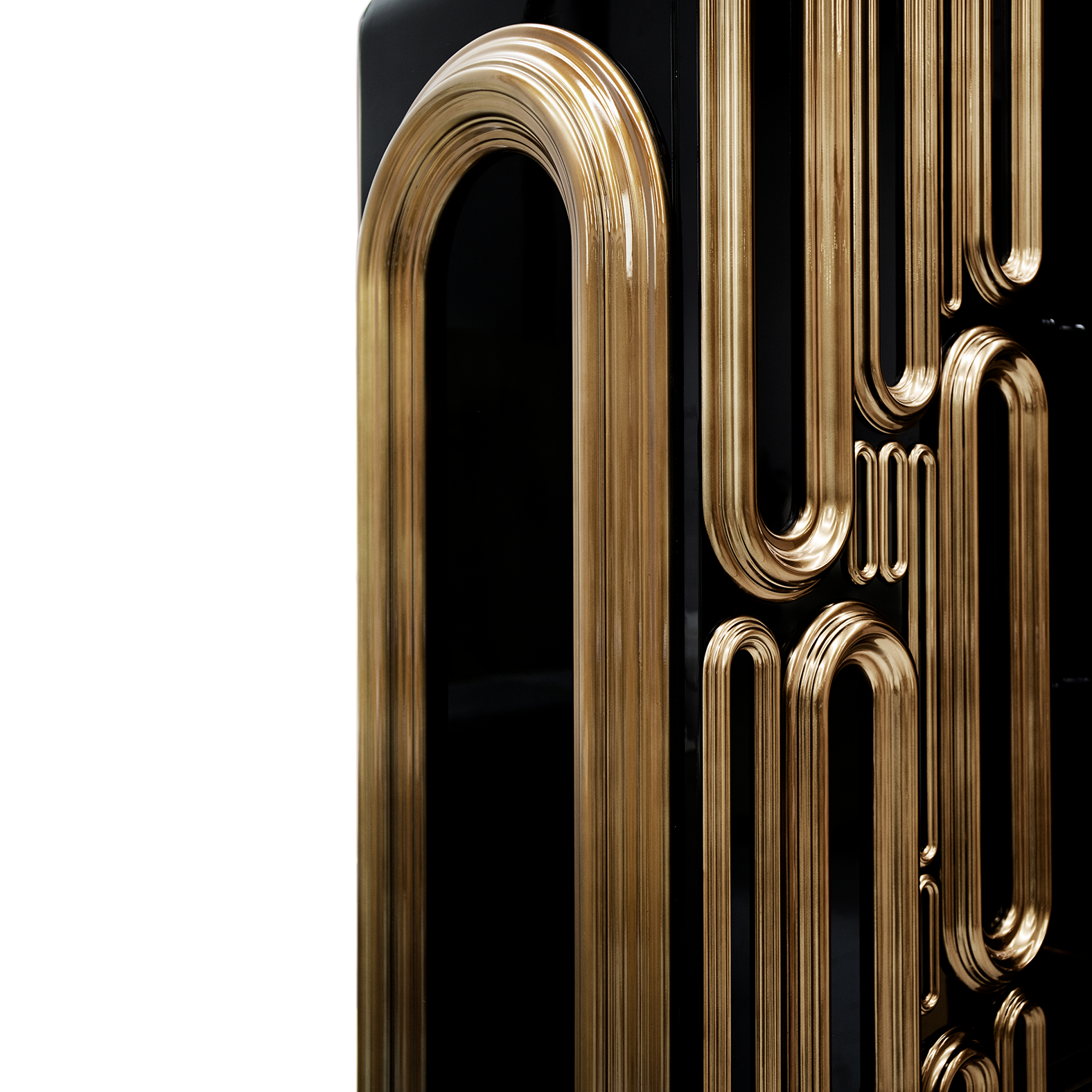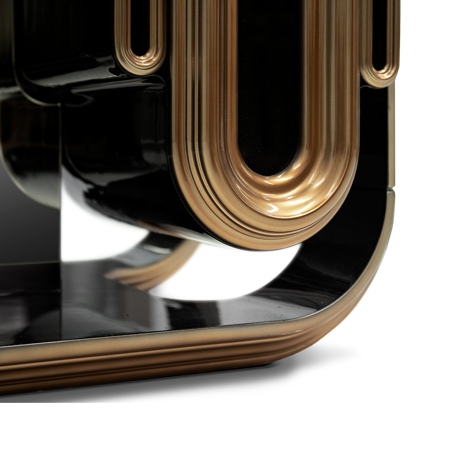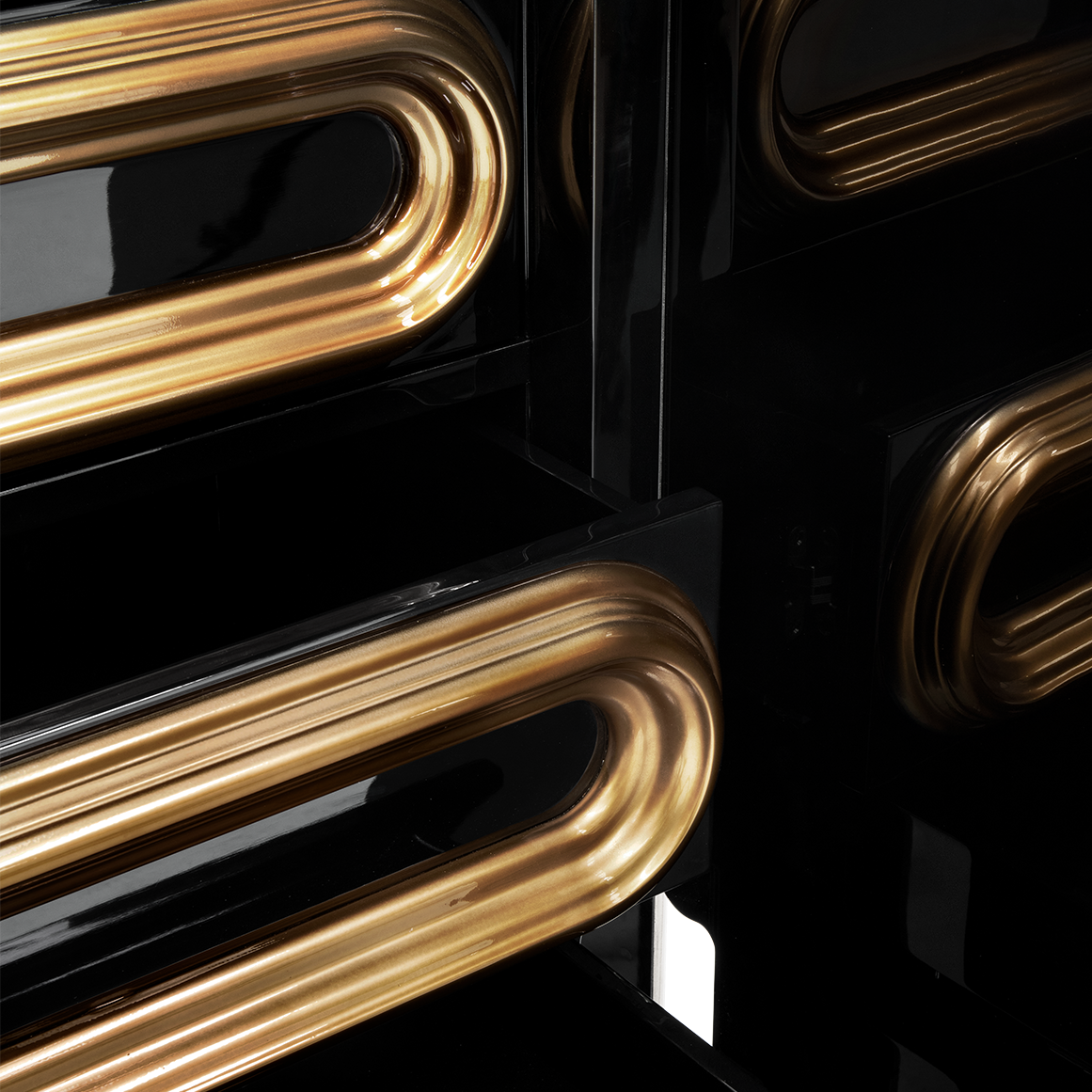 This modern storage cabinet features geometric three-dimensional shapes outlined with metallic gold lines, complemented by a black cabinet body, showcasing a luxurious and grand atmosphere. The unique design not only adds artistic atmosphere to the home, but also showcases extraordinary taste, which is the perfect combination of practicality and aesthetics.