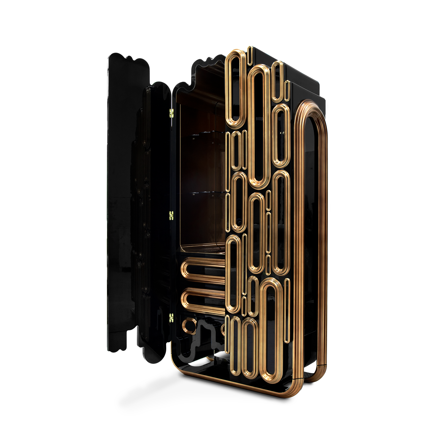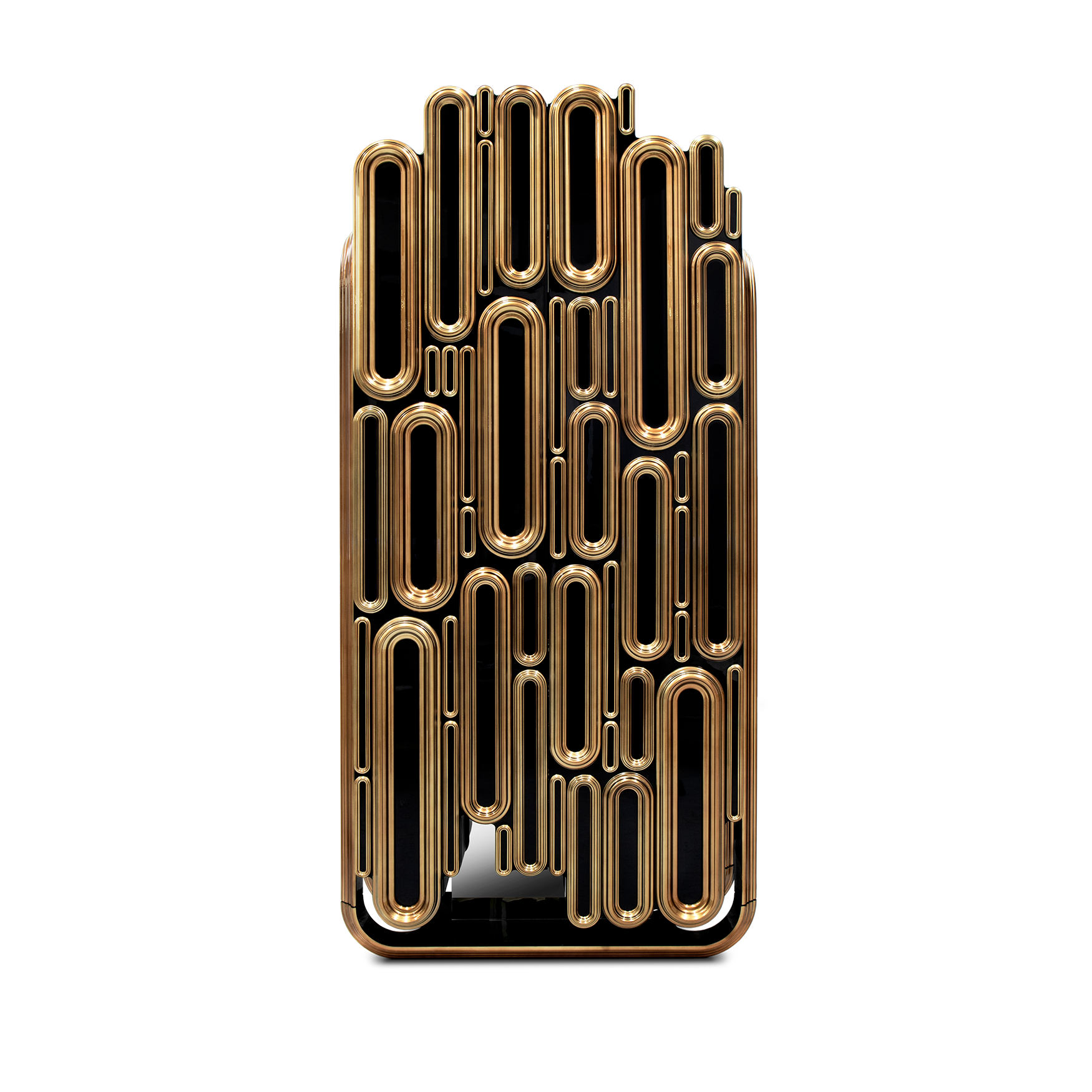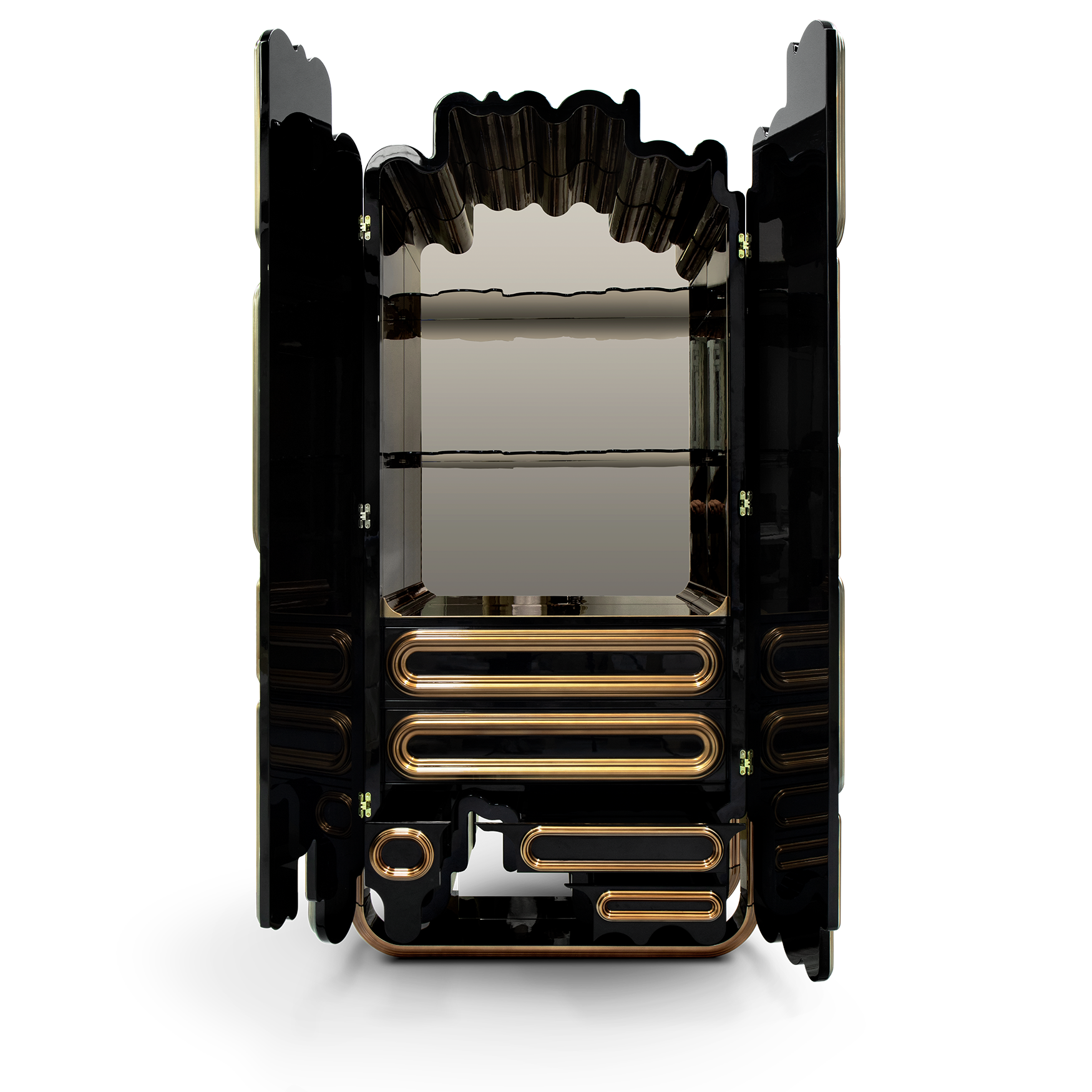 This modern storage cabinet features geometric three-dimensional shapes outlined with metallic gold lines, complemented by a black cabinet body, showcasing a luxurious and grand atmosphere. The unique design not only adds artistic atmosphere to the home, but also showcases extraordinary taste, which is the perfect combination of practicality and aesthetics.
