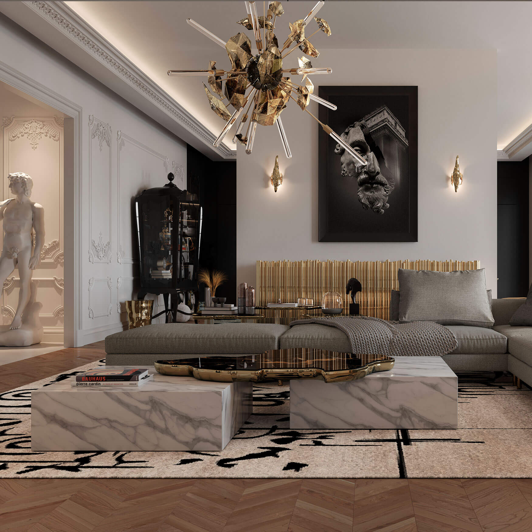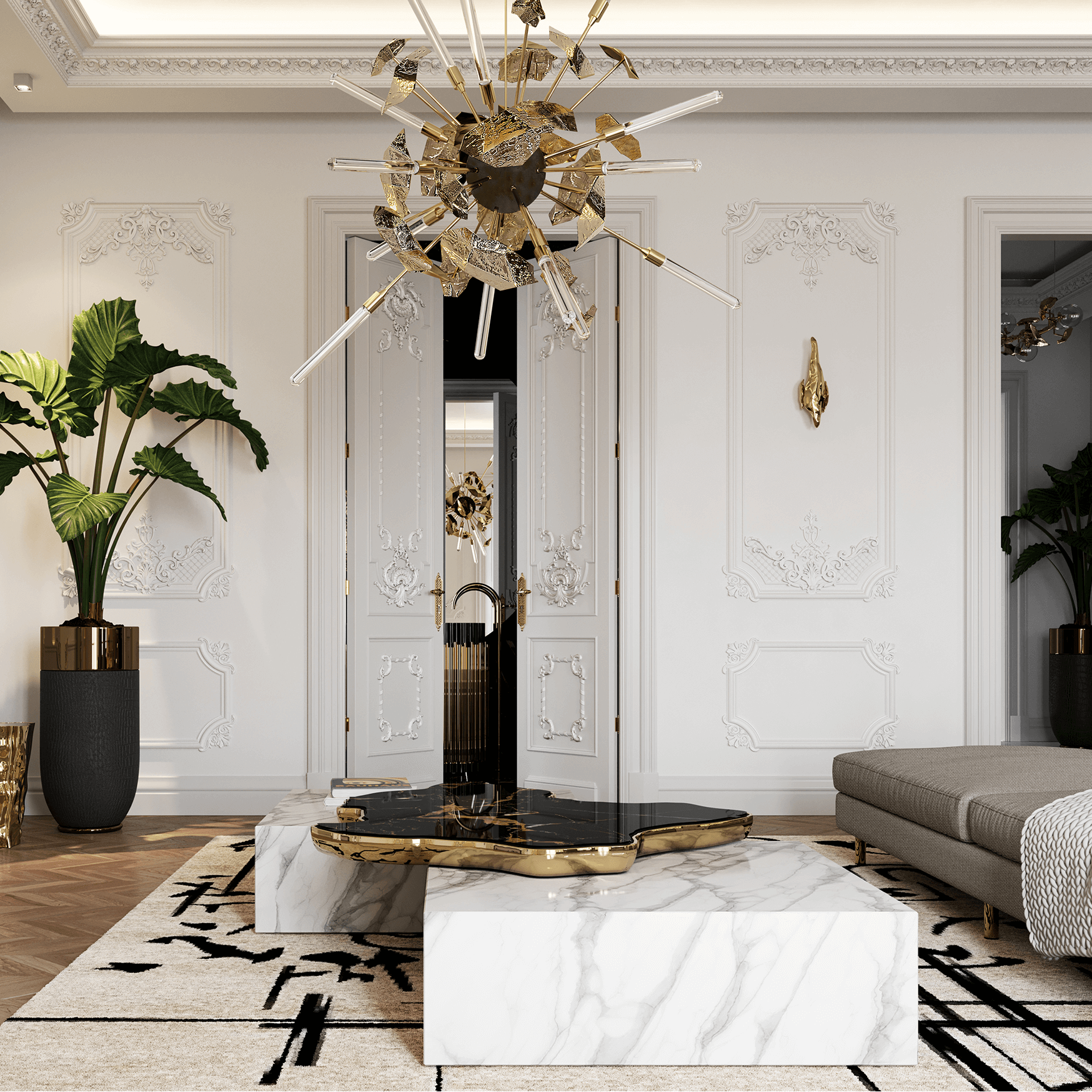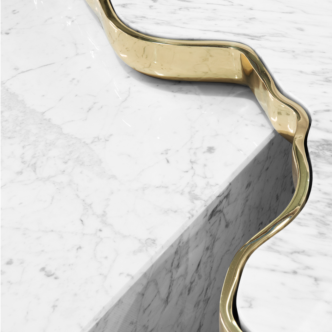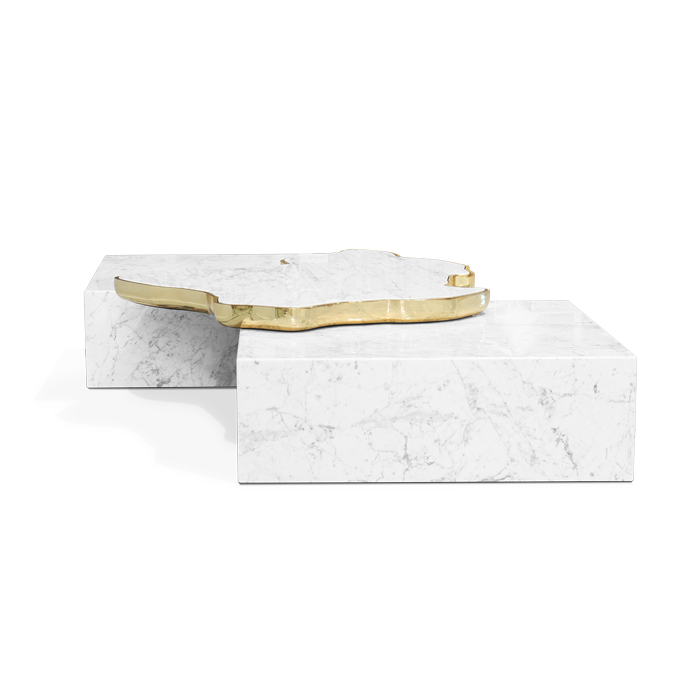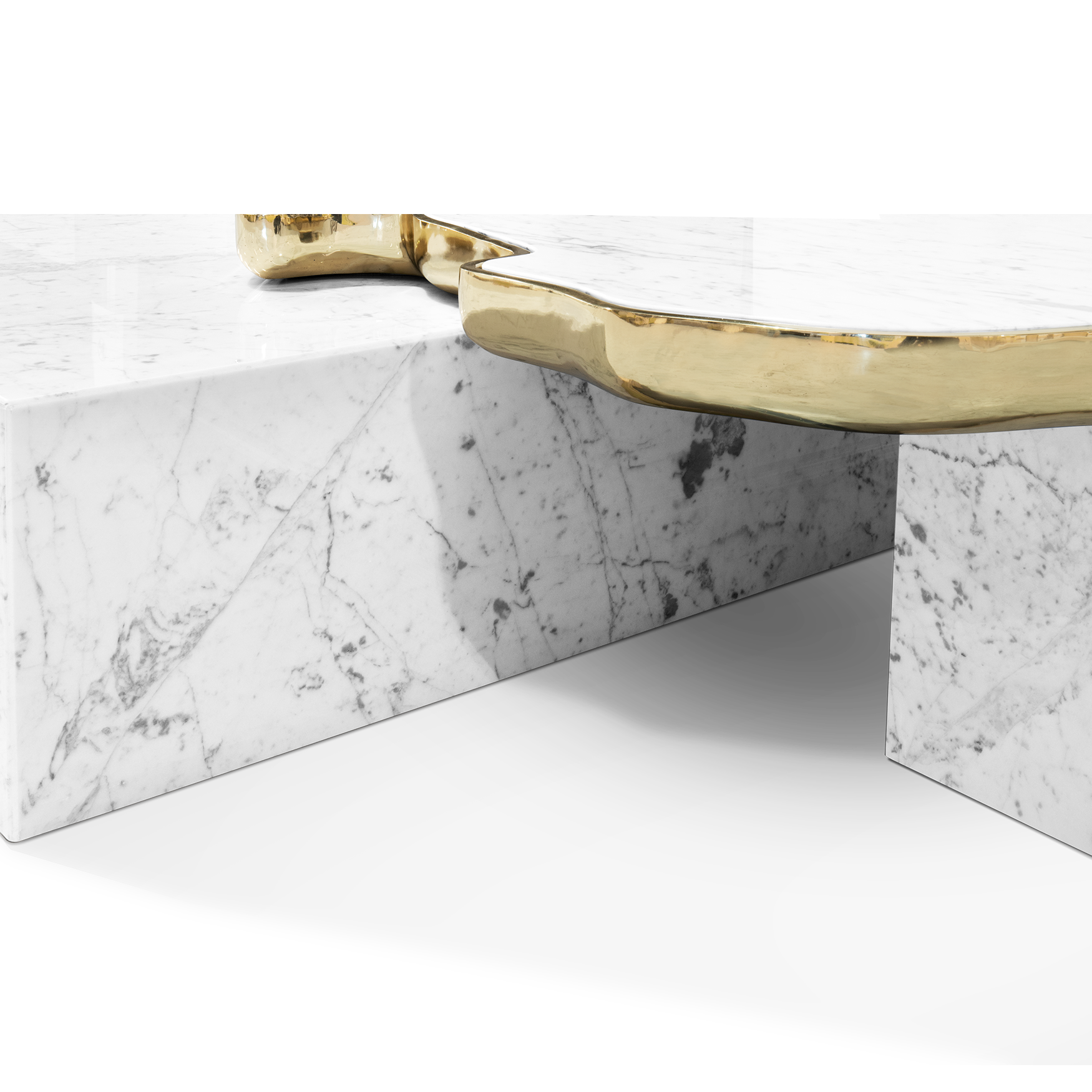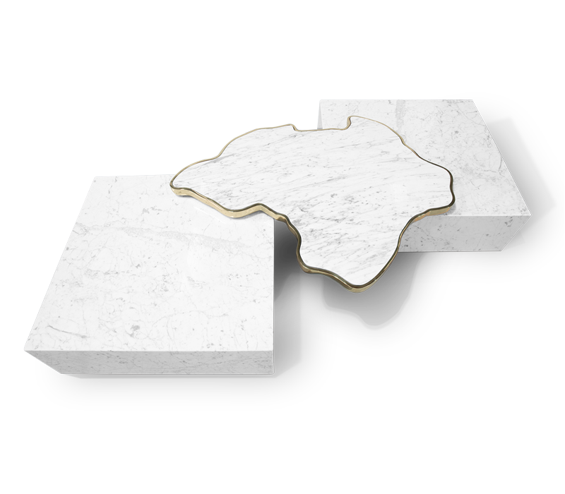 This luxurious designer marble shaped combination coffee table perfectly combines the gorgeous texture of natural marble with the exquisite decoration of golden metal, as if integrating nature and art. The geometrically cut marble base showcases a modern feel, while the embellishment of golden metal adds a luxurious touch, making it the artistic focal point of the home space.