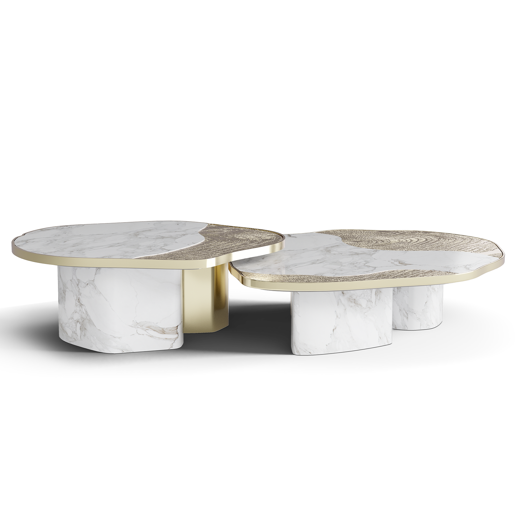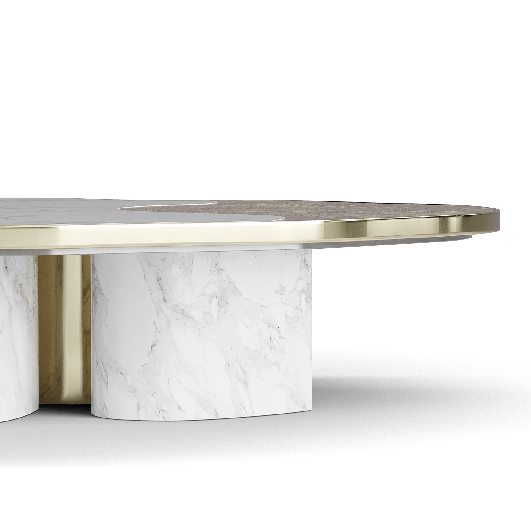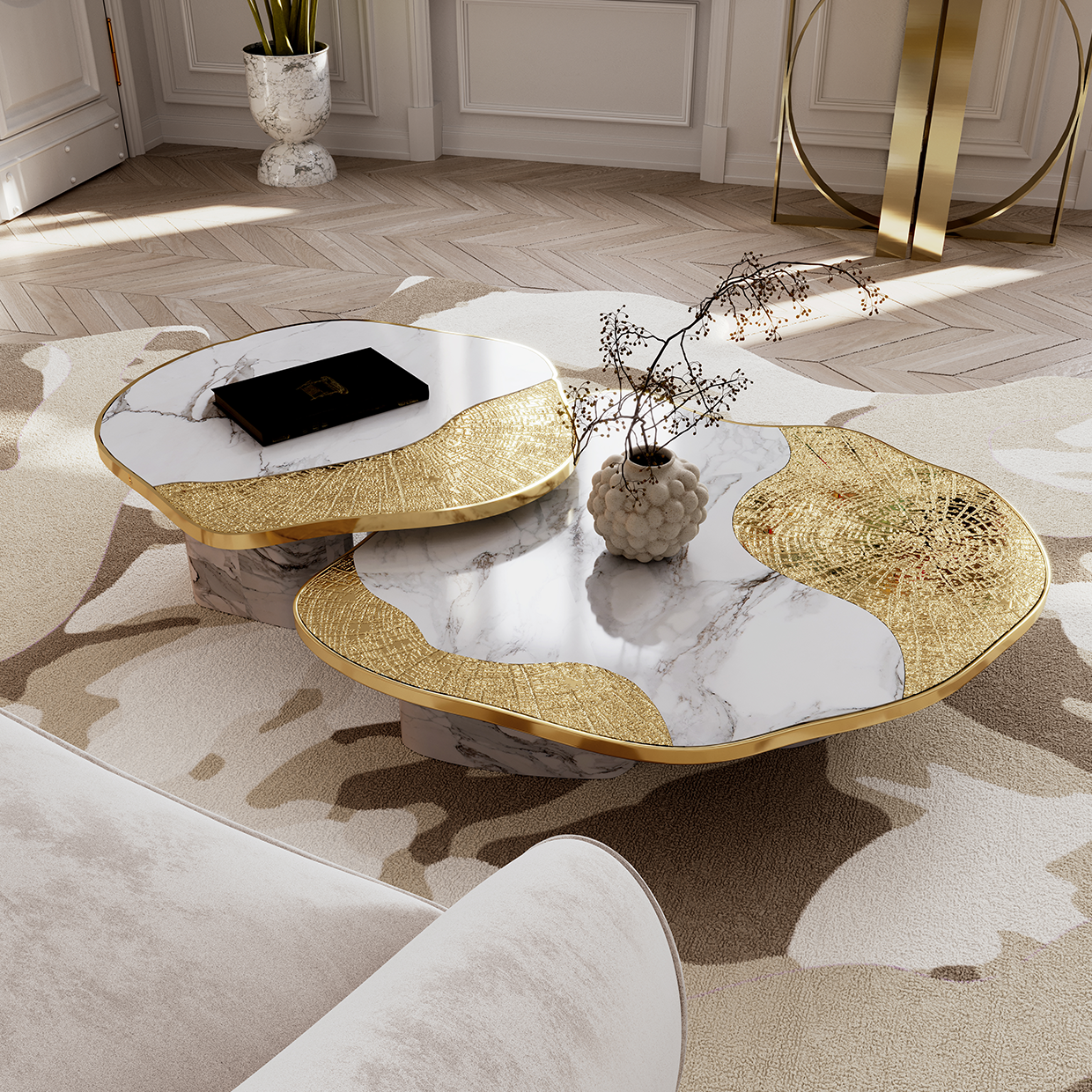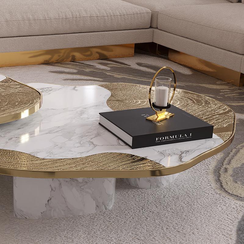 This luxurious natural marble countertop coffee table perfectly blends modern design with natural luxury materials. The delicate texture of natural marble, combined with the exquisite edges inlaid with brass, endows the space with infinite artistic temperament and exquisite style.