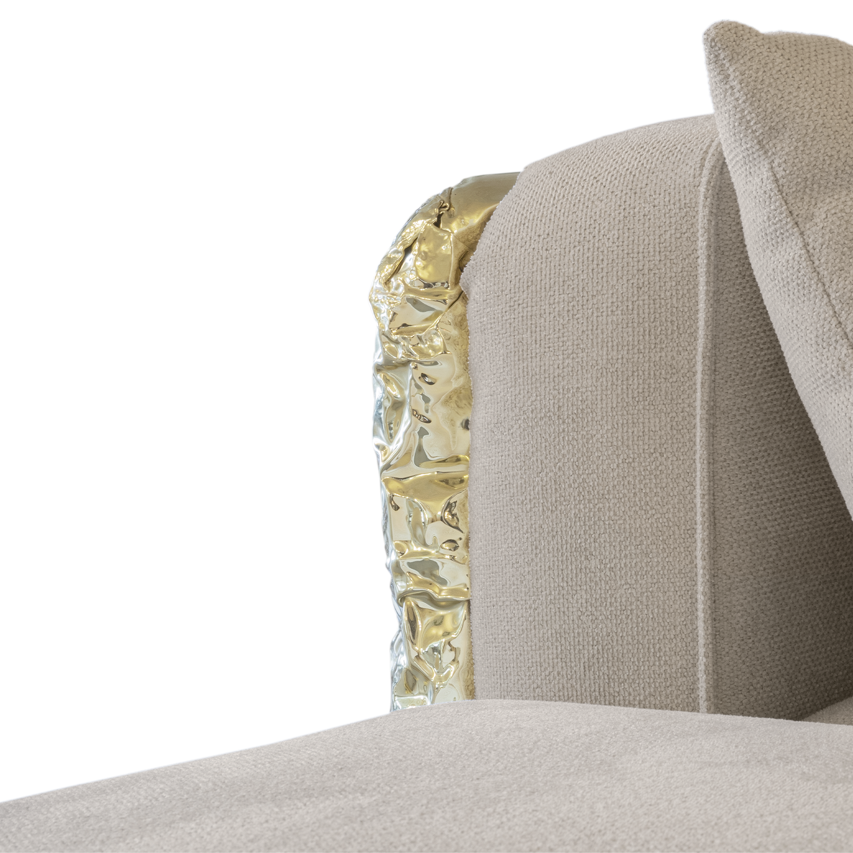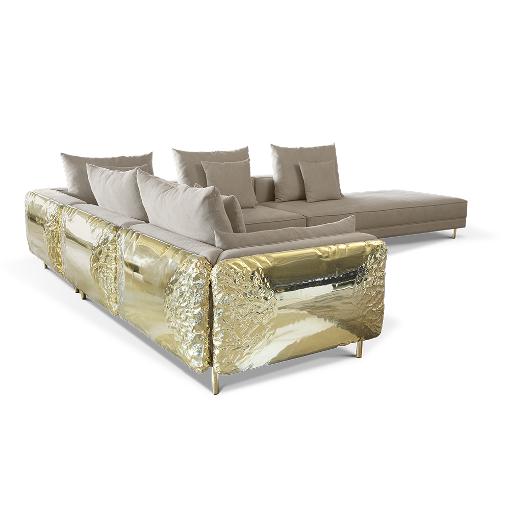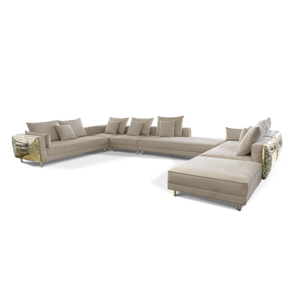 This modern luxury pure copper sofa features a base made of high-quality brass, shining brightly and showcasing its luxurious nature. U-shaped corner design, modular combination flexible and versatile, easily adaptable to various living room layouts. Seven spacious seats, paired with comfortable leather or fabric cushions, providing a soft touch and making sitting comfortable.