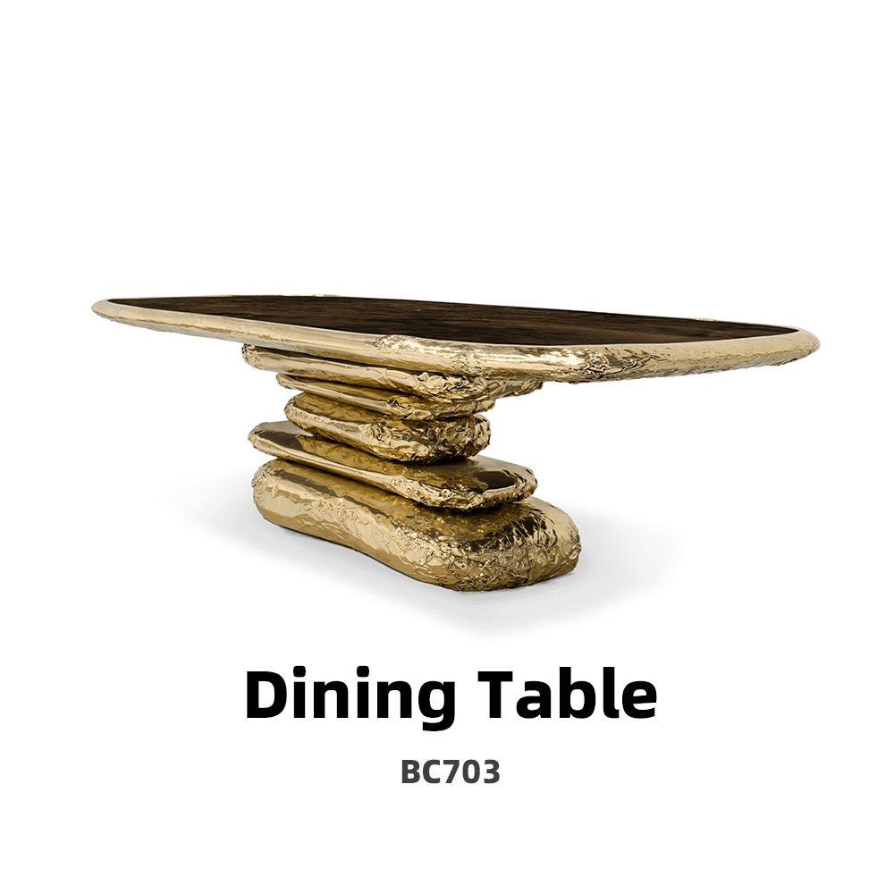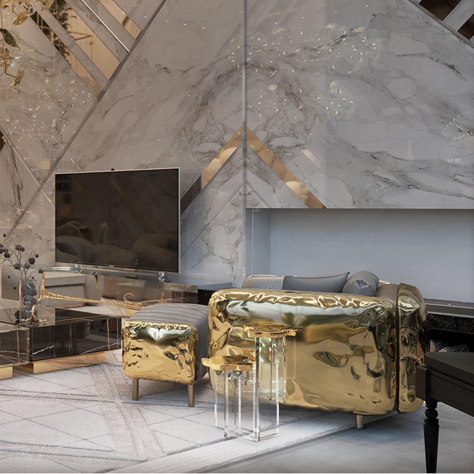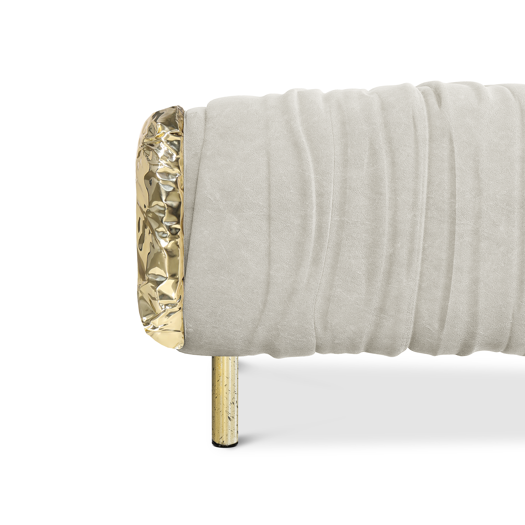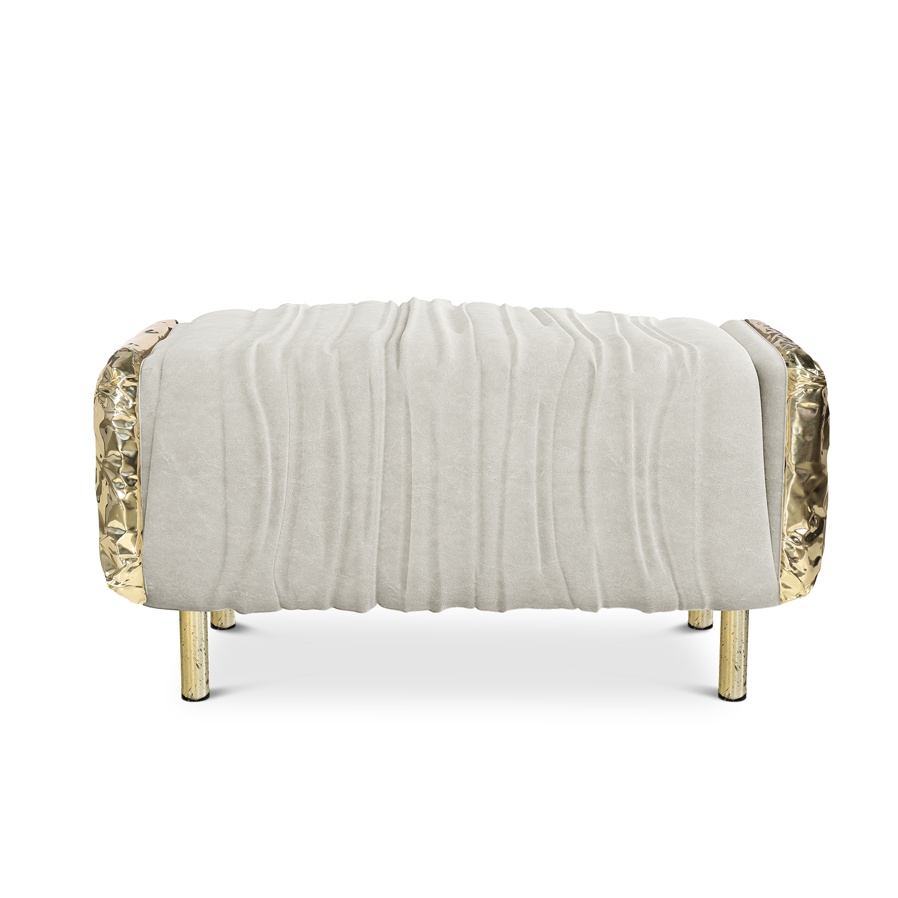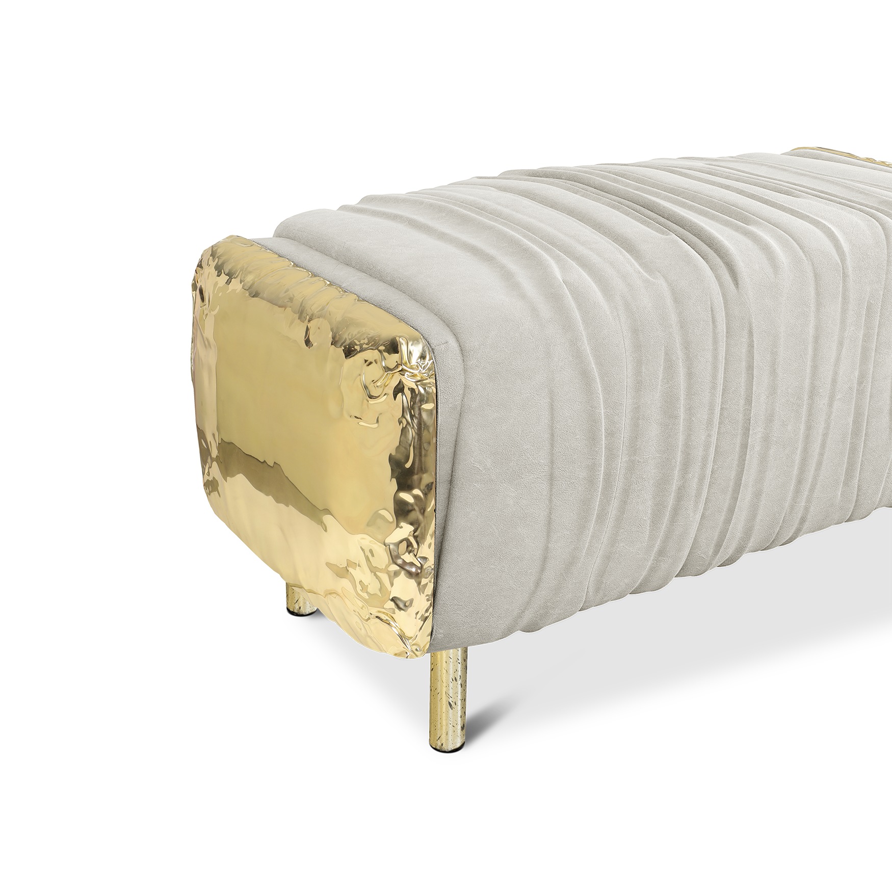 This bench cleverly blends brass and nubuck fabric materials, with a warm and soft pleated leather surface and shiny brass legs. The design exudes modern luxury and adds an elegant and tranquil beauty to the living room.