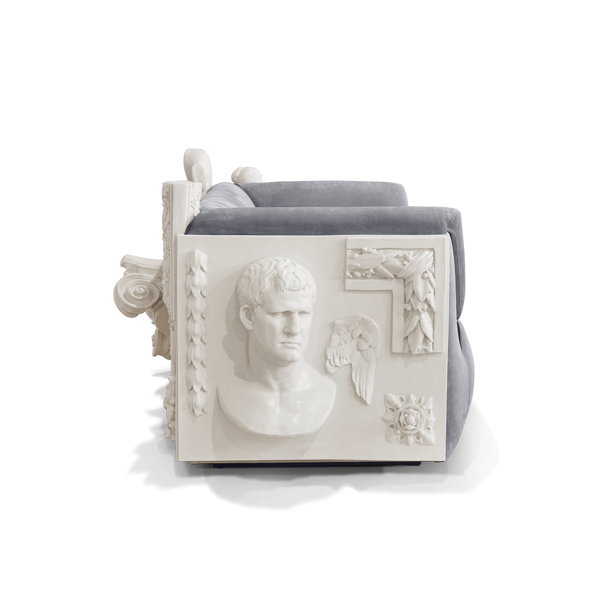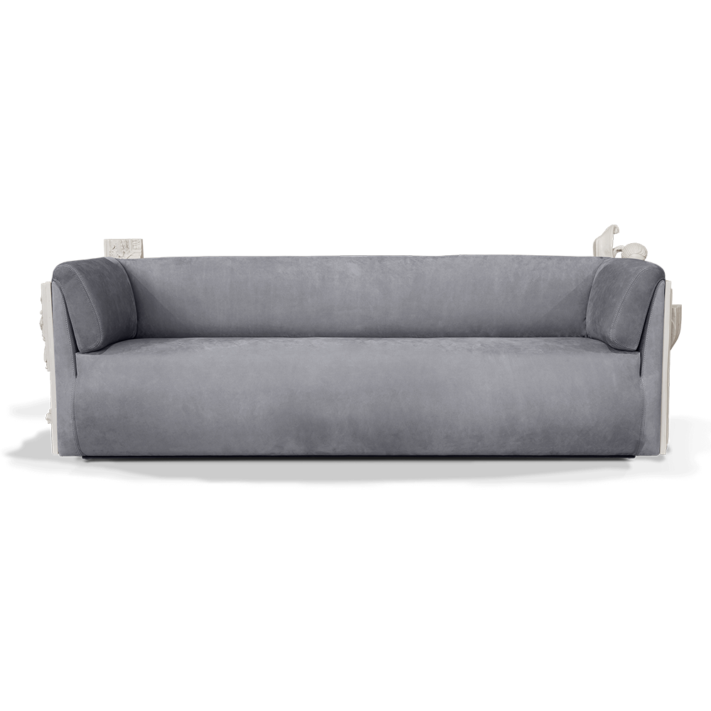 This high-end Italian designed solid wood frame sofa blends modern and classical charm. Selected gray nubuck fabric with soft texture and elegant color, adding a touch of understated luxury to the living room. The relief art decoration at the armrest showcases exquisite details and extraordinary taste. Solid wood frame is stable and durable, carrying comfort and quality.