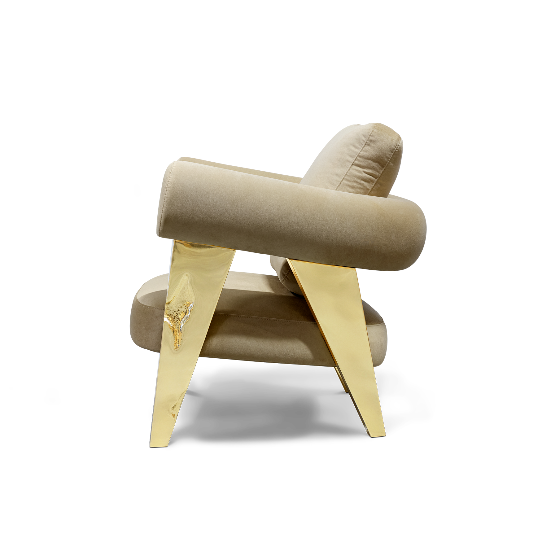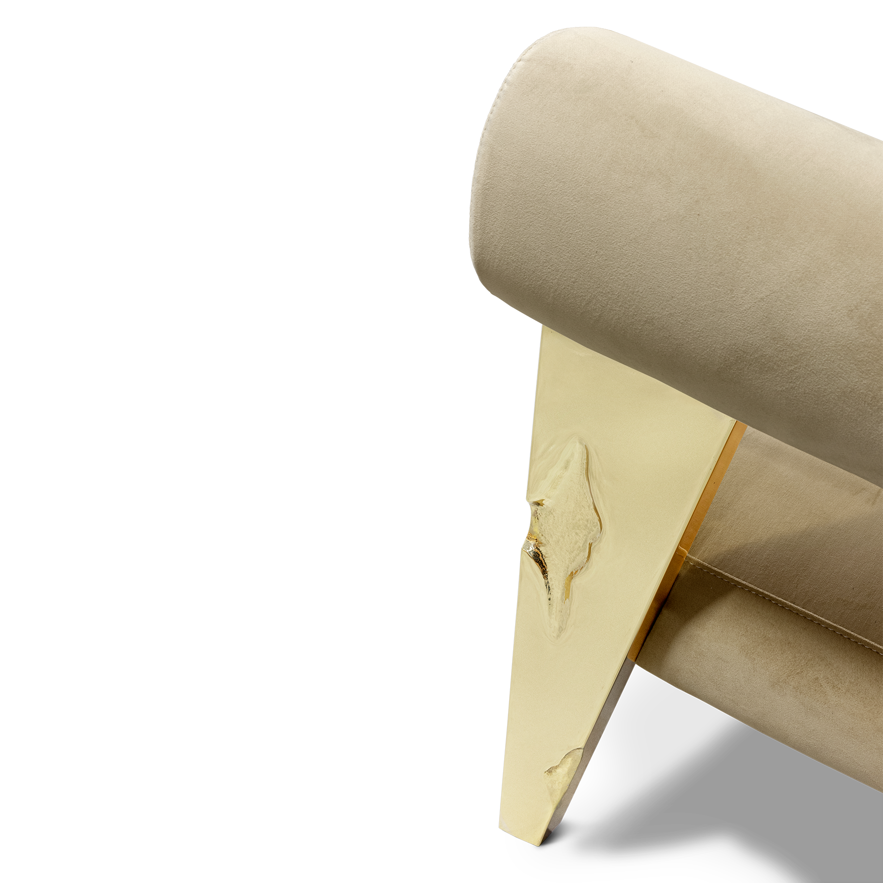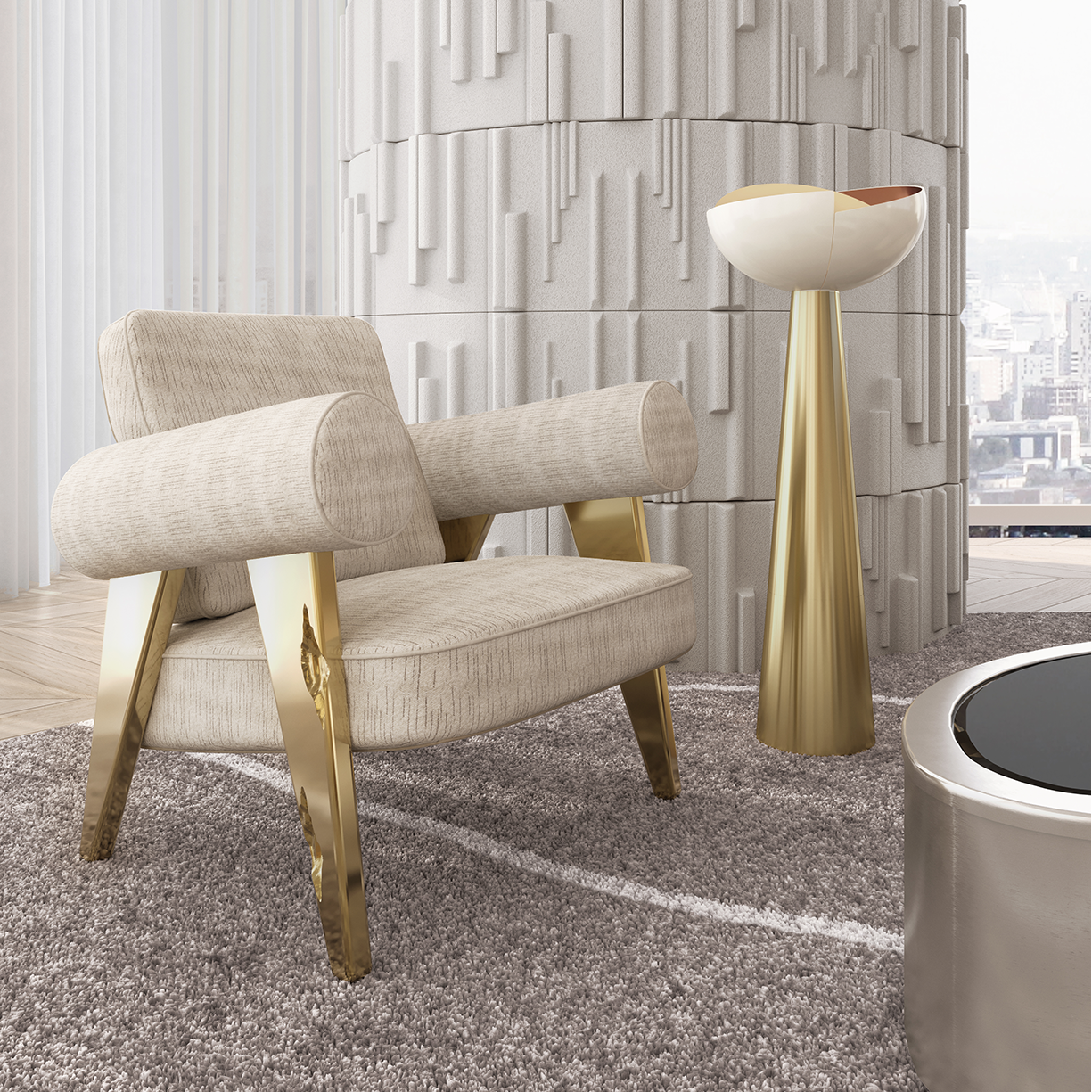 This modern luxury living room lounge chair perfectly embodies the aesthetic concept of contemporary high-end home furnishings with a simple and elegant design language. The brass base has smooth lines and reflects a warm luster; High quality fabrics have a flexible touch and provide the ultimate comfort experience.