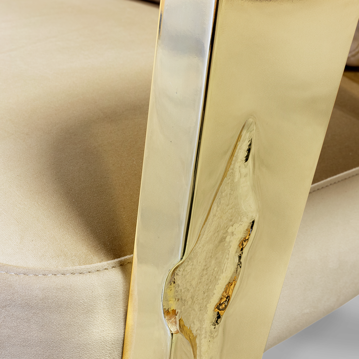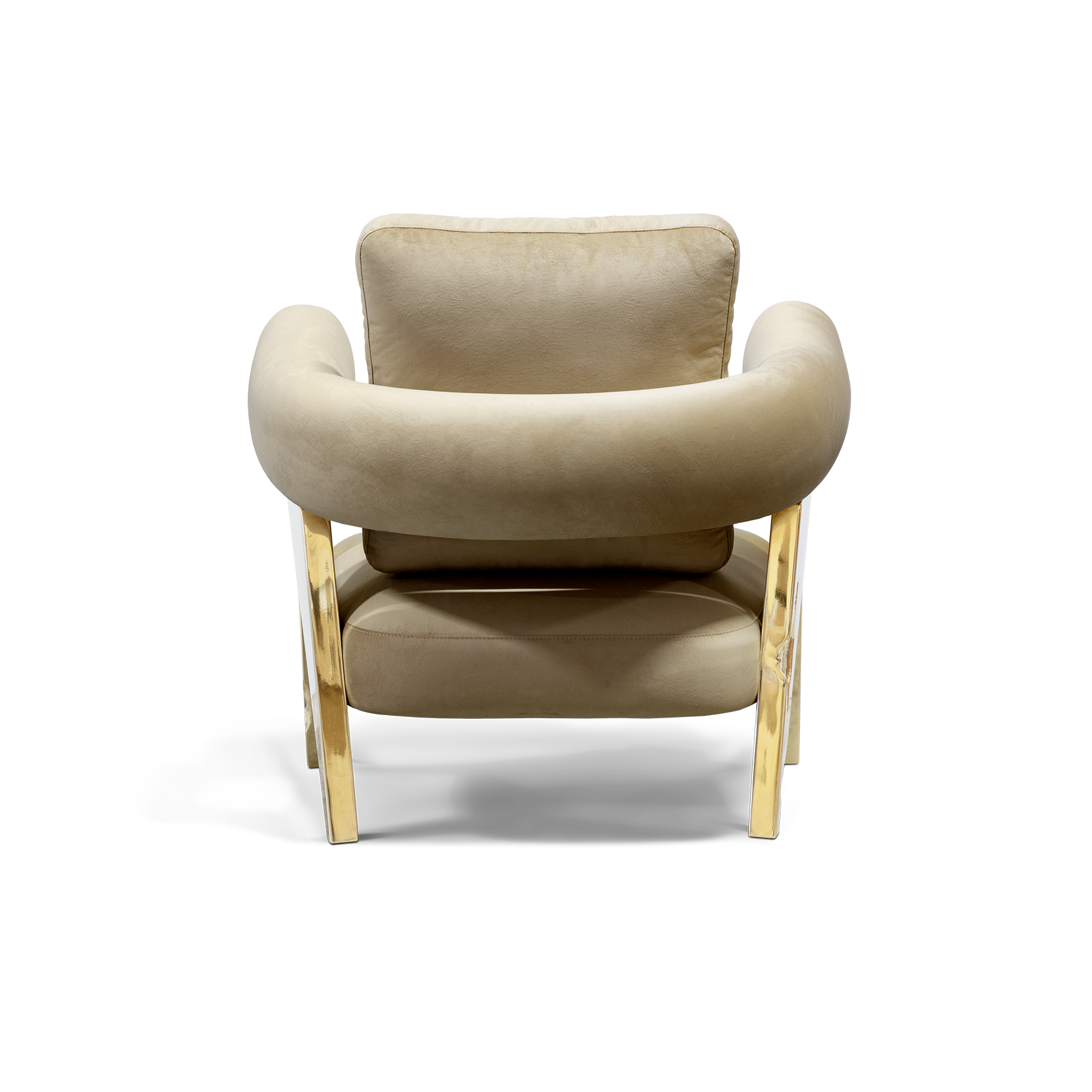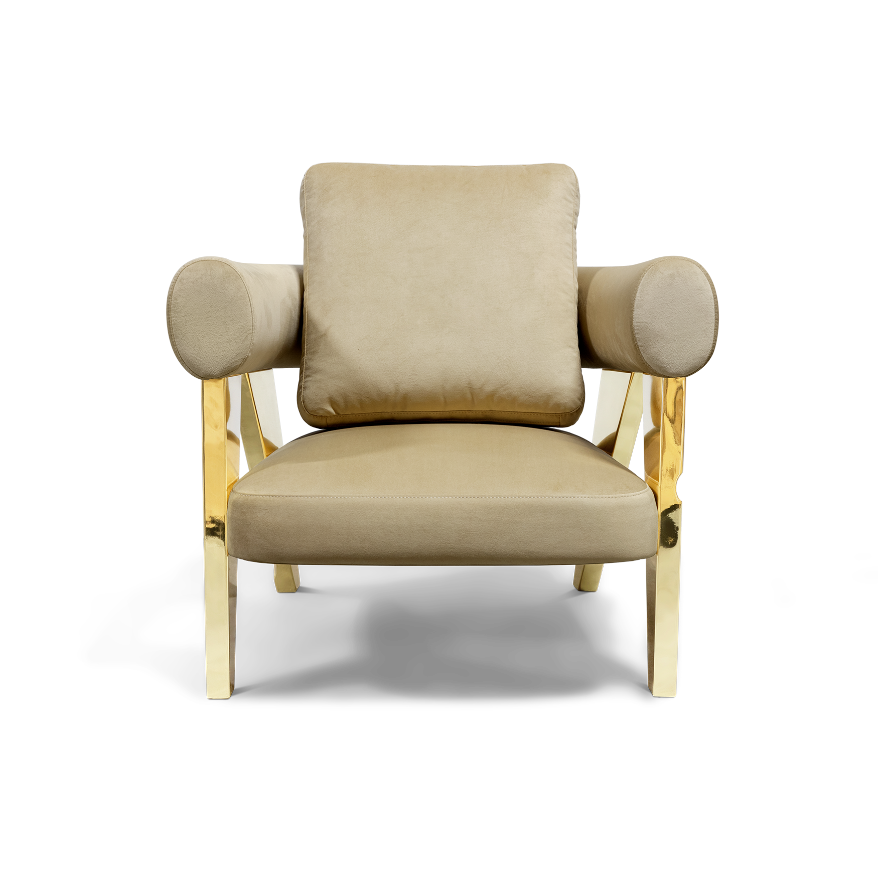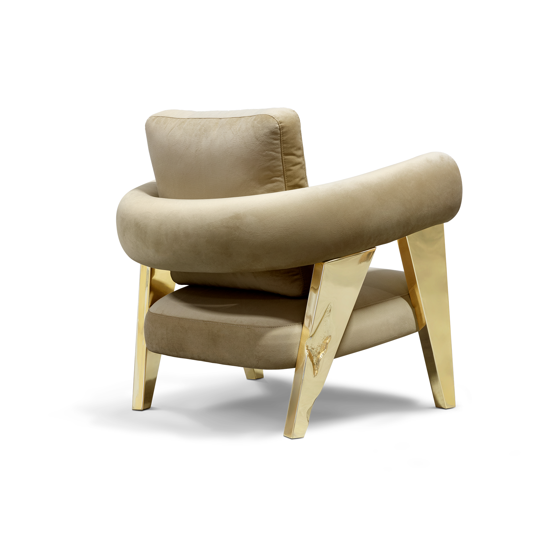 This modern luxury living room lounge chair perfectly embodies the aesthetic concept of contemporary high-end home furnishings with a simple and elegant design language. The brass base has smooth lines and reflects a warm luster; High quality fabrics have a flexible touch and provide the ultimate comfort experience.