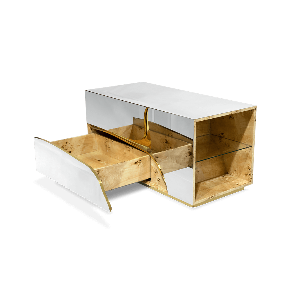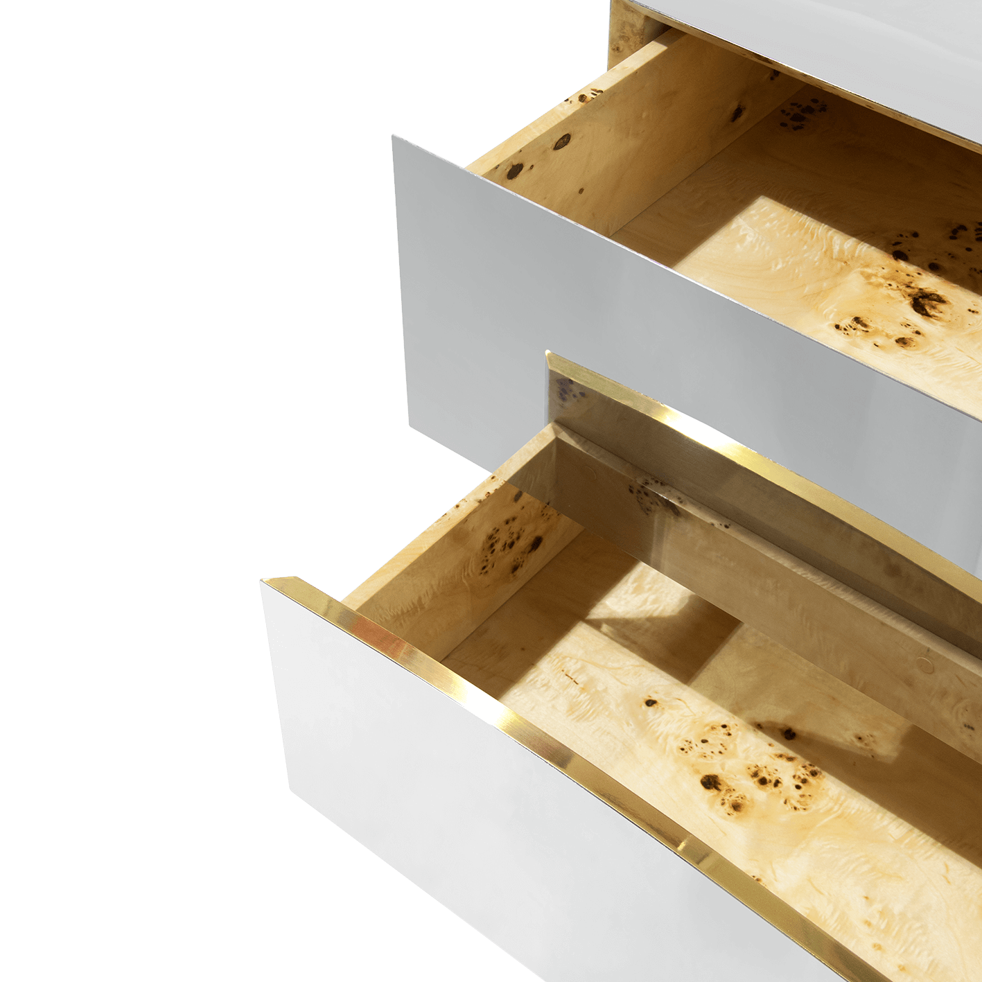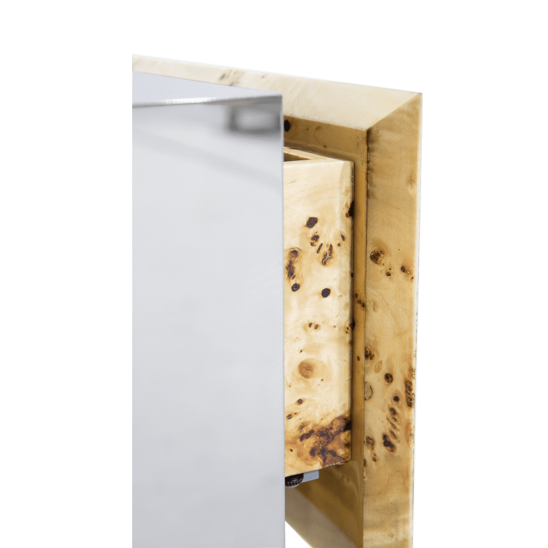 This bedside table is covered with mirror stainless steel, shining brightly and injecting a modern luxury atmosphere into the bedroom; The solid wood material inside is warm and simple, highlighting the beauty of nature in the details. Between opening and closing, the mirror and solid wood complement each other.