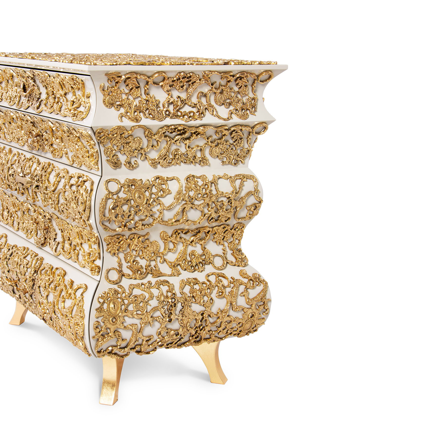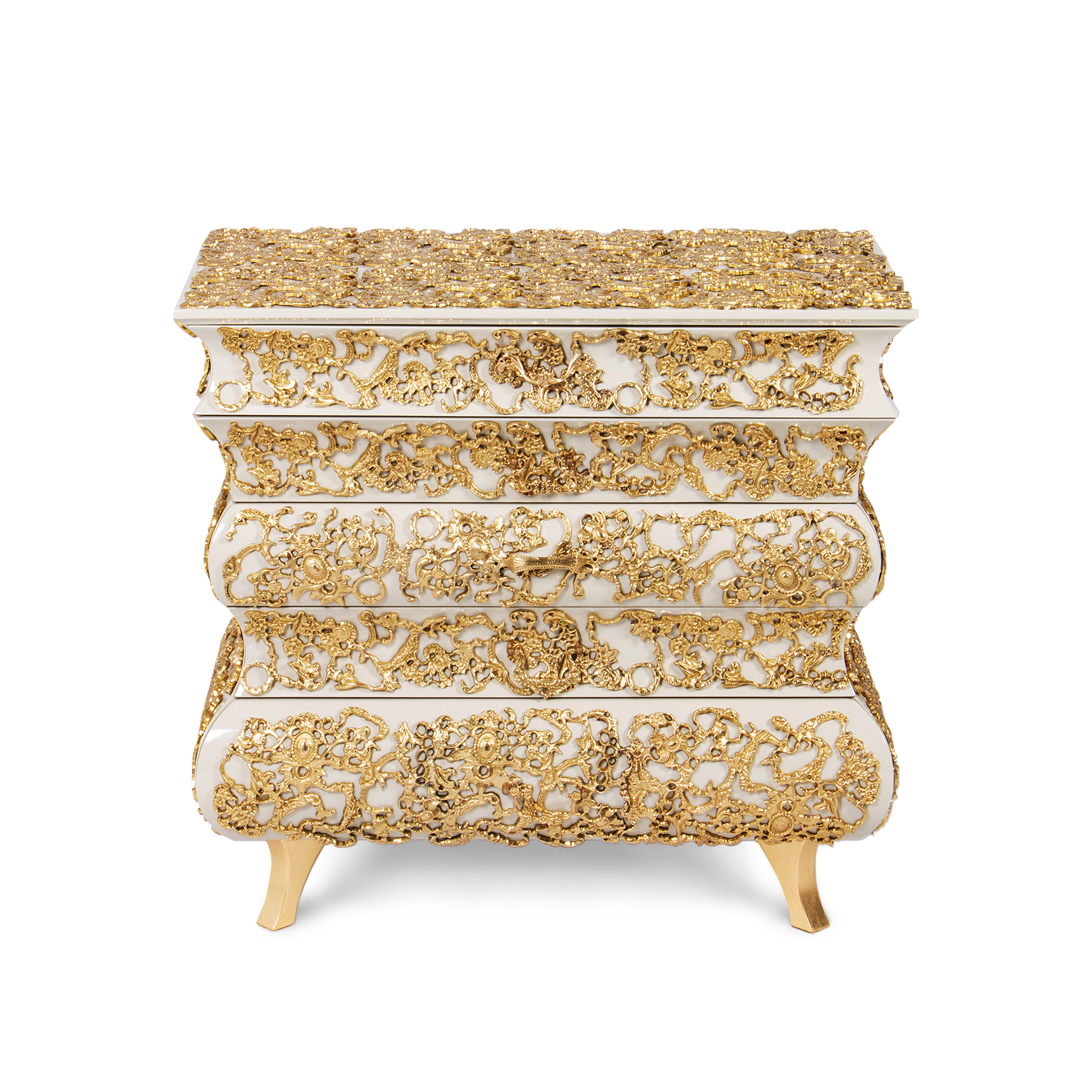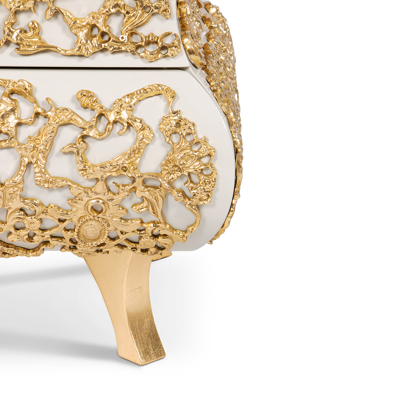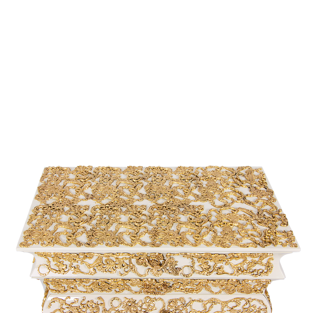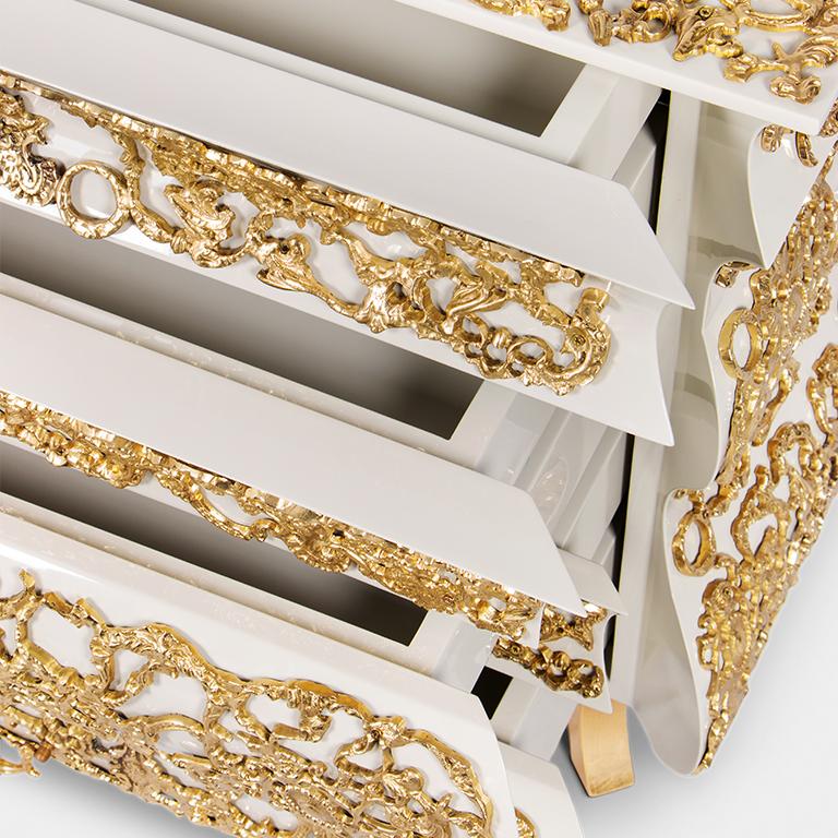 This bedside table features a luxurious white and gold color scheme, with each drawer adorned with exquisite gold patterns, showcasing luxury and art. Its unique design style blends classical and modern elements, adding a sense of nobility and elegance to the bedroom. Every detail is like a flowing golden painting, telling the delicacy and romance of life.