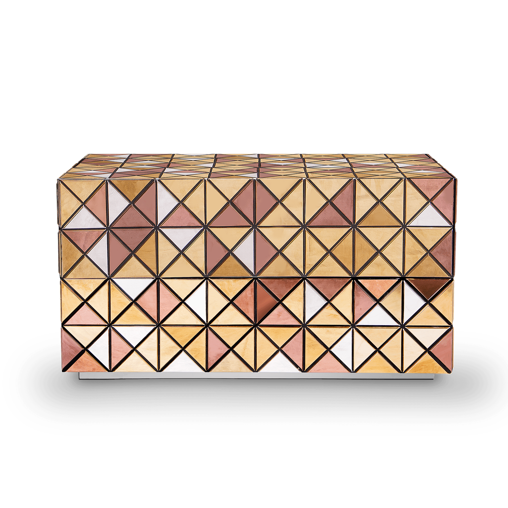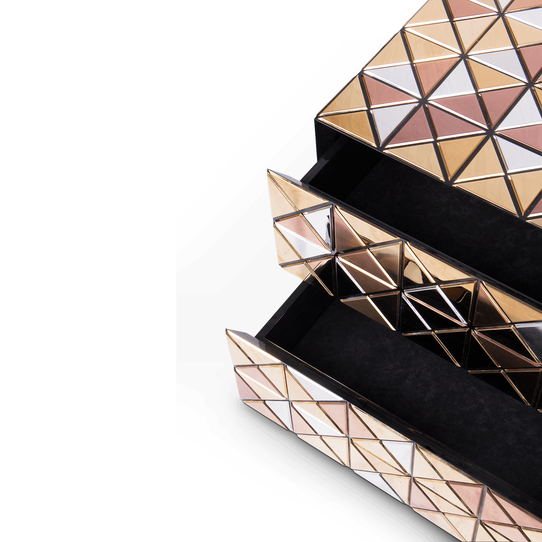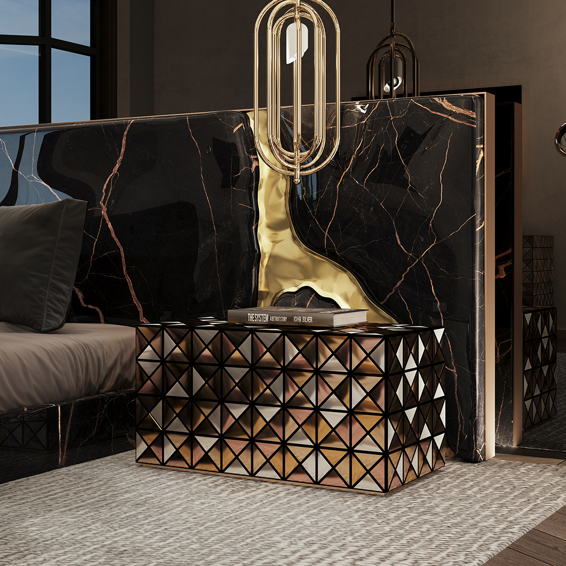 This bedside table is like a modern art sculpture, capturing the flow of light with a multi-faceted geometric mirror design and projecting colorful light and shadow effects. Its unique three-dimensional cutting process, combined with the splicing of metallic colors, presents an avant-garde and luxurious visual impact. The perfect fusion of practicality and art injects a sense of futurism and fashion into the bedroom, becoming the focal point of home space.