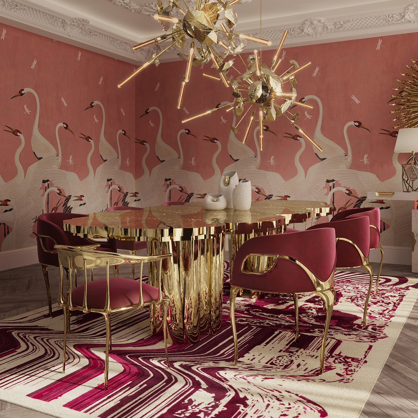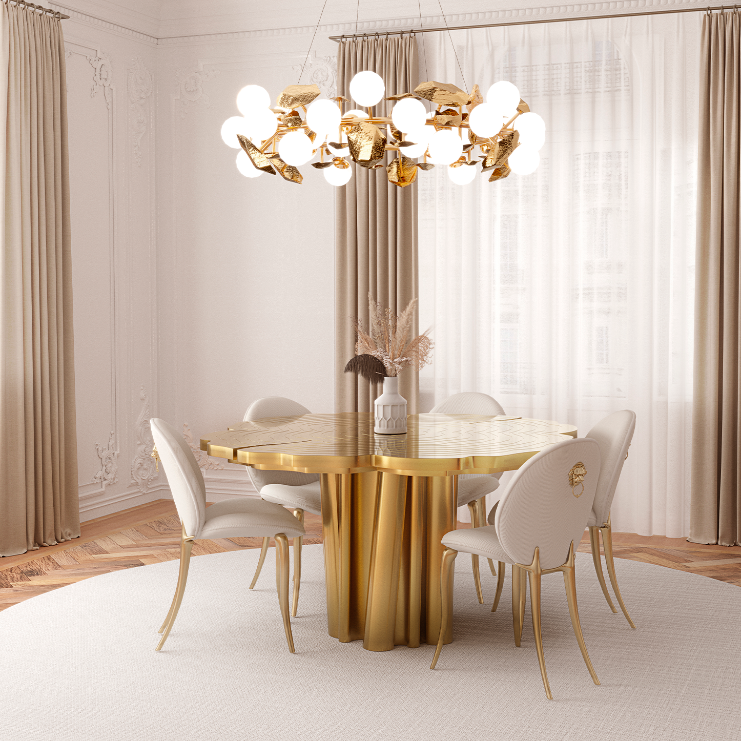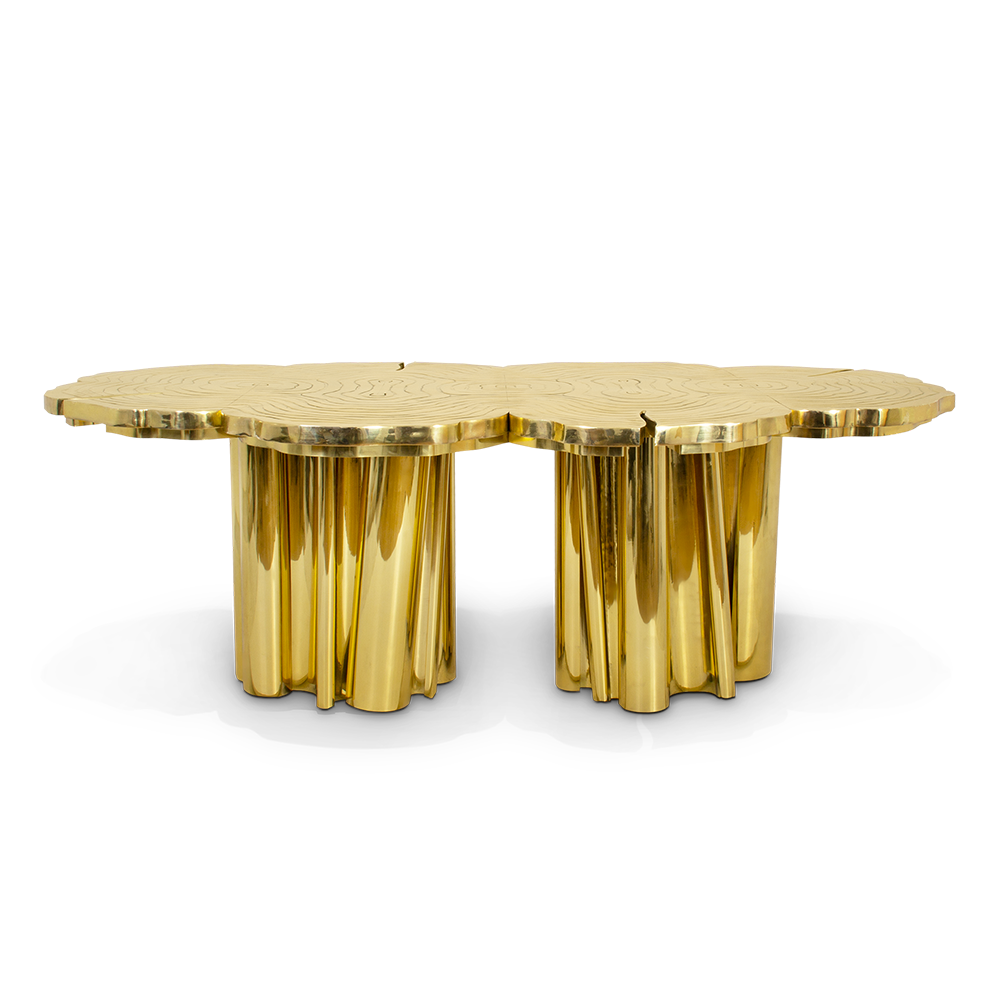 This irregular stump designed brass dining table perfectly blends luxury and nature. The luster of golden brass, combined with the unique design of irregular tree stumps, creates a collision of luxury and nature, injecting soul into your space. Drawing inspiration from Italian design, infuse the soul of luxury into extraordinary dining experiences with timeless charm.