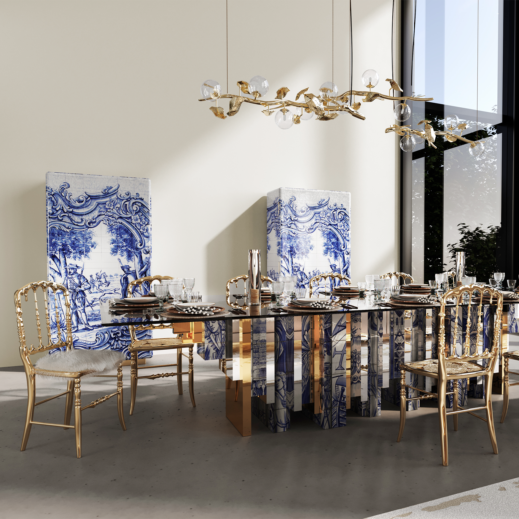This Italian luxury dining table blends modern and classical flavors. The tempered glass tabletop is crystal clear, paired with a brass base, sturdy and durable, with a strong sense of modernity. Hand drawn patterns add an artistic touch to the dining table, making it feel like a delicate piece of art.