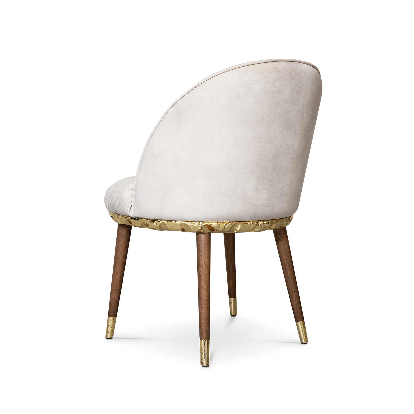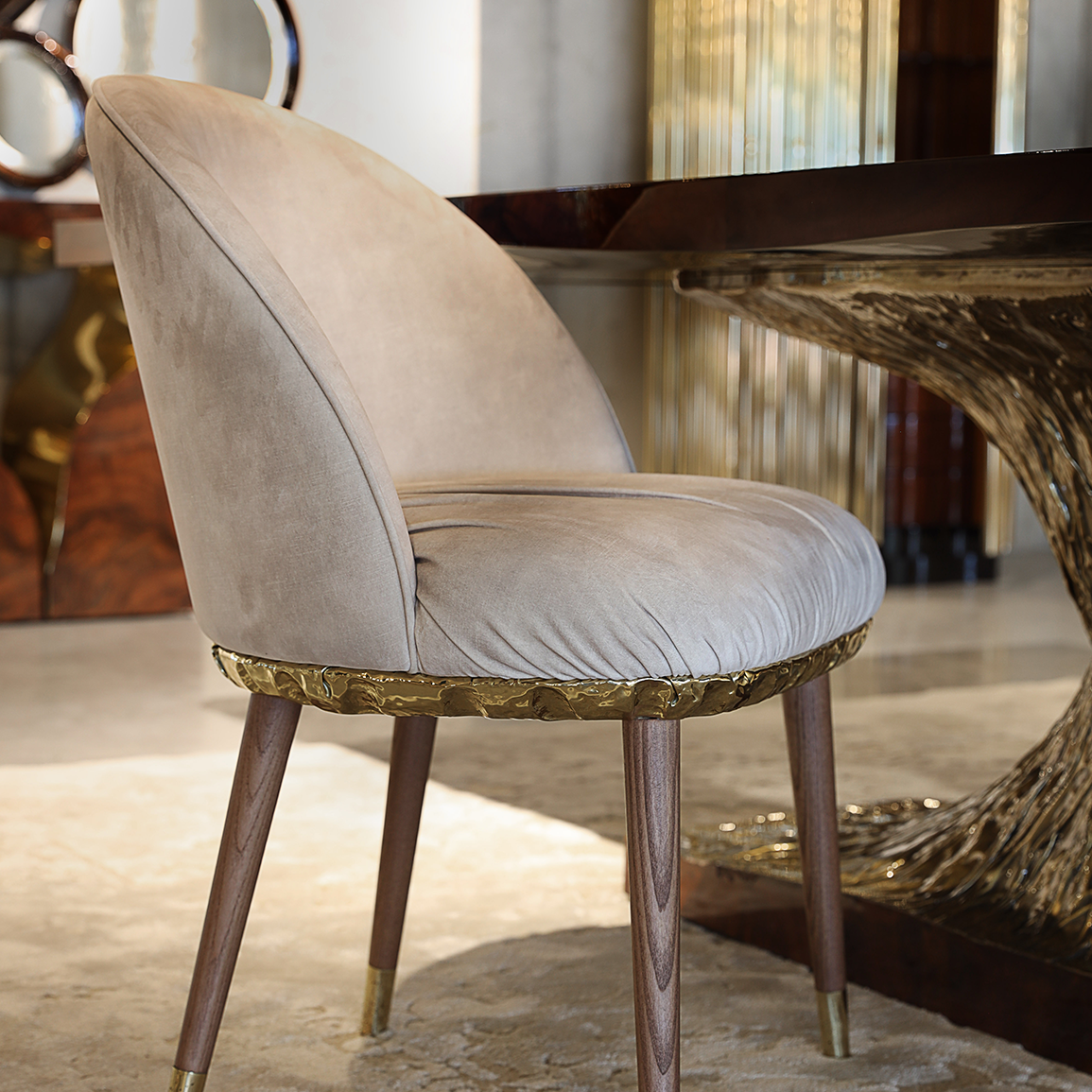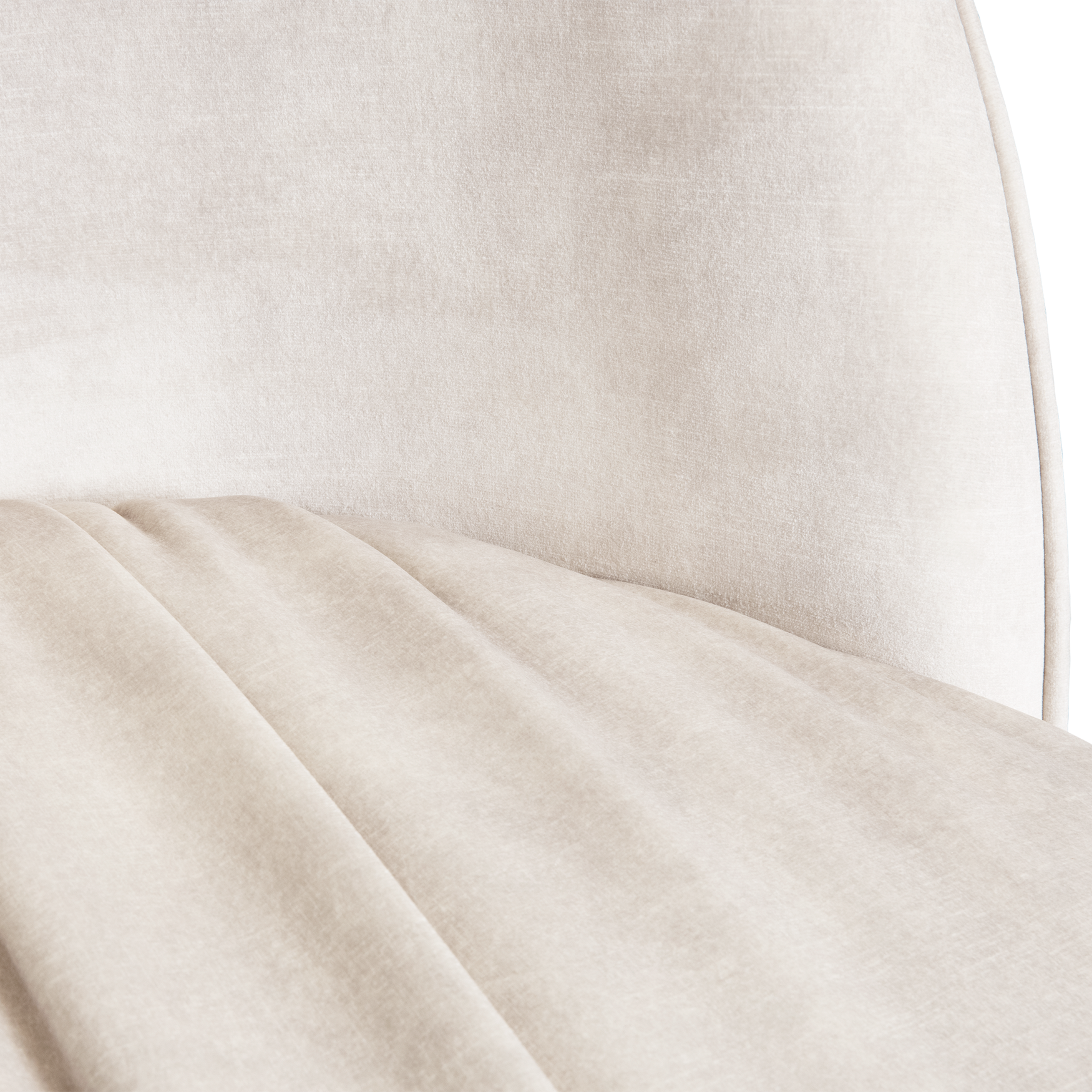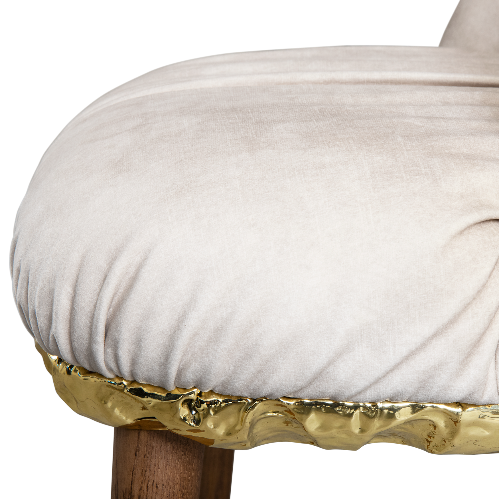 This chair is made of beige nubuck fabric with brass elements. The backrest and seat are thick and full, with natural sagging on both sides of the backrest, forming a unique shape. The beige nubuck fabric feels comfortable to the touch and visually warm and soft; The chair legs and decorative strips are made of brass material, with a warm color and smooth lines.