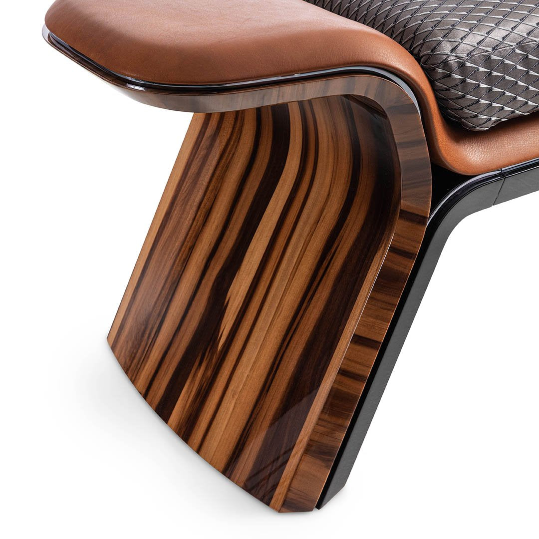 This bench combines strength and smooth curves, with a three-layer structure: a curved wood outer layer with a choice of glossy black paint or various veneer materials, a gun gray metal outline in the middle layer, and an inner layer covered with leather. Its design is flexible in thickness, combining ultimate comfort and striking beauty.