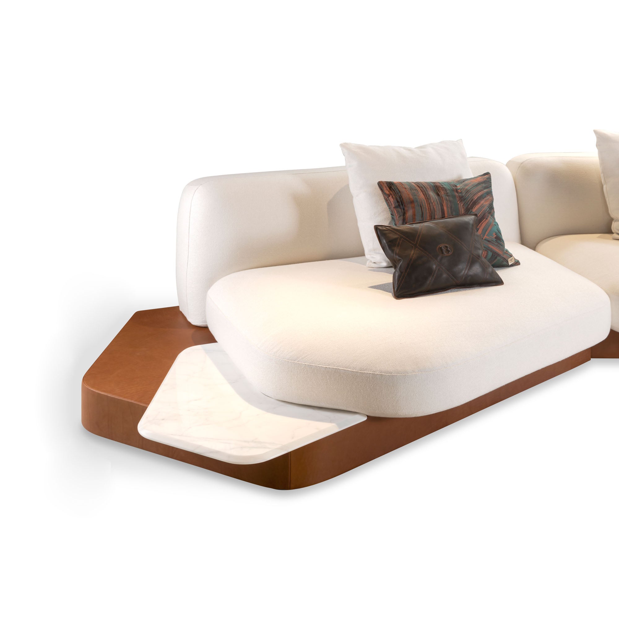 This modular sofa features sculptural smooth lines and organic forms. The suspended seat cushion paired with a lightweight built-in side table creates a distinct layering, showcasing the inspiration of automotive design. The backrest tilts gently, revealing a soft colored cushion. Adopting a unique open texture veneer process, showcasing a luxurious taste.