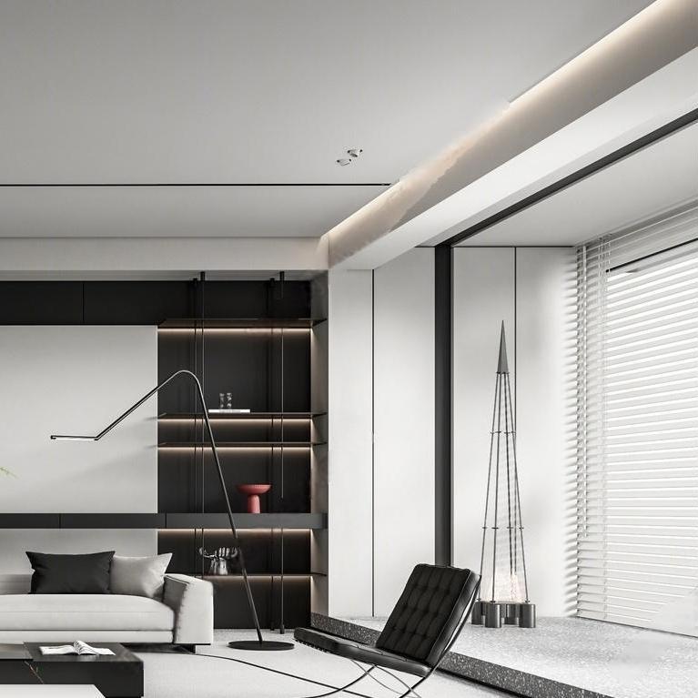 This TV wall panel design is simple yet elegant, with black and white as the main color scheme, paired with light wooden textures, creating a modern minimalist living room space. The embedded screen area features a dark background that contrasts sharply with the surrounding light tones, highlighting the visual focus. The wall decoration is embellished with abstract artistic patterns to add artistic atmosphere.