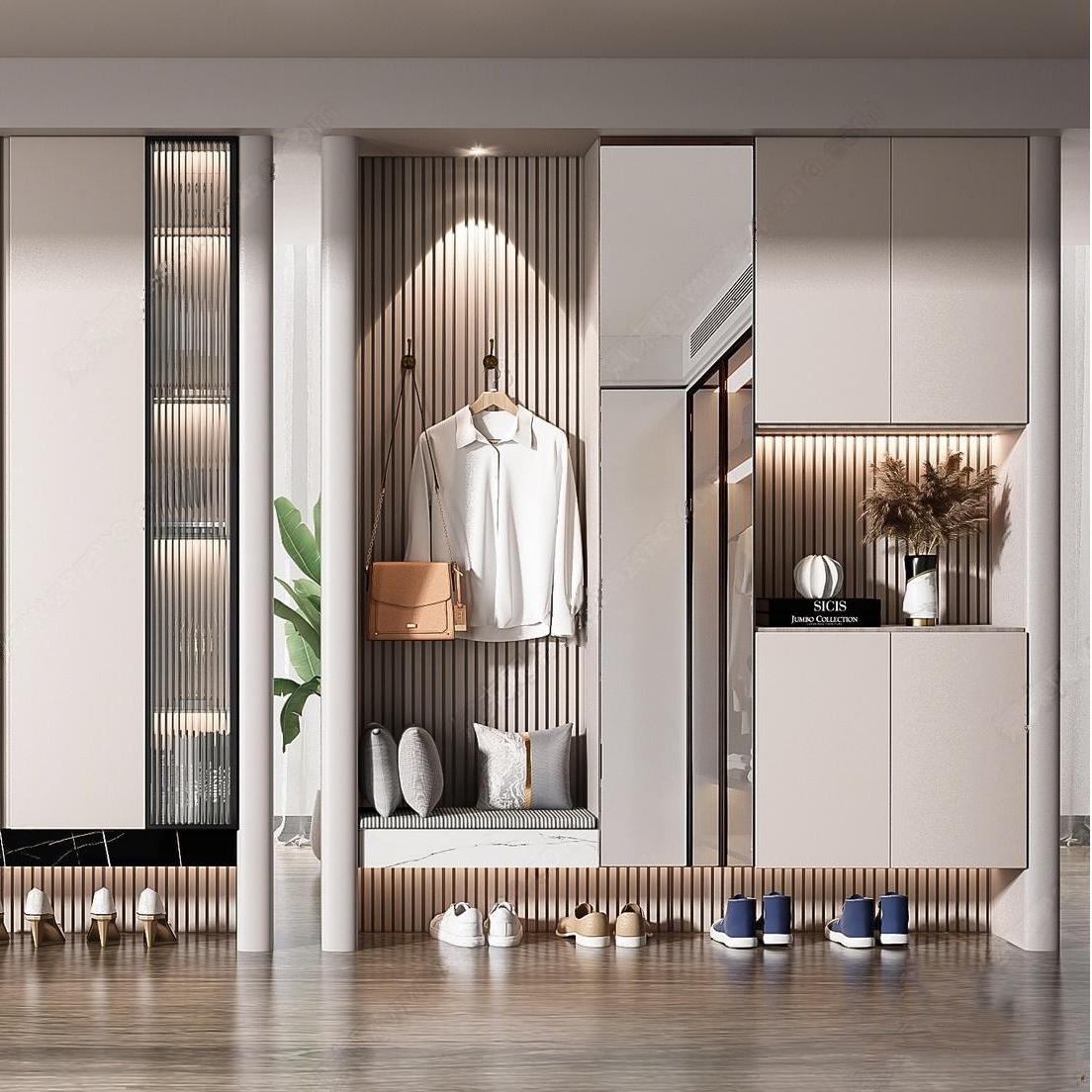 This storage cabinet adopts a modern minimalist style, with a fully functional cabinet design that includes a full-length mirror, open shelves, and closed cabinet doors, meeting the storage needs of shoes, jackets, and accessories, while also facilitating grooming. Embedded light strip design provides soft lighting, enhancing the warmth and hierarchy of the space.
