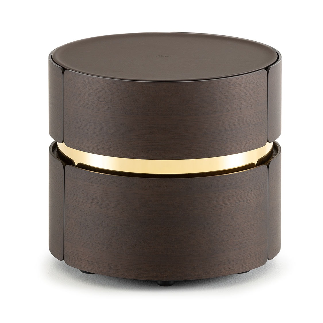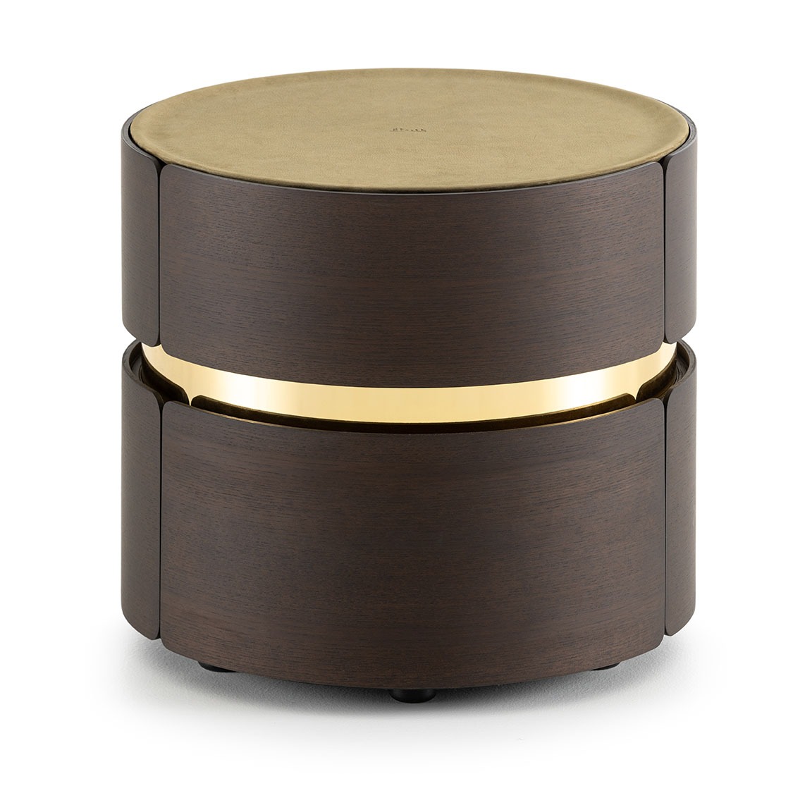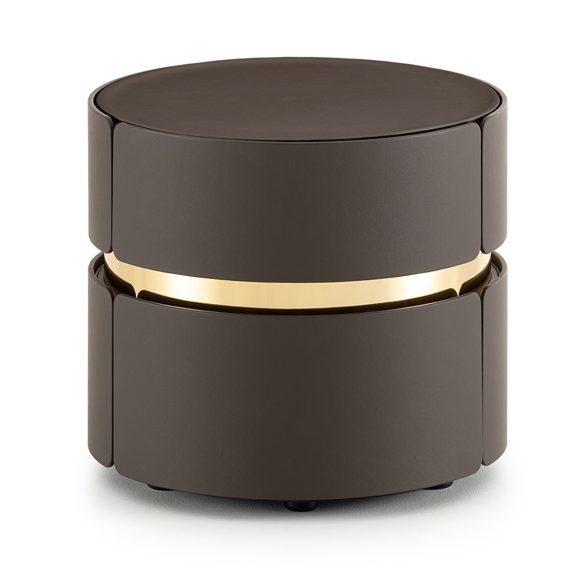 This bedside table perfectly blends modern art with practical functionality. The cylindrical metal cabinet, paired with a marble countertop, has both a light luxury texture and stability. The golden decorative strip adds a touch of refinement and elegance, making it the finishing touch in the bedroom.