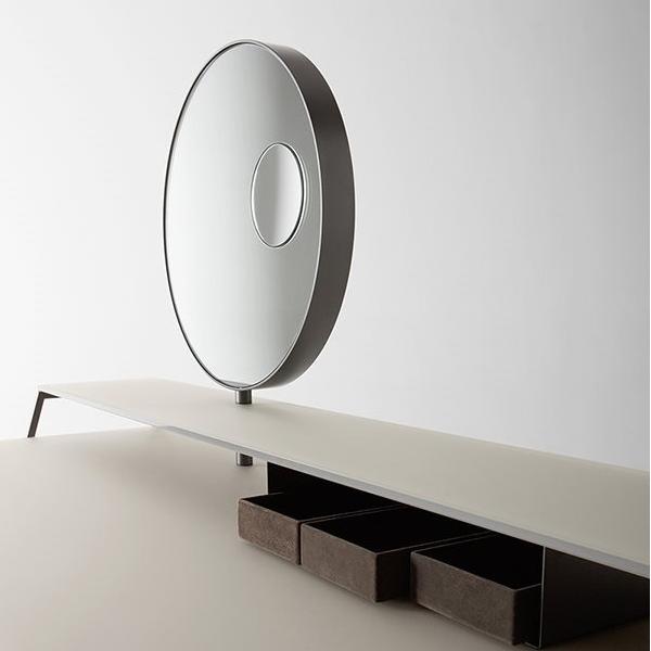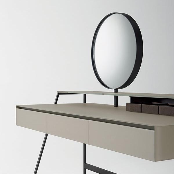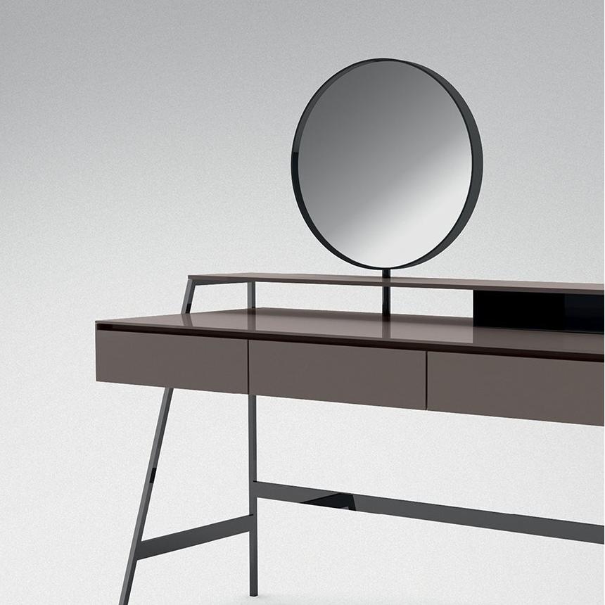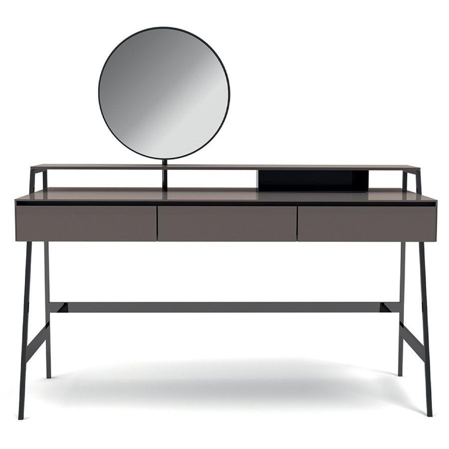This modern minimalist dressing table features a dark grey metal frame and glass countertop. The countertop is spacious and can accommodate various cosmetics and skincare products. The two drawers below provide ample storage space for organizing daily needs. Slim metal leg design, stable and space saving, suitable for use in bedrooms or makeup areas.