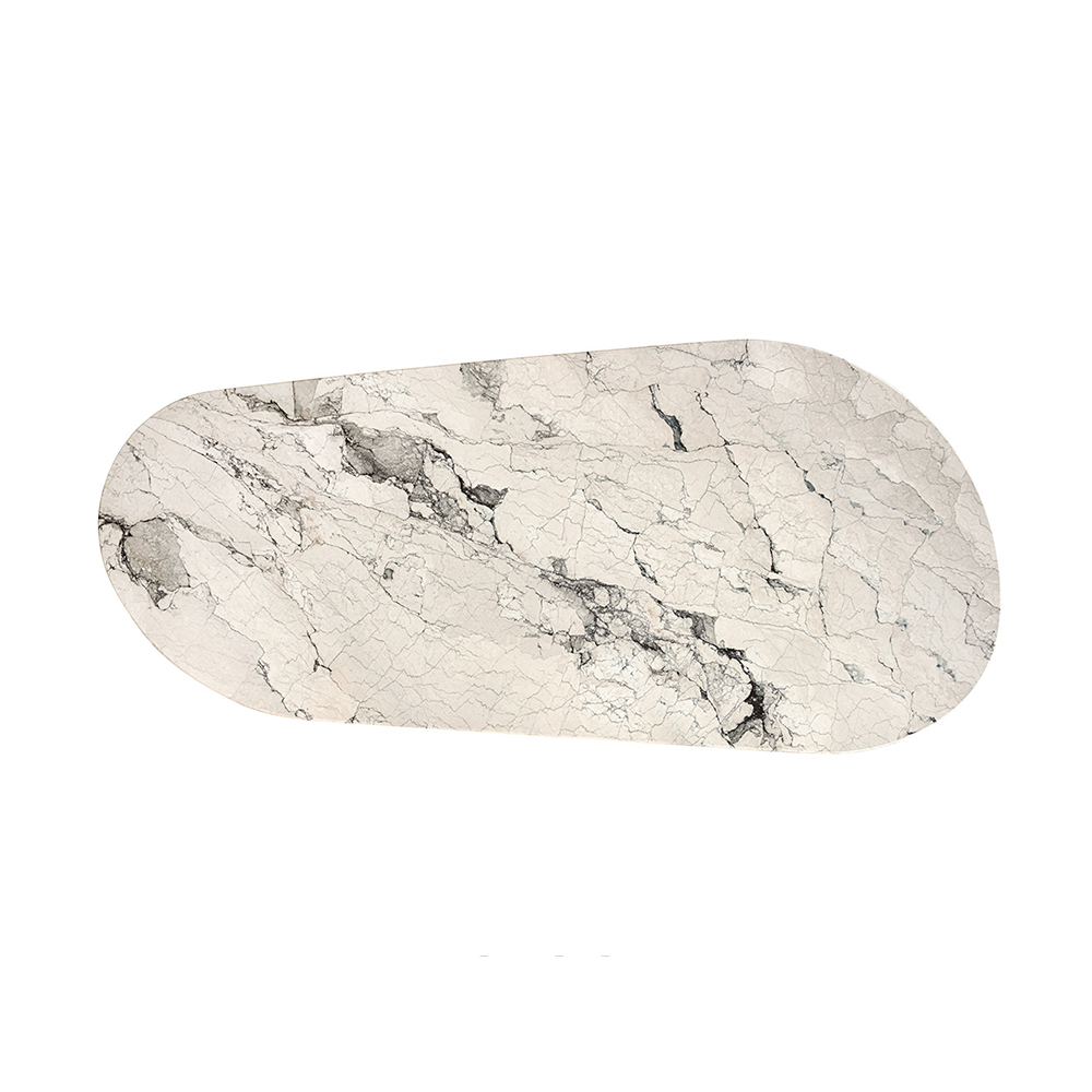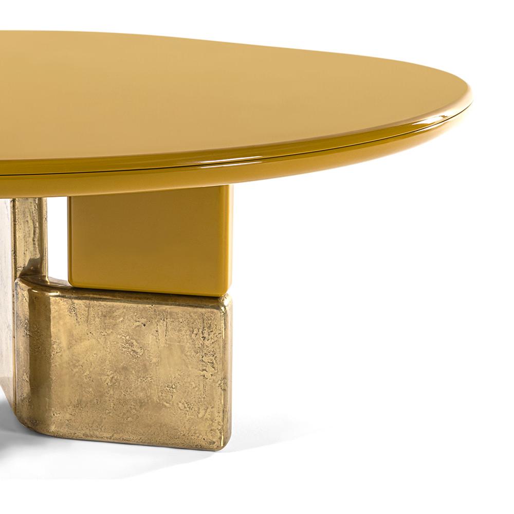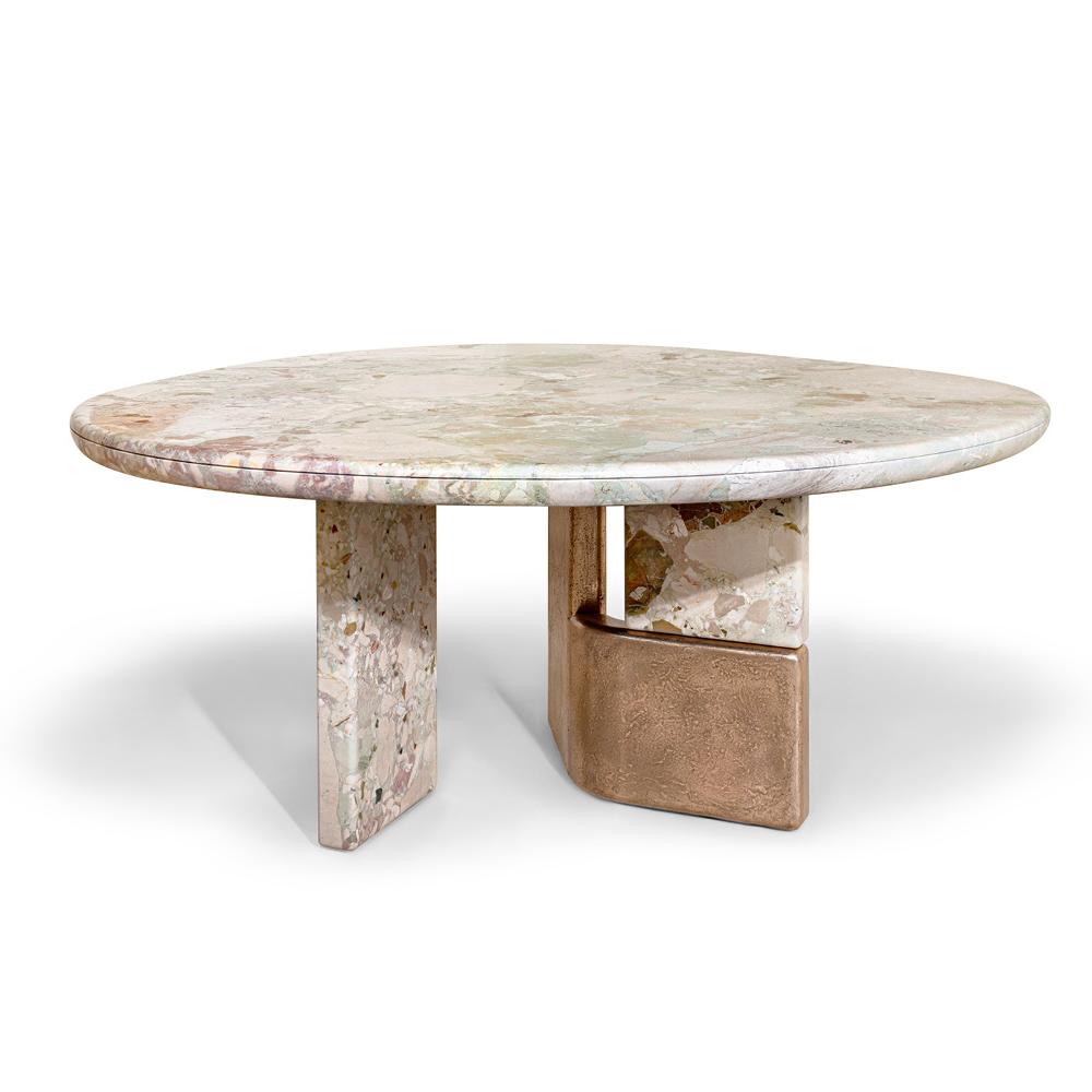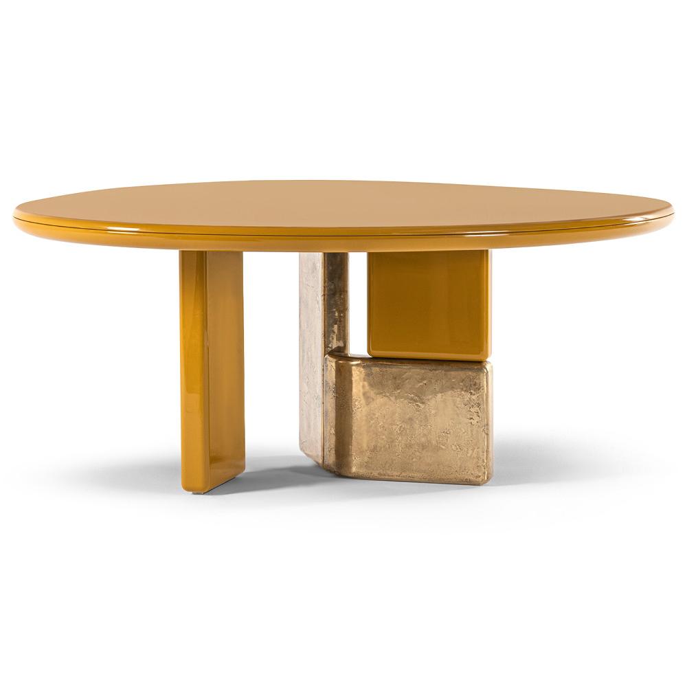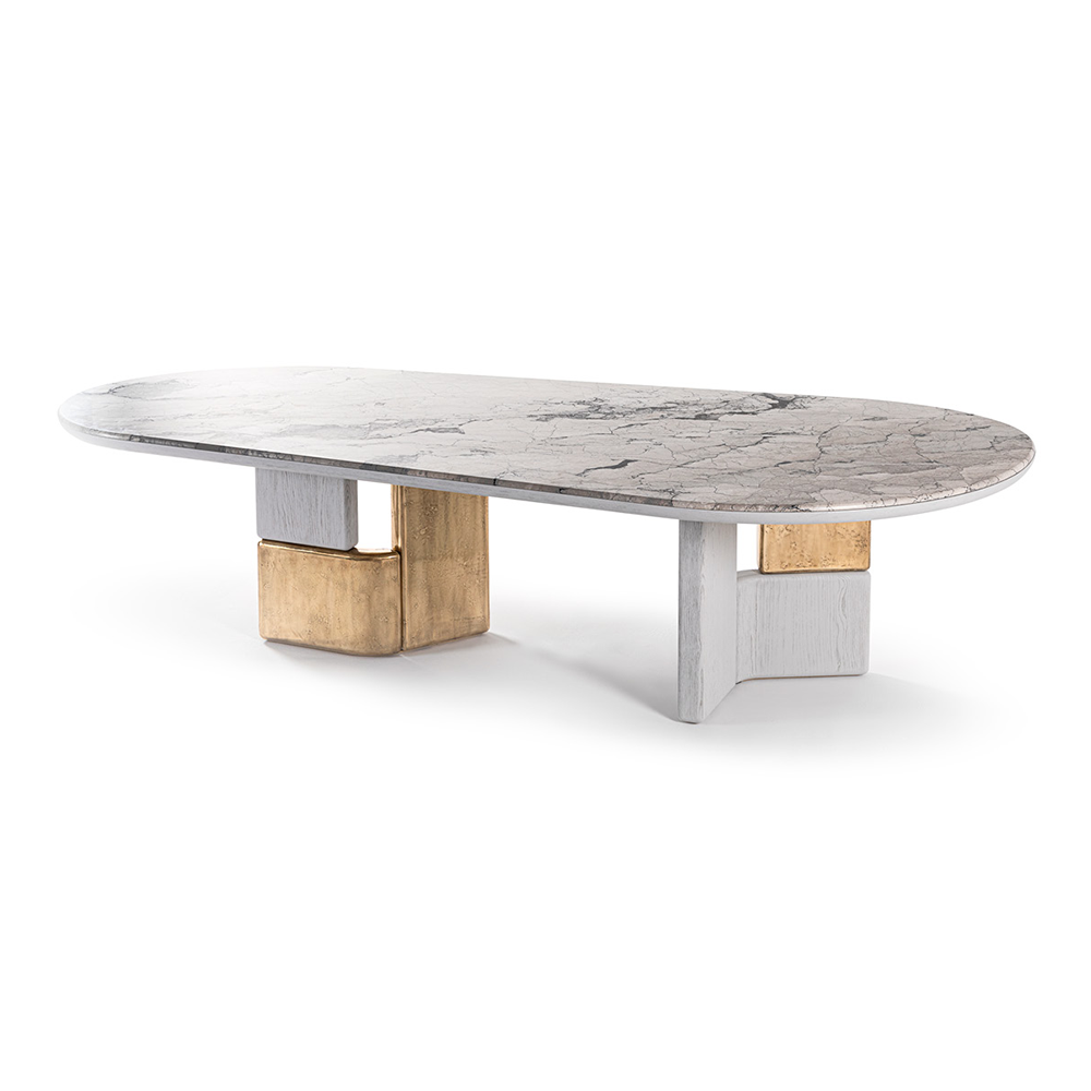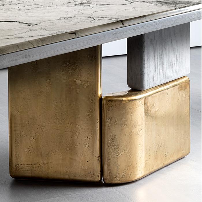 The design inspiration for this dining table comes from the "ovoo" stone piles in Mongolia, which are often used as landmarks on mountain tops. This series combines lacquer wood or grey wood components, embellished with bronze castings, echoing Mongolia's natural worship and cultural symbols.