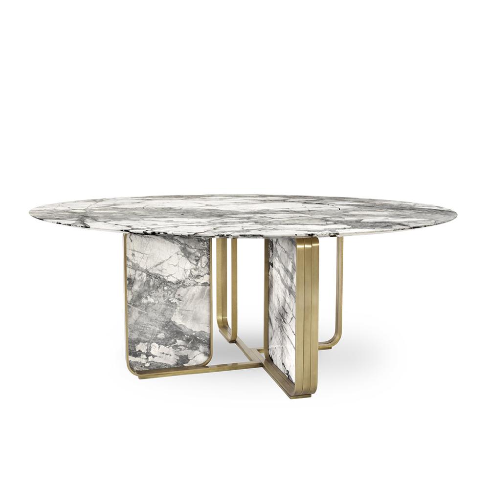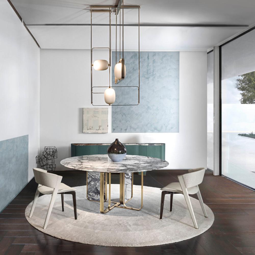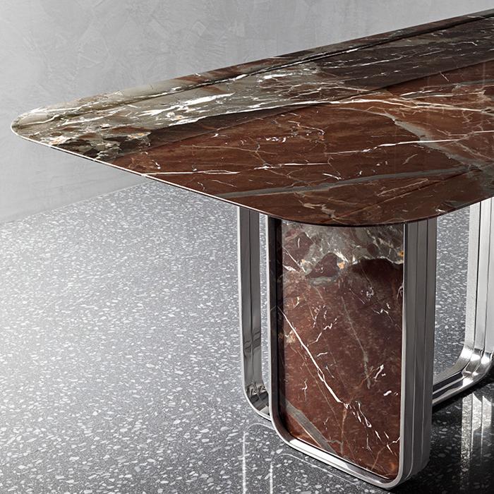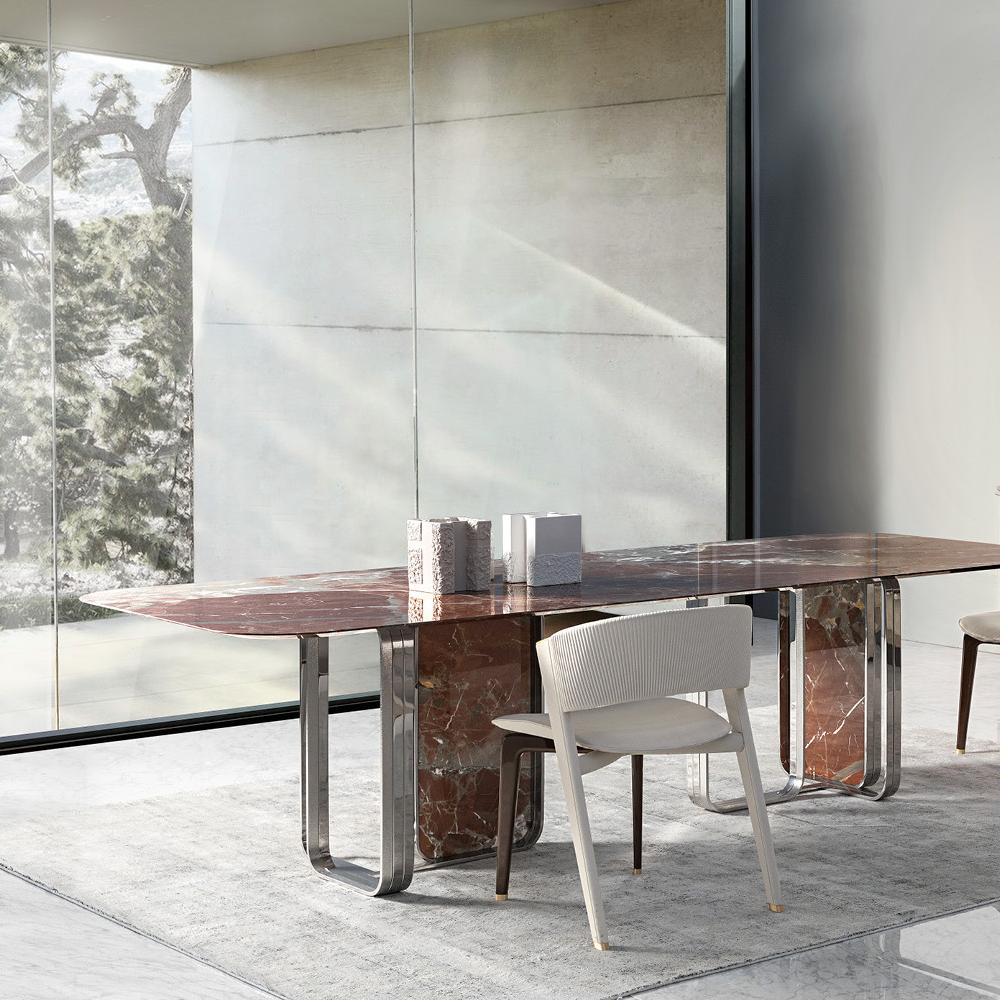 The uniqueness of this rectangular table lies in its double-layer brass base, which surrounds the marble slab like a ribbon, highlighting the natural texture of the stone. The metal parts have exquisite shapes and are available in both glossy and matte treatments, with some handmade 3D decorative effects.