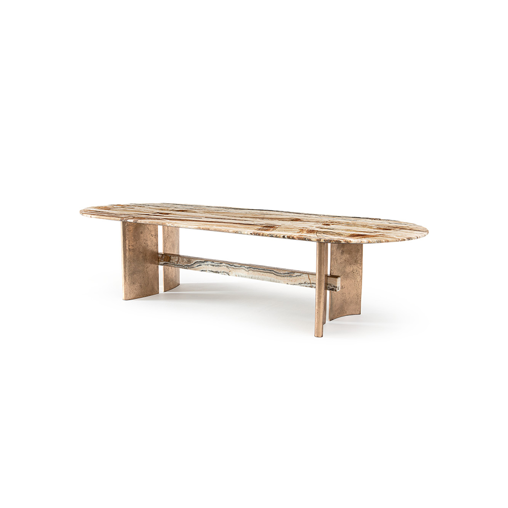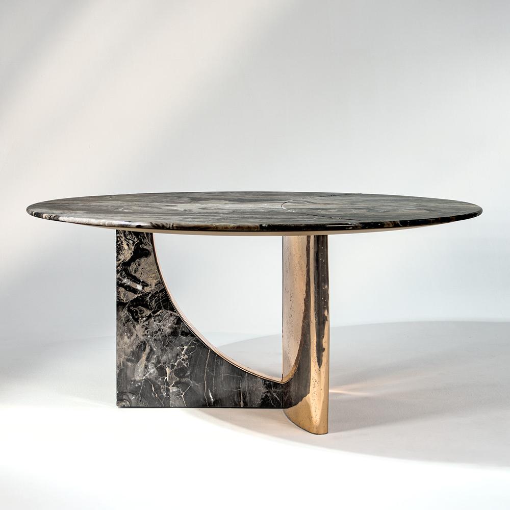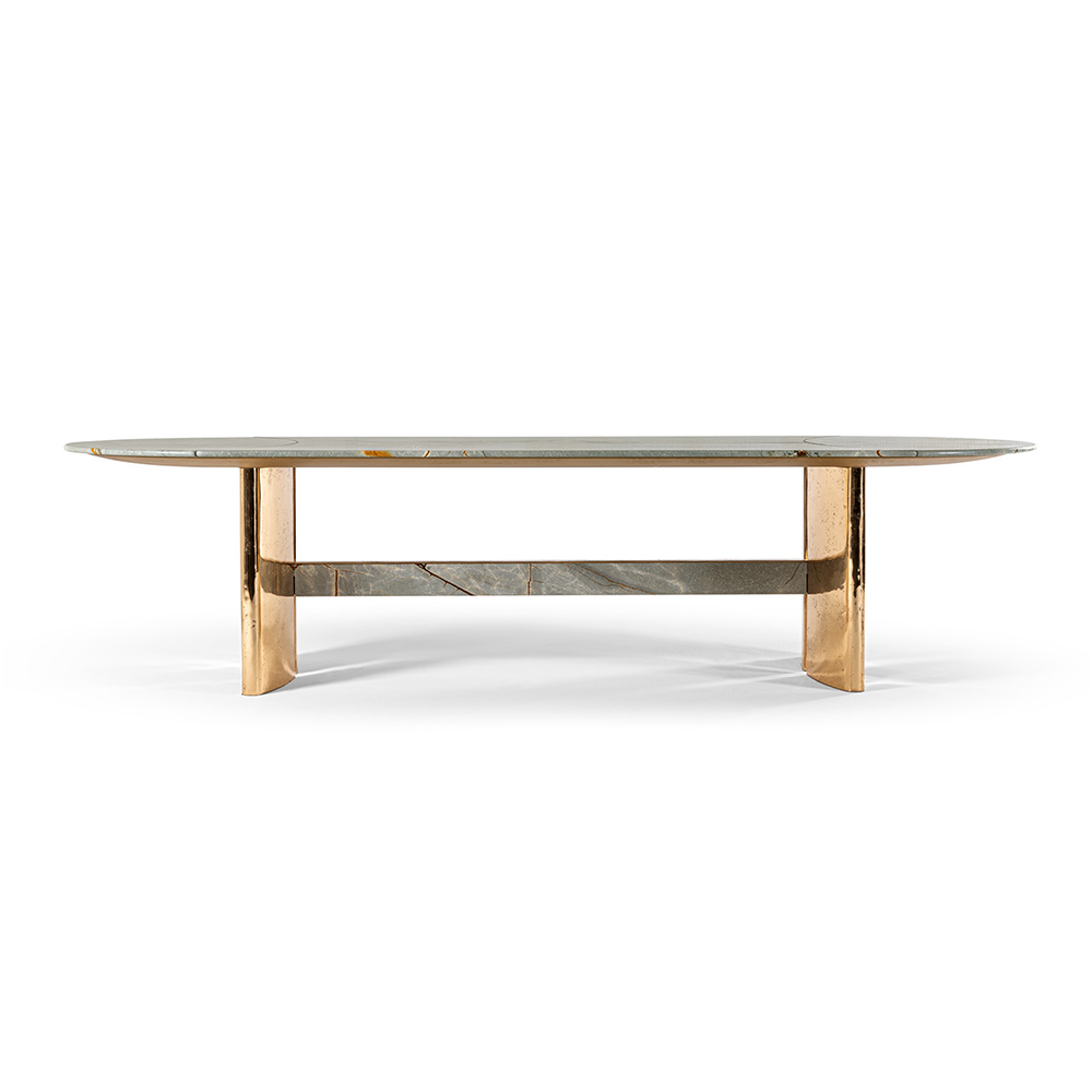 This dining table draws inspiration from the elegance and lightness of sailing sails. The marble tabletop can be designed as a whole or in three sections, paired with a double arched base, echoing the geometric style of 1930s architecture. The fused bronze components of the base are cast using special sand molds.