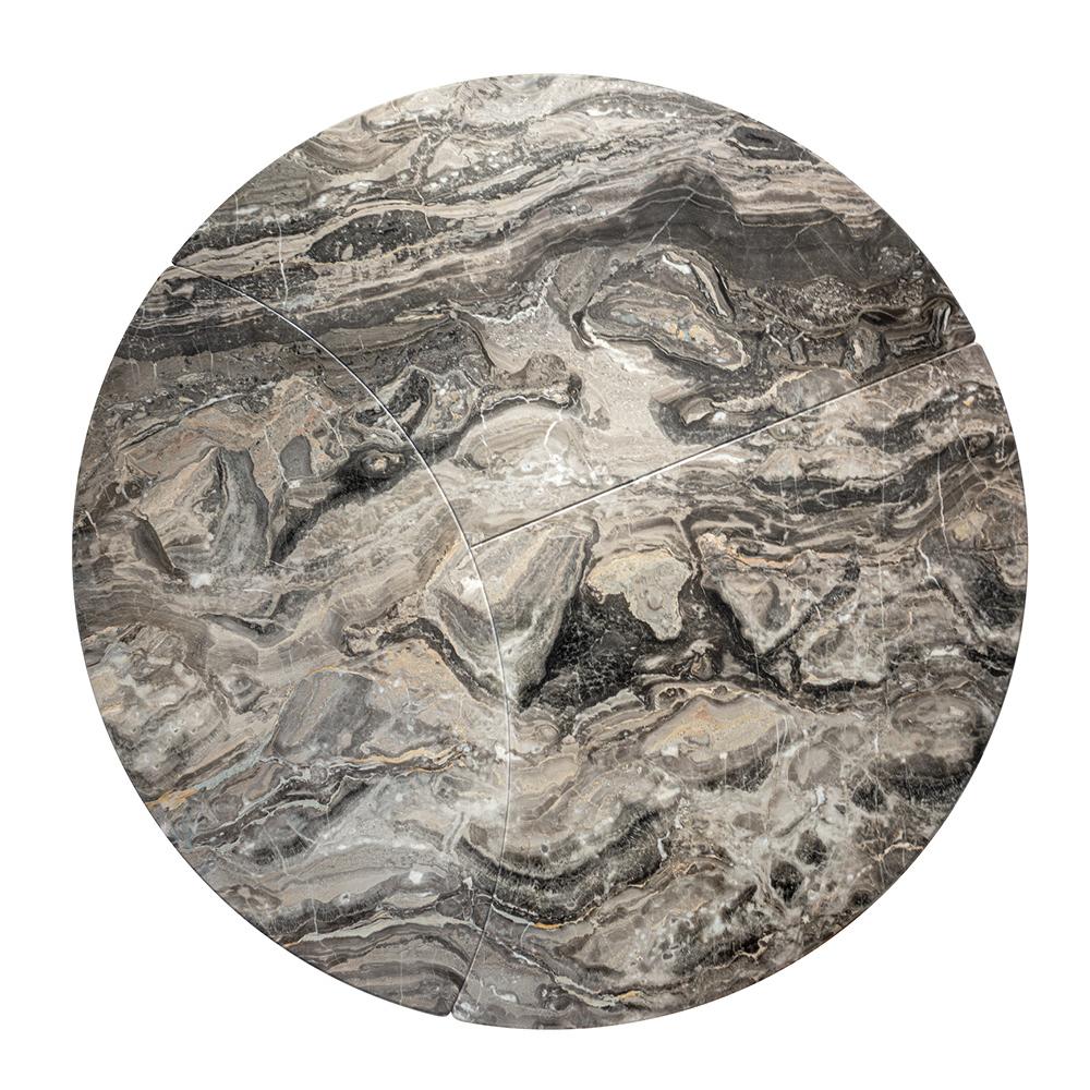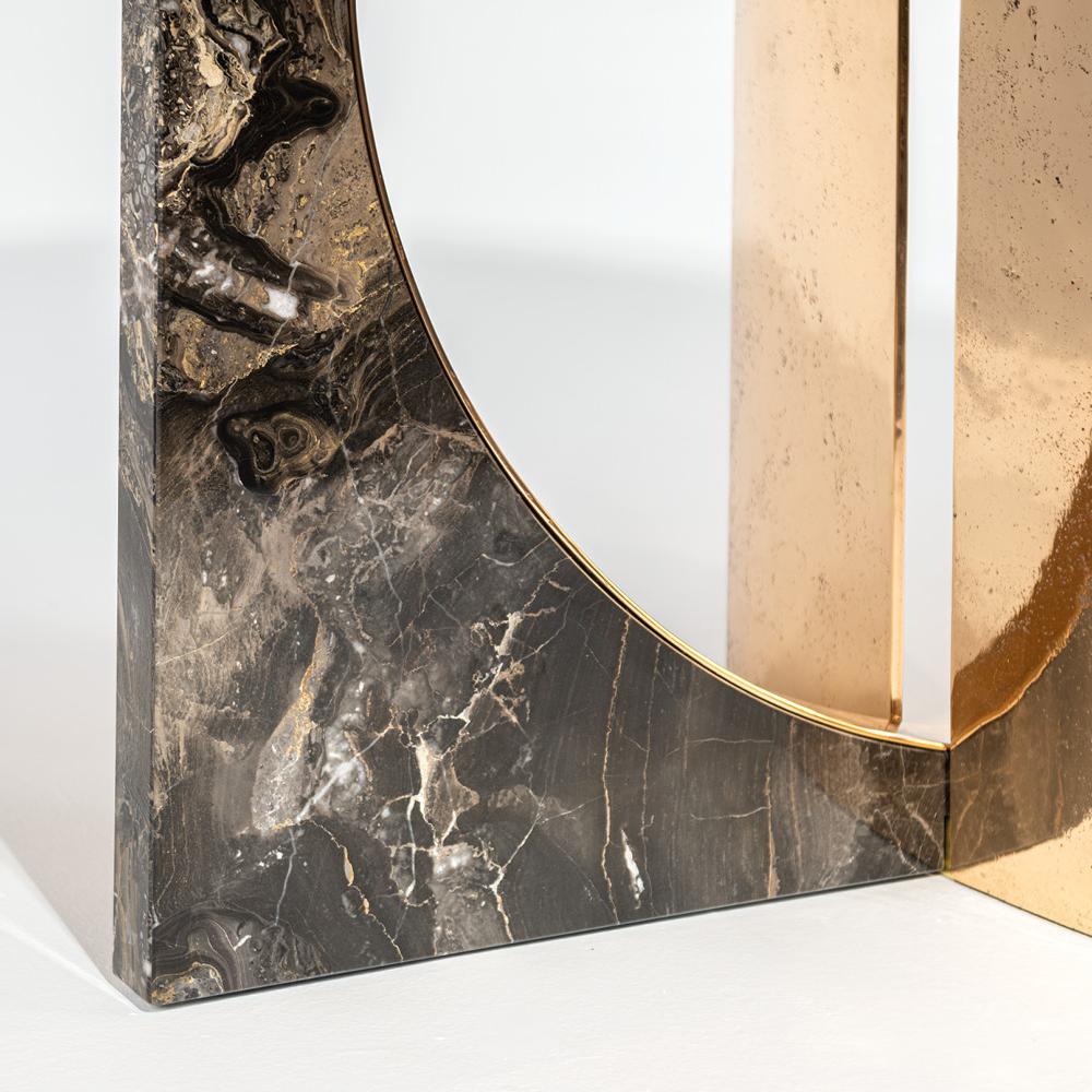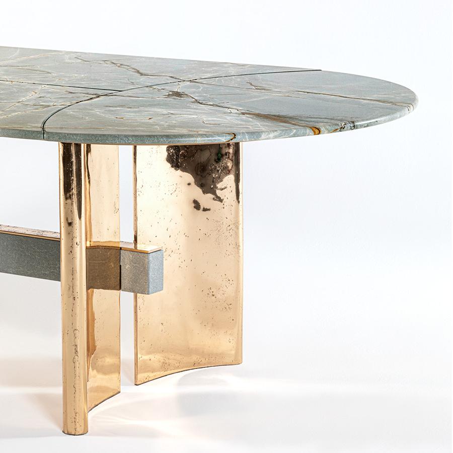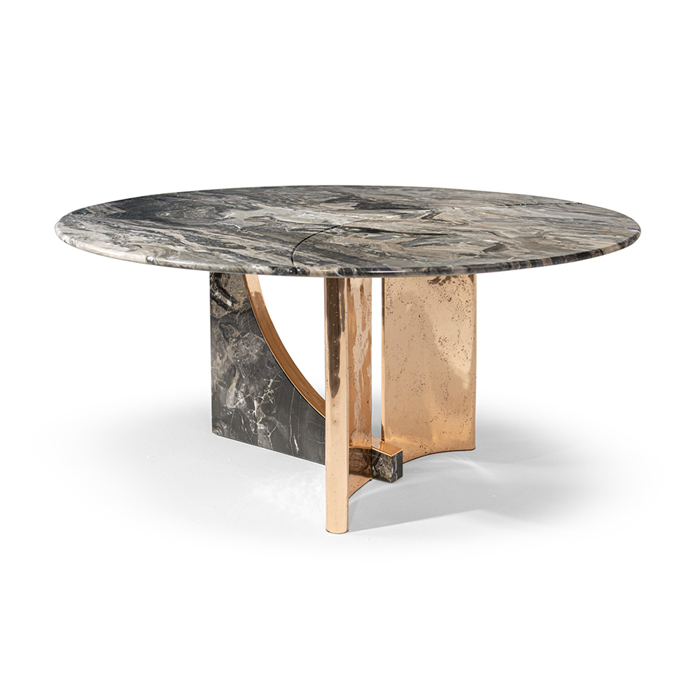 This dining table draws inspiration from the elegance and lightness of sailing sails. The marble tabletop can be designed as a whole or in three sections, paired with a double arched base, echoing the geometric style of 1930s architecture. The fused bronze components of the base are cast using special sand molds.