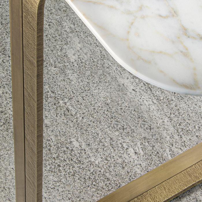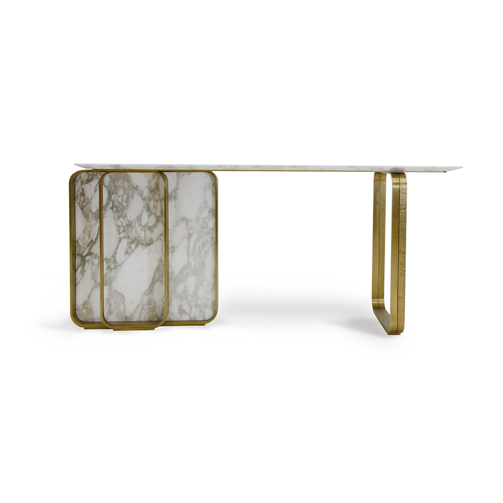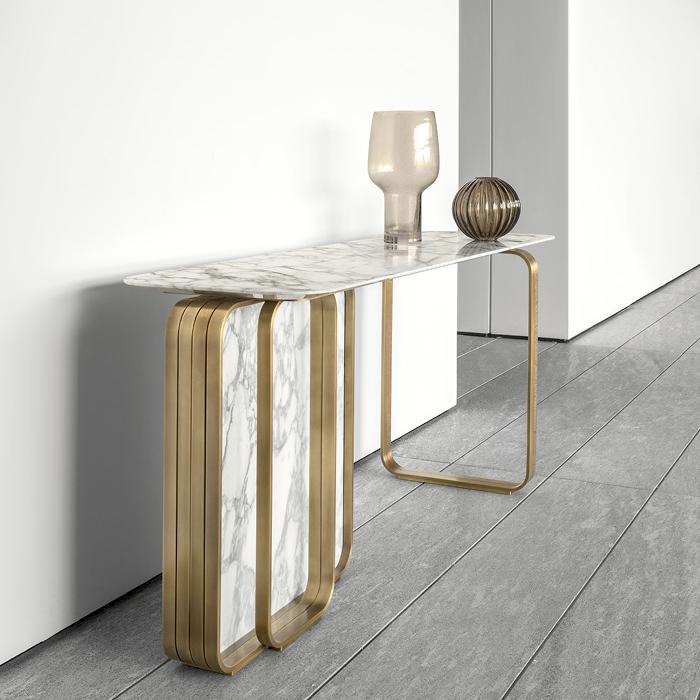 This entrance table features a marble tabletop with edges designed as gradually thinner rounded corners. The highlight of the entire series lies in its exquisite metal base, surrounded by a vertical marble slab, showcasing a unique design aesthetic.