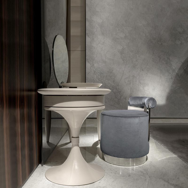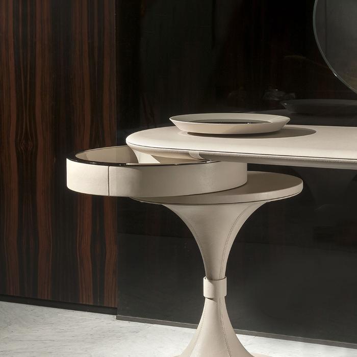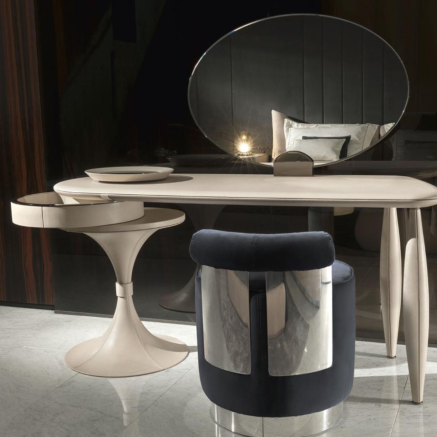 This dressing table combines different geometric shapes with harmonious proportions. The leather wrapped base echoes the eponymous table series, paired with tapered leg design. Its cylindrical drawers can be rotated open, and the top is equipped with a painted tray and an elliptical mirror. The unconventional size and design make it particularly practical for bedroom makeup.