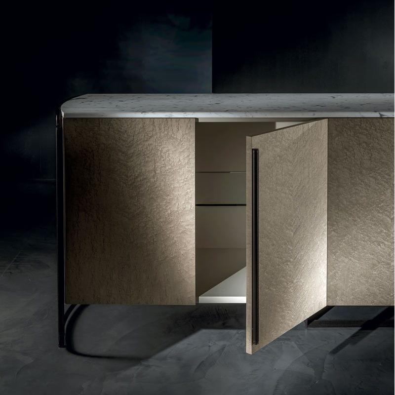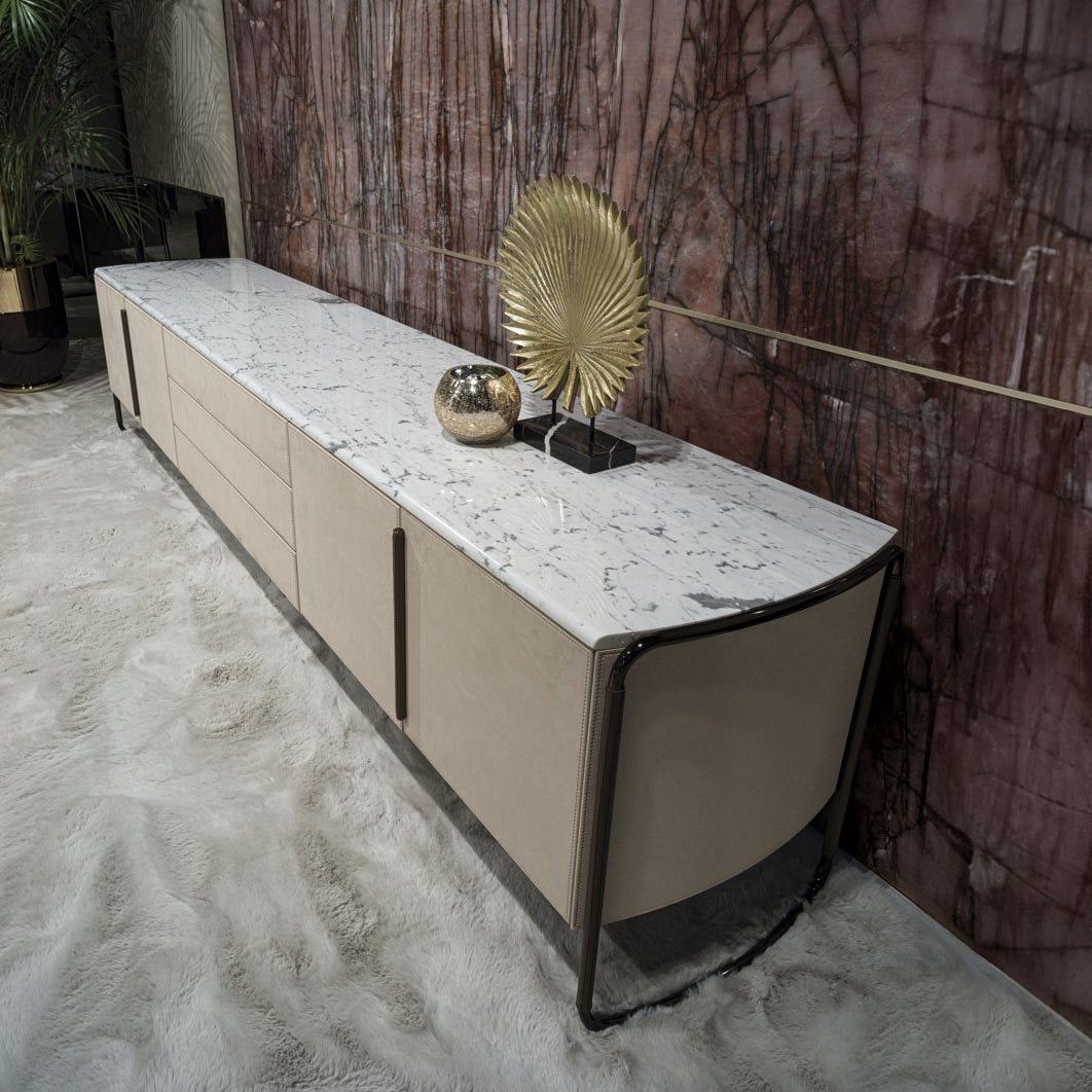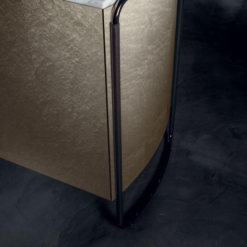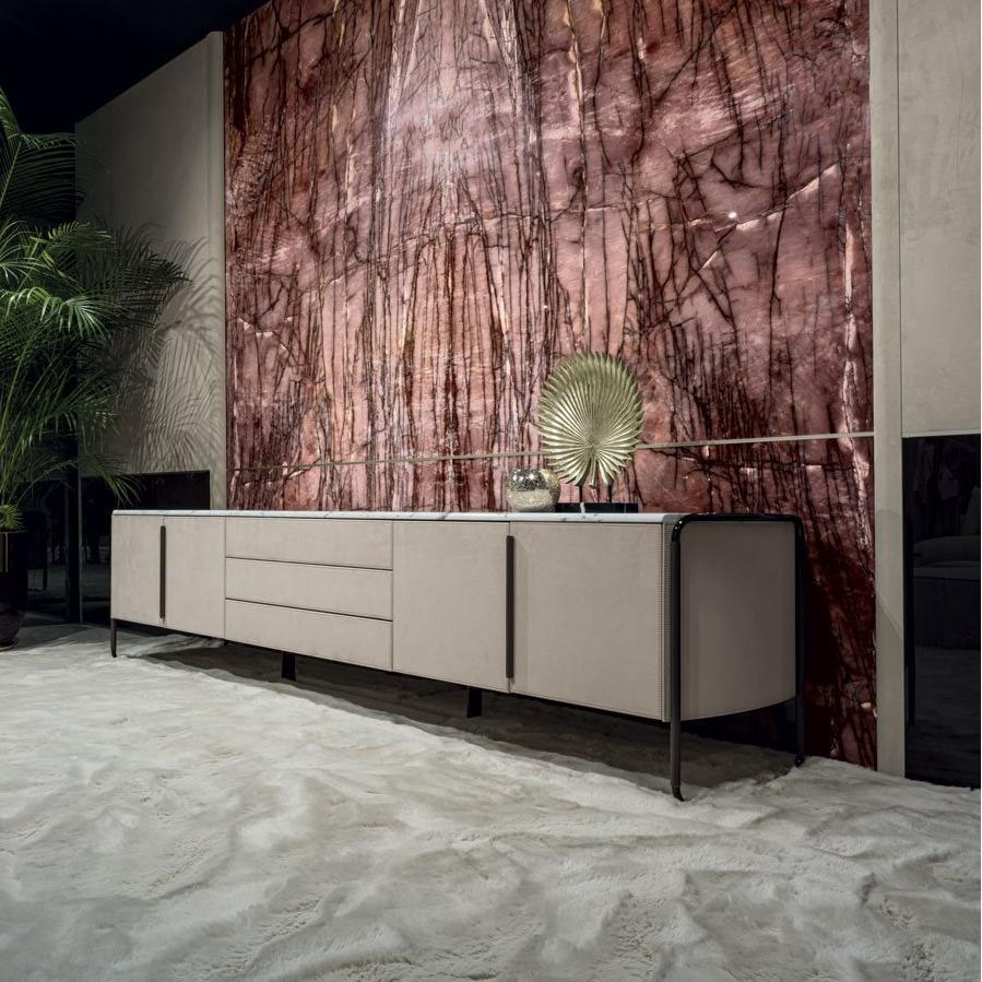 This living room furniture series features rounded metal pipes in various sizes, including high, low, wide, and narrow. The wooden structure can be made of various materials such as glossy/matte maple, heat-treated eucalyptus, etc. The exterior is decorated with recycled leather in multiple colors. The metal parts, handle, and base are covered with antibacterial and environmentally friendly leather. The desktop can be made of 22mm thick wood or 20mm thick marble, with a crystal shelf inside and carefully treated edges.