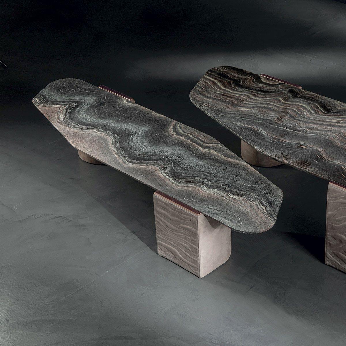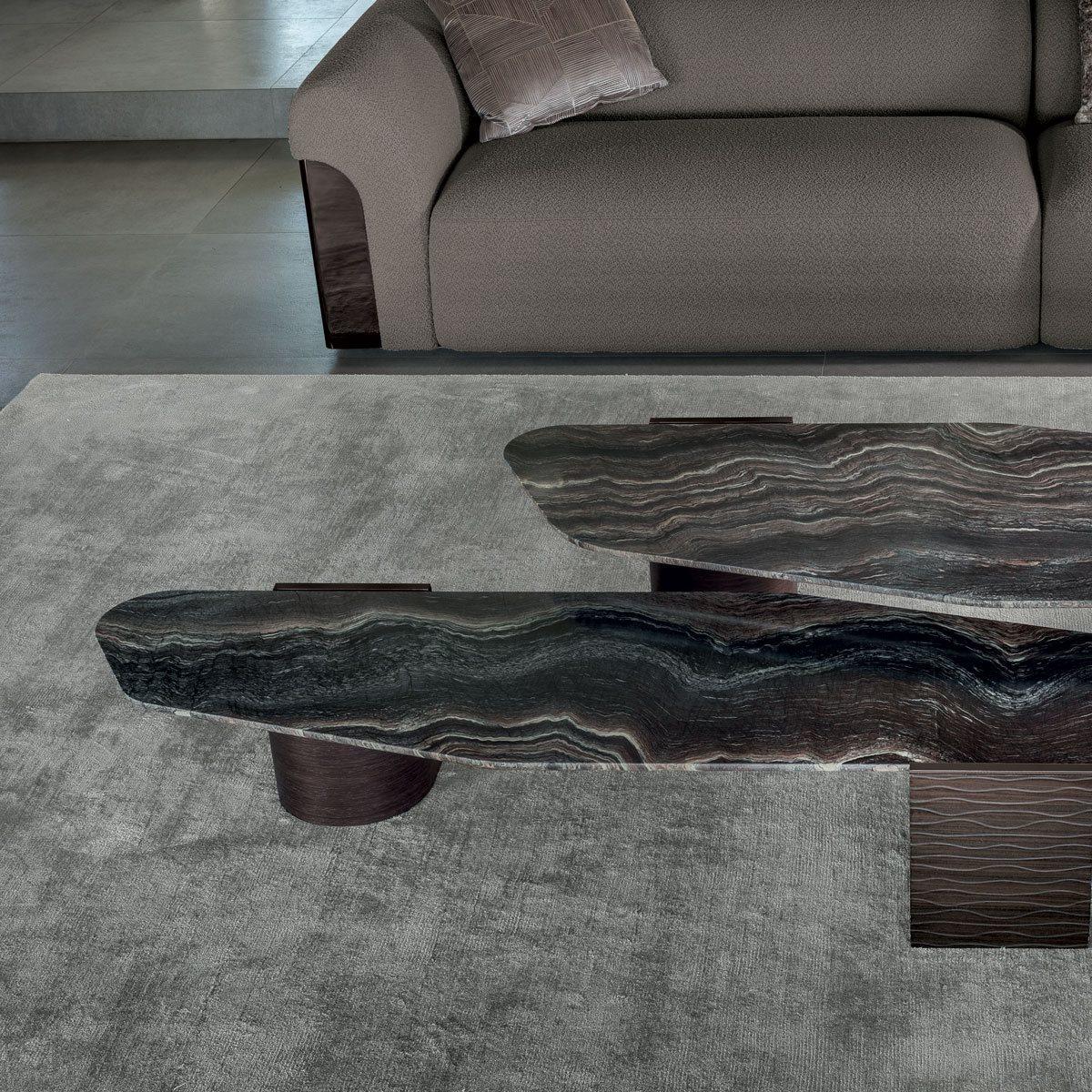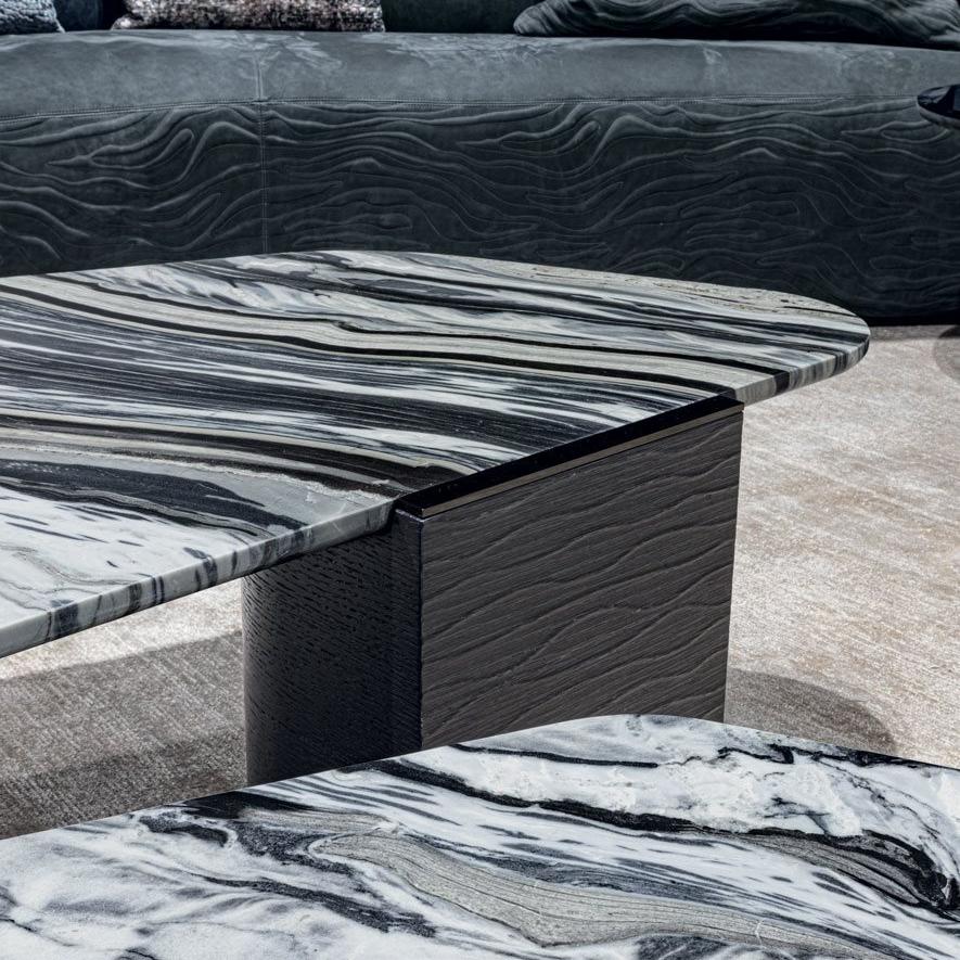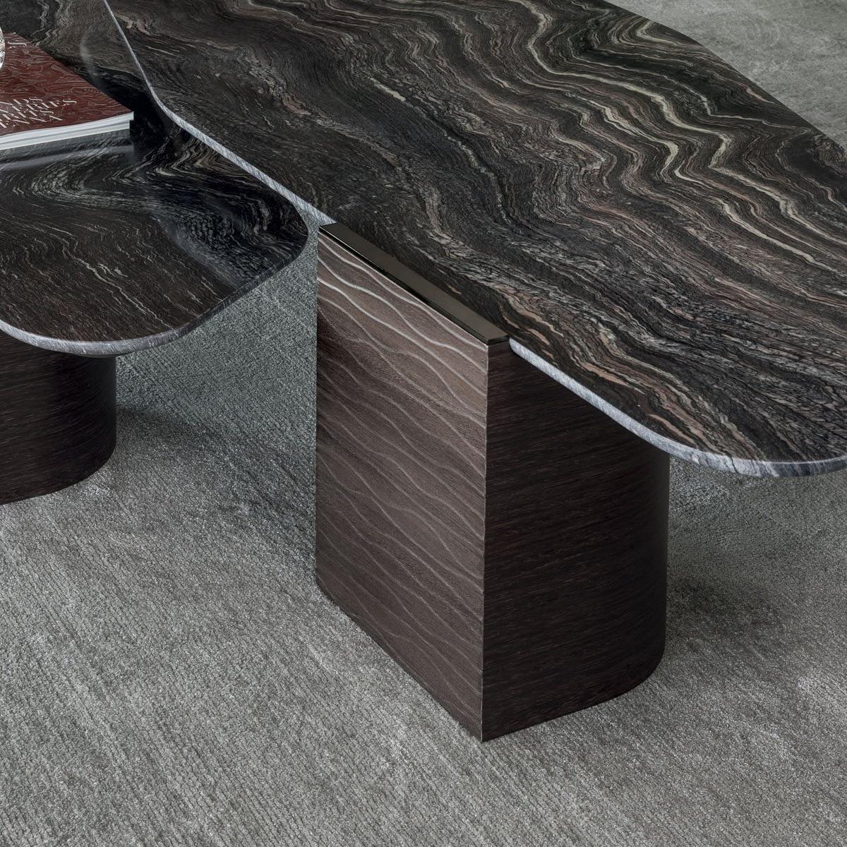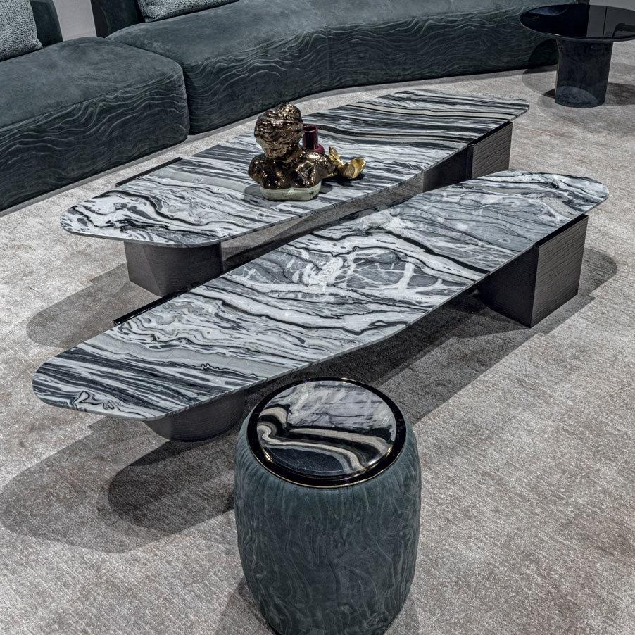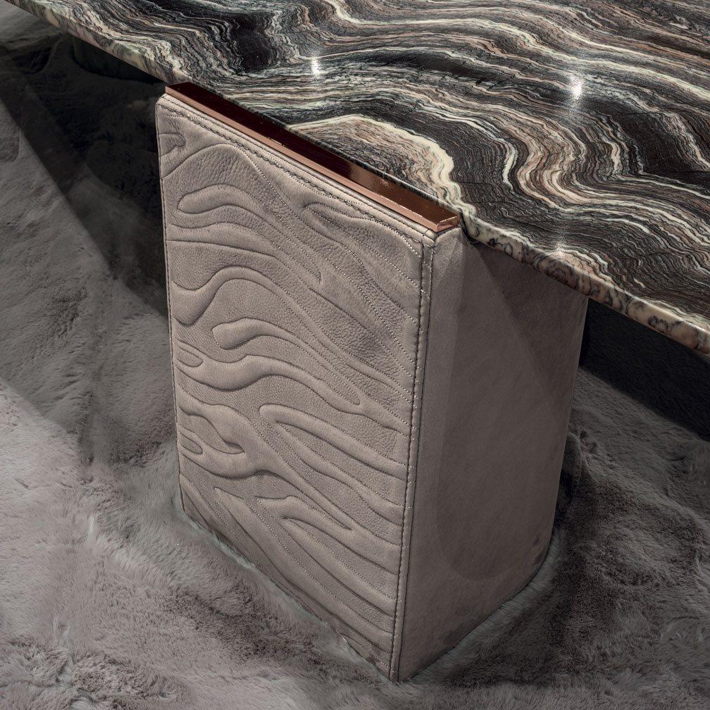 This small table has a unique design and can be double assembled into a bridge layout. The semi-circular wooden legs are available in mocha or gray, and the exterior is decorated with patterns or leather. The connection between the table legs and the marble tabletop is embellished with metal plates. Marble material is abundant, meeting the needs of different styles.