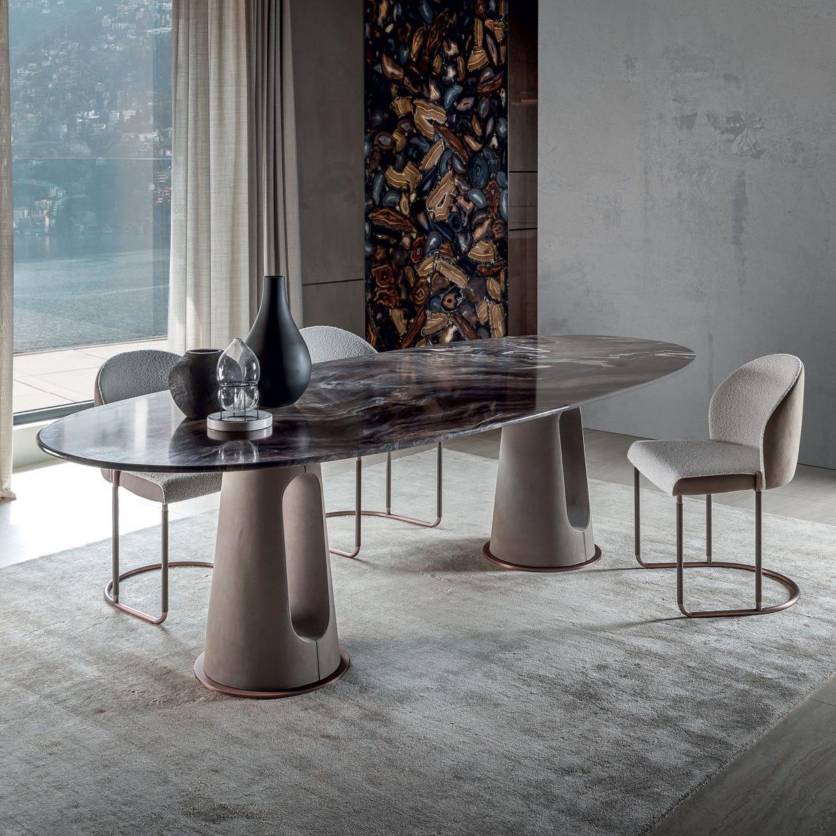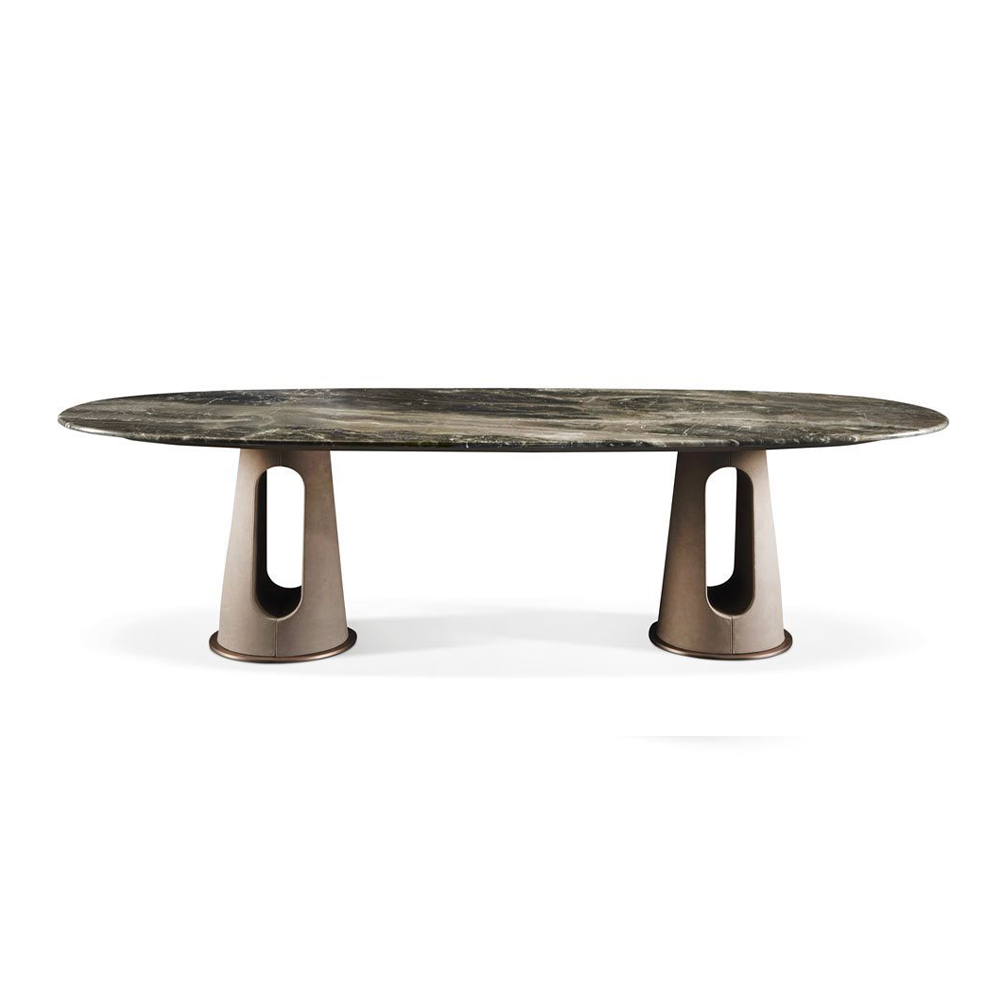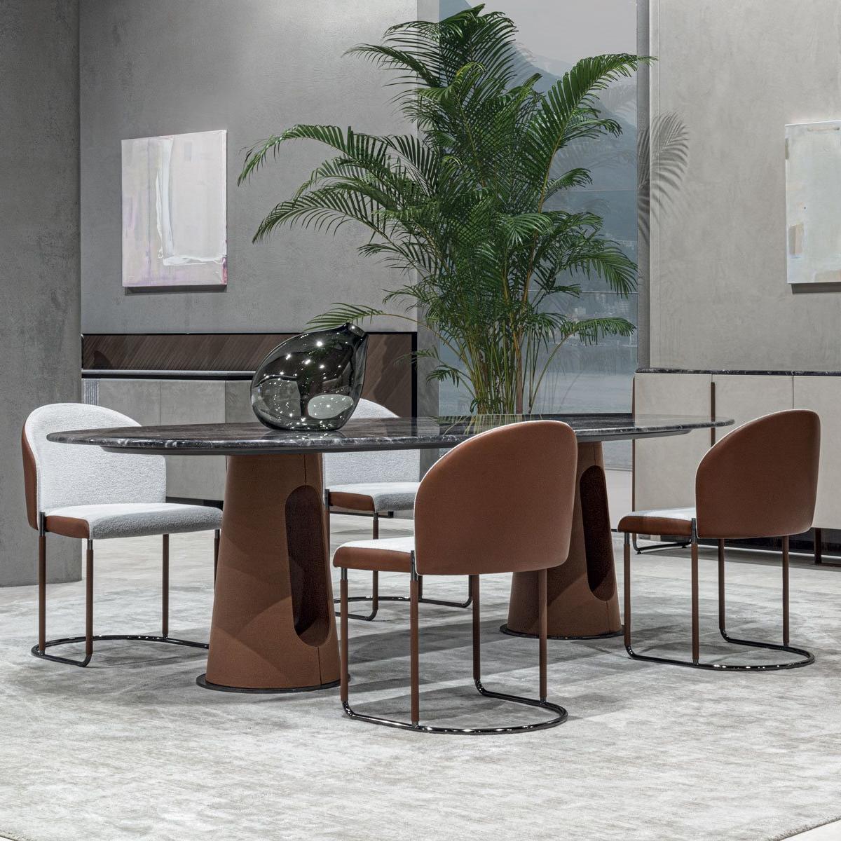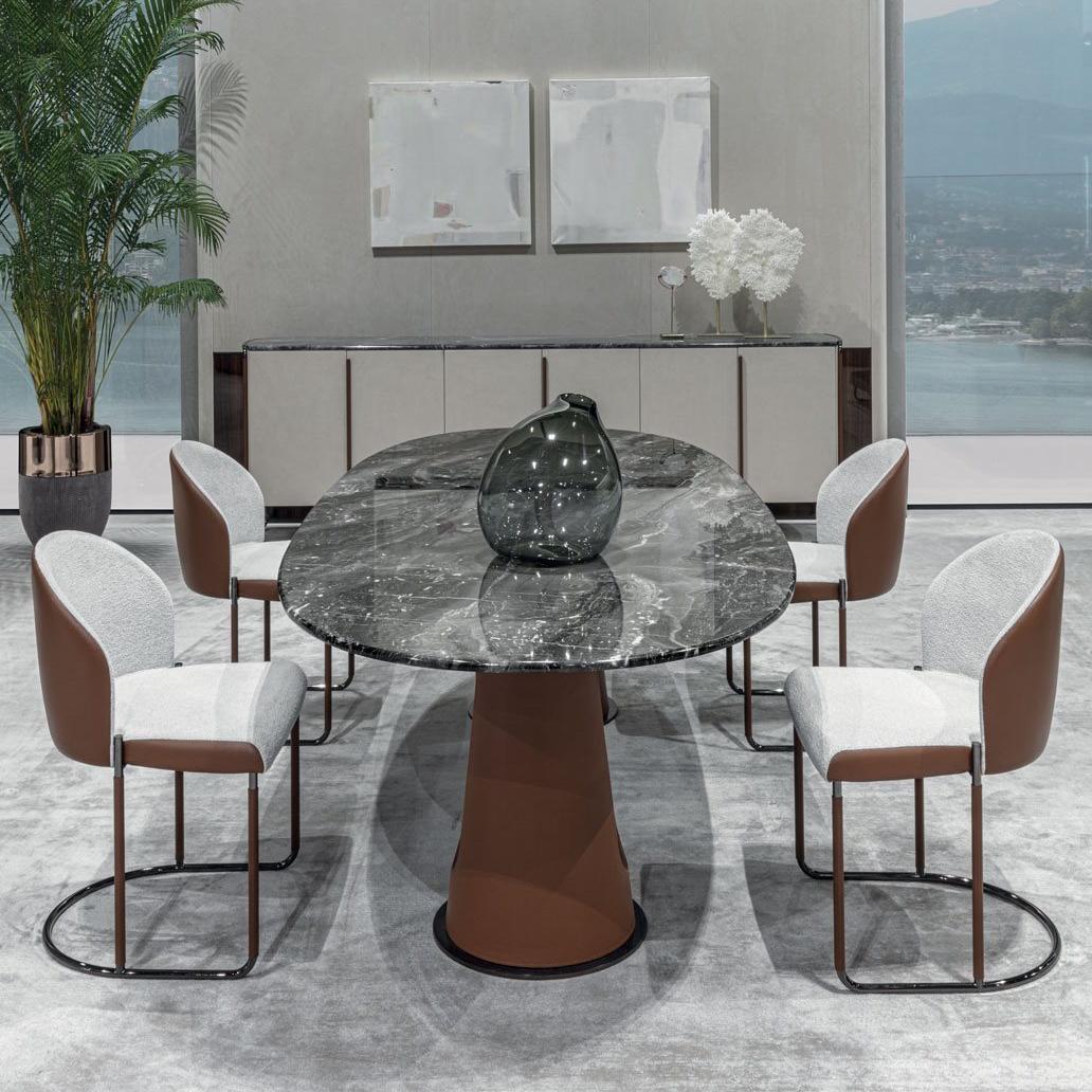 This table has a simple design and comes in two styles: elliptical and circular. The legs of the table are covered with foam and leather, and the bottom is decorated with metal feet. The colors include gradual copper, bright brown, etc. The desktop is made of round edged marble with diverse materials.