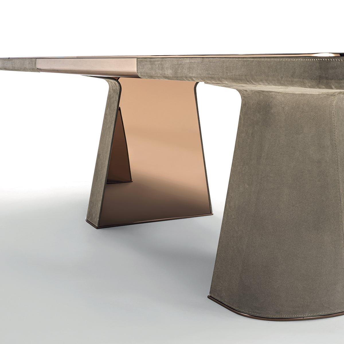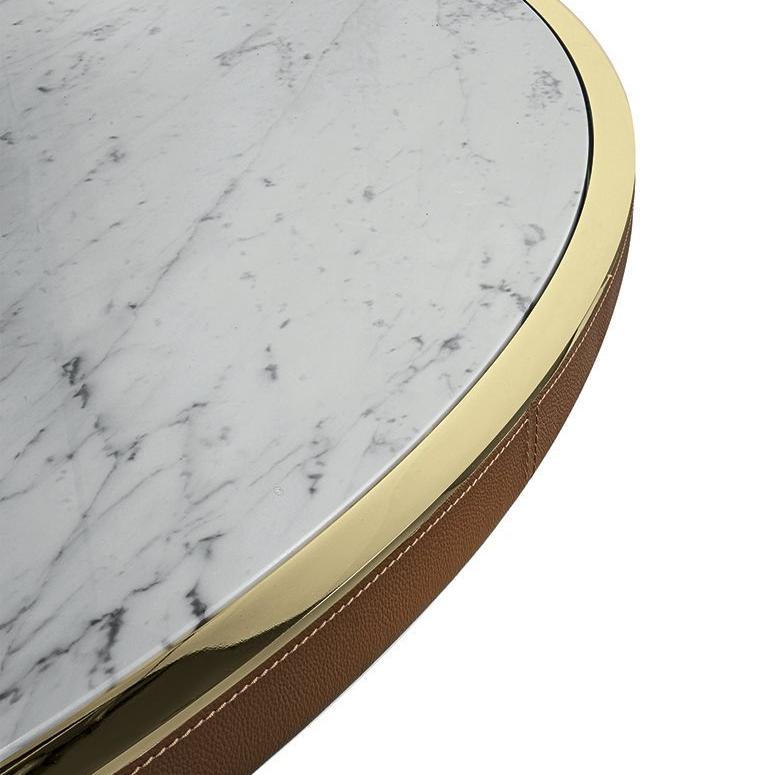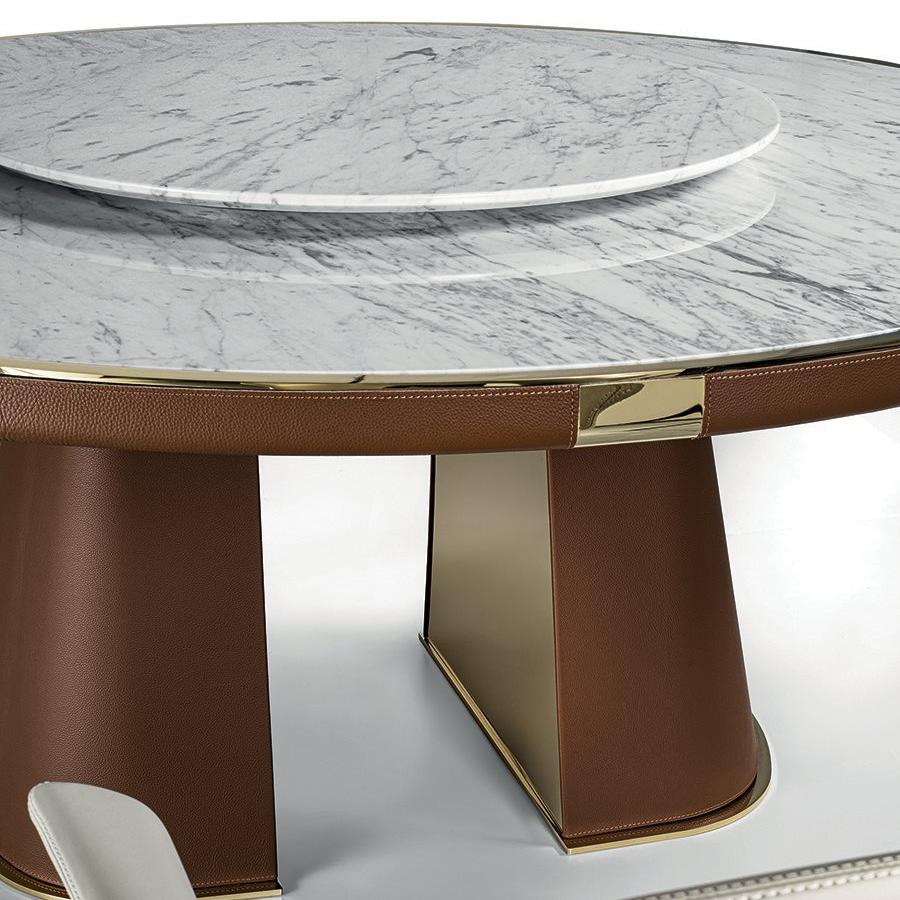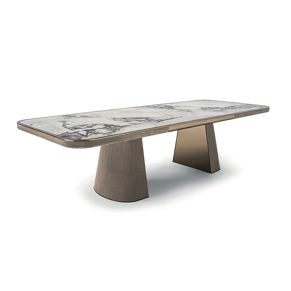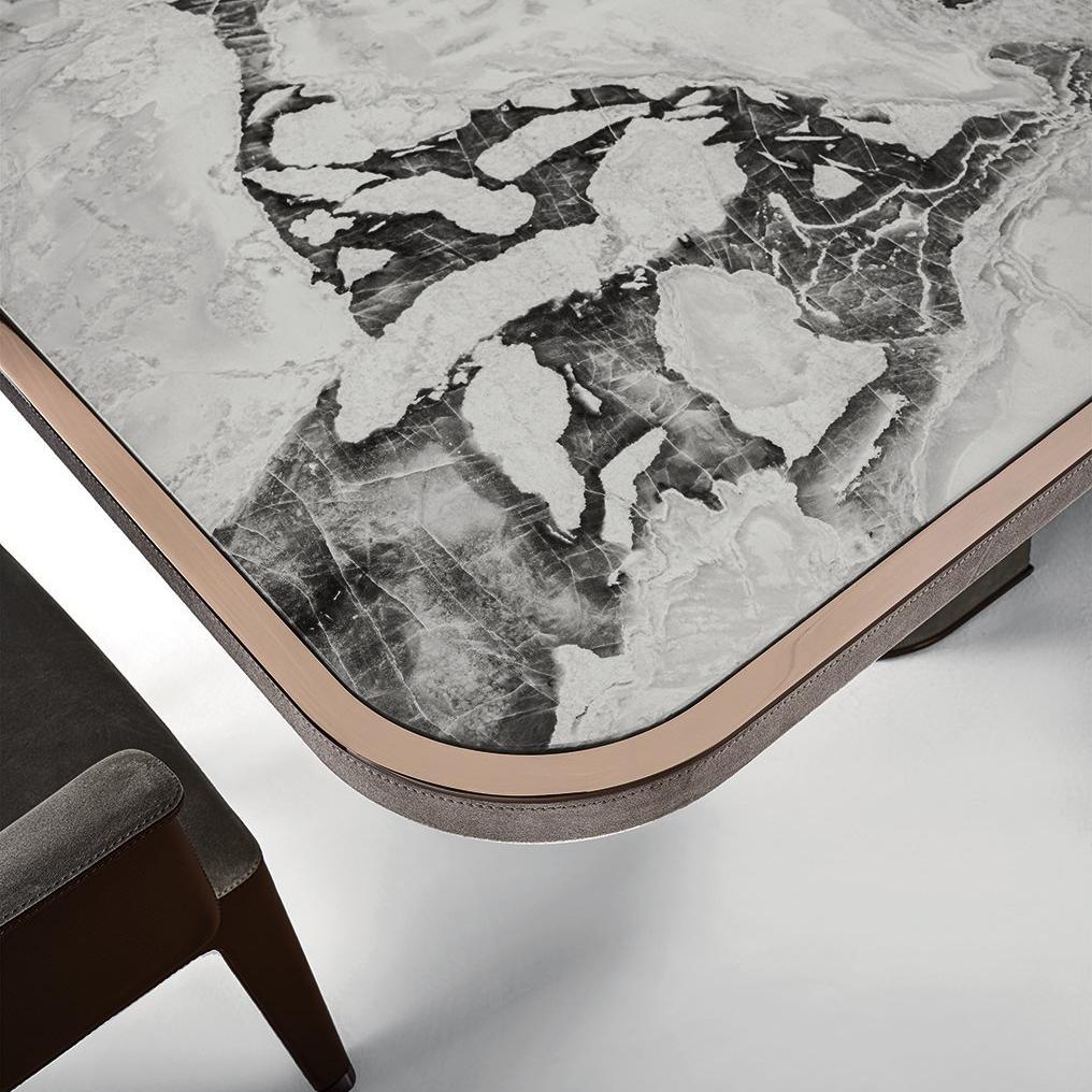 This table is exquisitely designed, with fiberglass legs covered in leather and embedded with metal panels. The finishes are diverse, such as matte nickel and black rose gold. The bottom of the table legs is matched with metal feet of the same color scheme, with metal inserts embellished between them, which matches the overall style. The desktop is made of round edged marble with metal edging.
