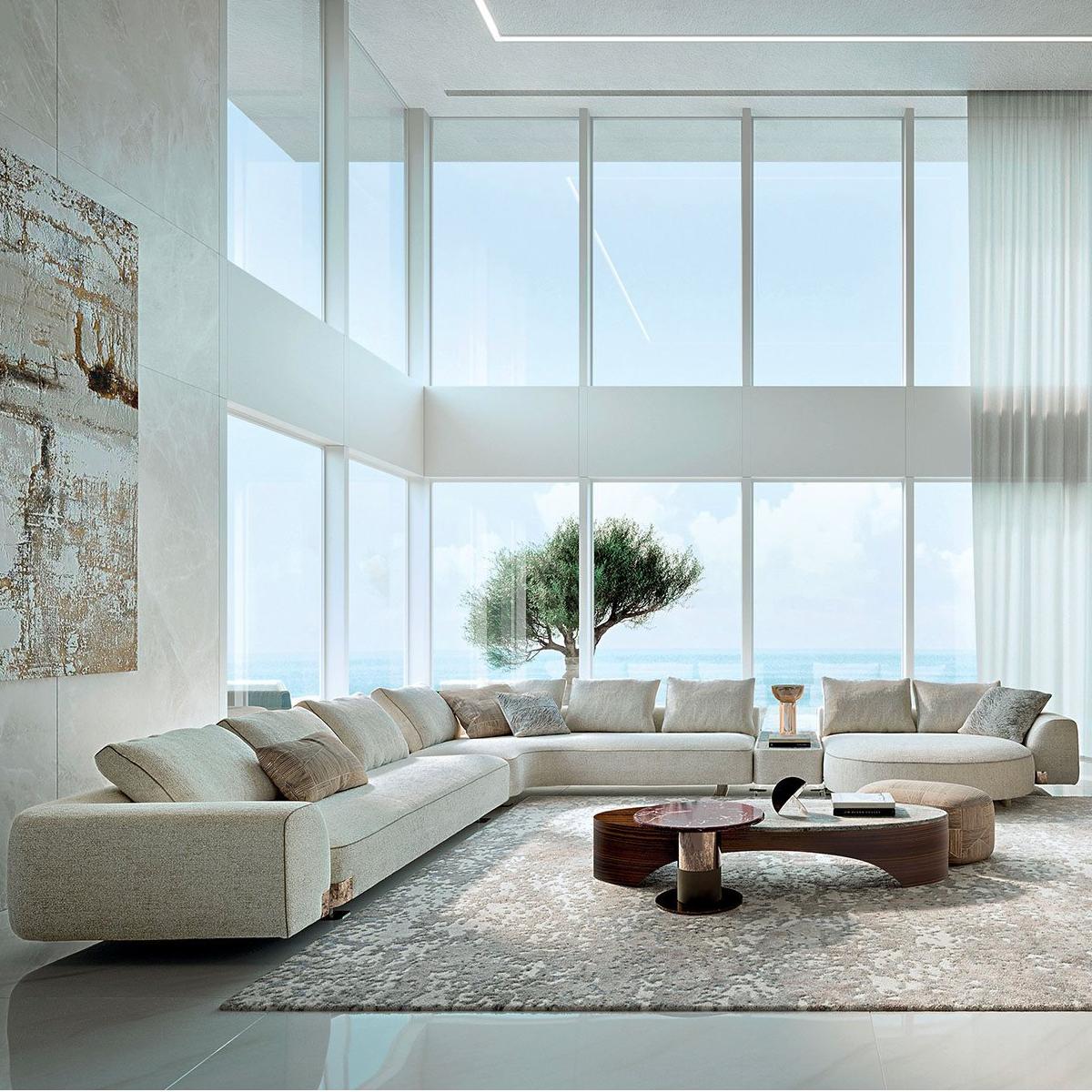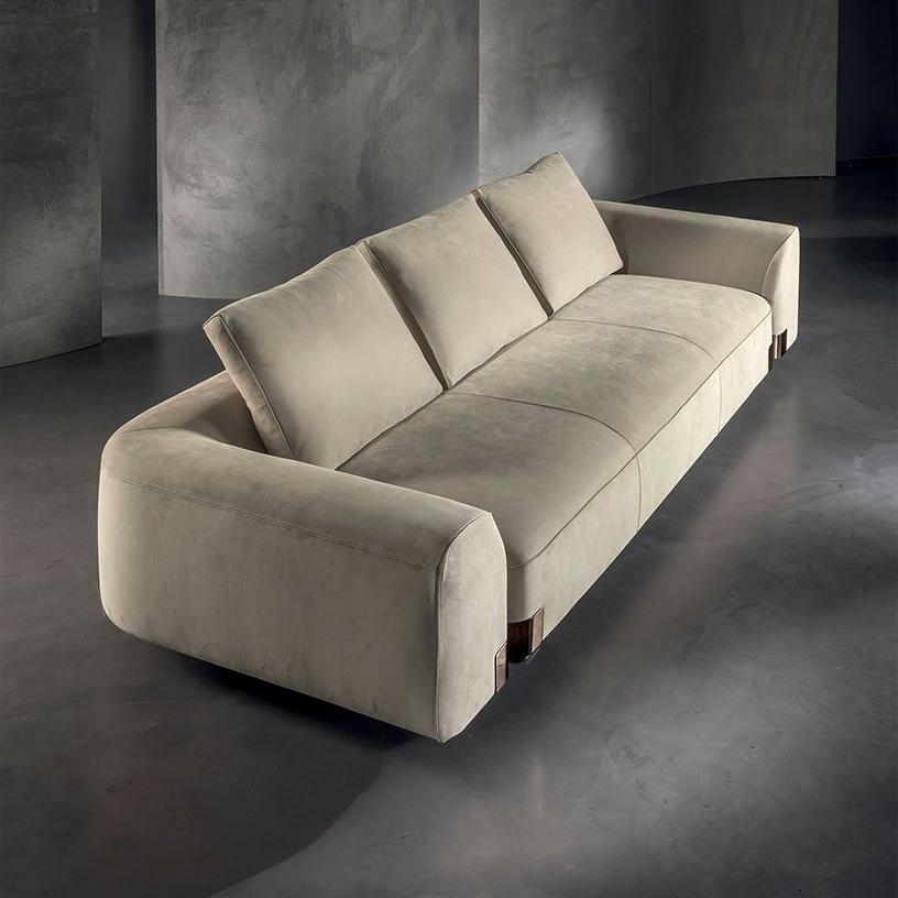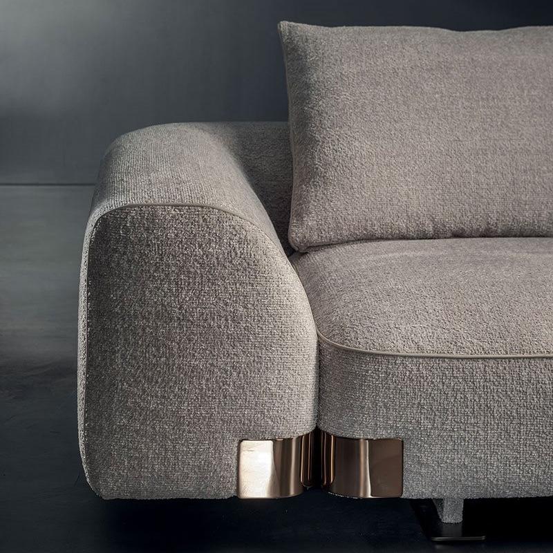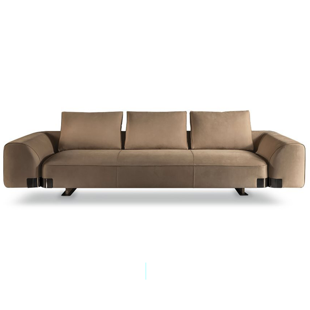 This sofa has an elegant design, spacious and soft seats, and is paired with goose down cushions for ultimate comfort. The wooden structure is matched with polyurethane foam seat cushion. The feet are made of wood wrapped with leather or fabric, and the metal bracket is made of bronze paint. The two sides of the sofa are decorated with metal plates, and the overall style is exquisite and generous. The cover layer of the seat cushion and back cushion can be removed.