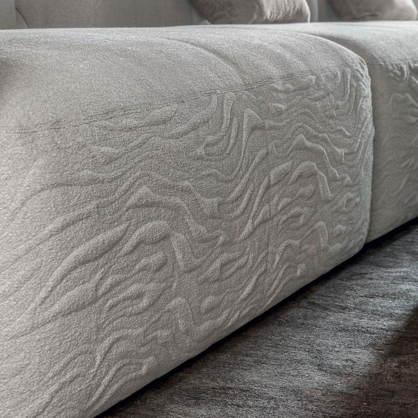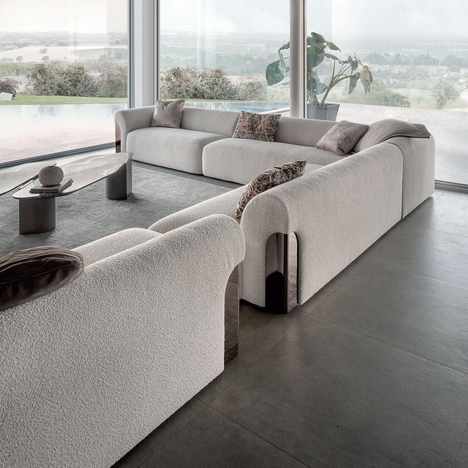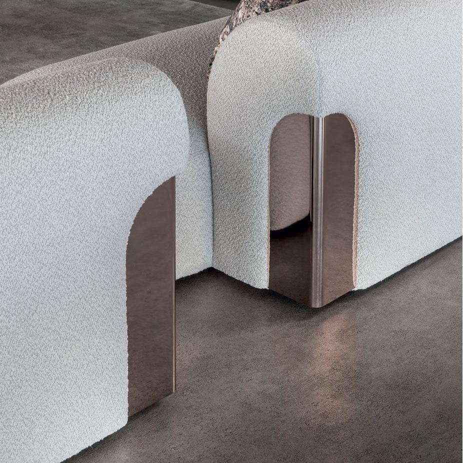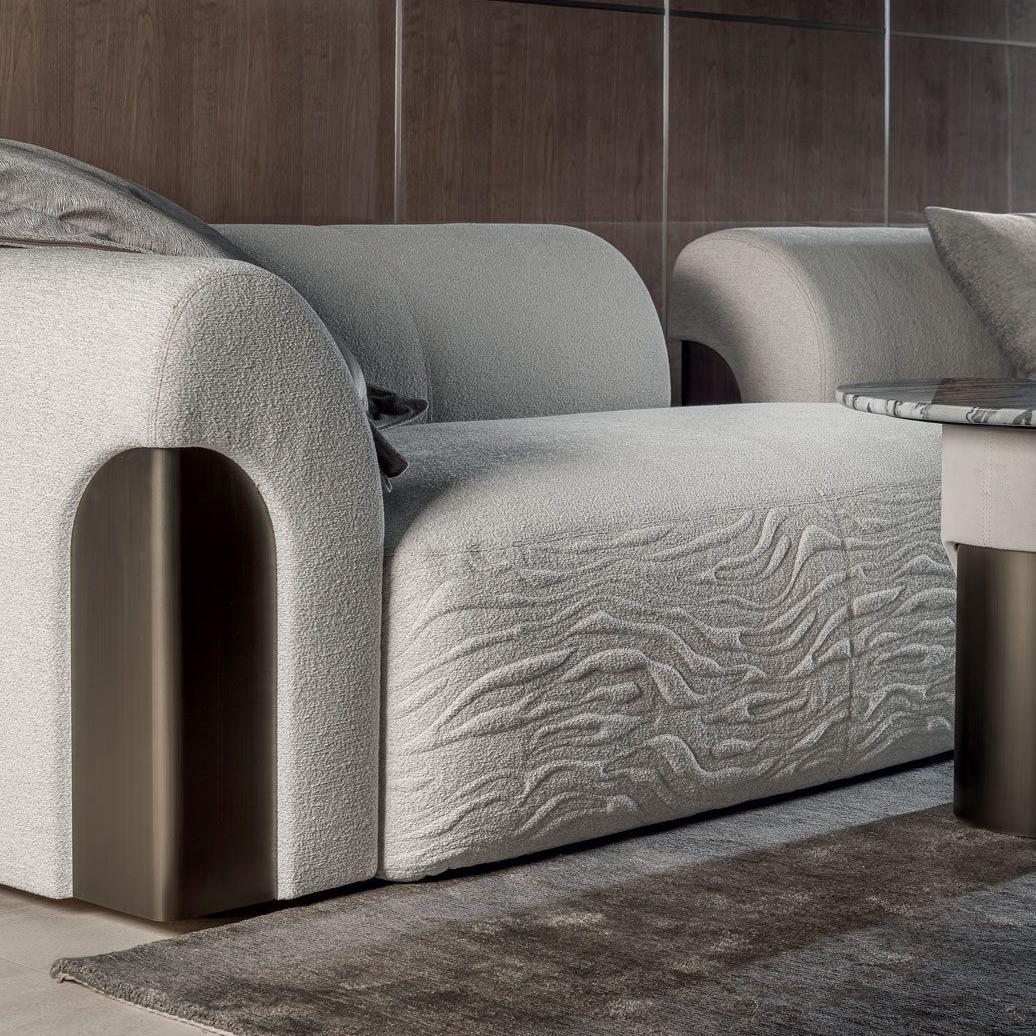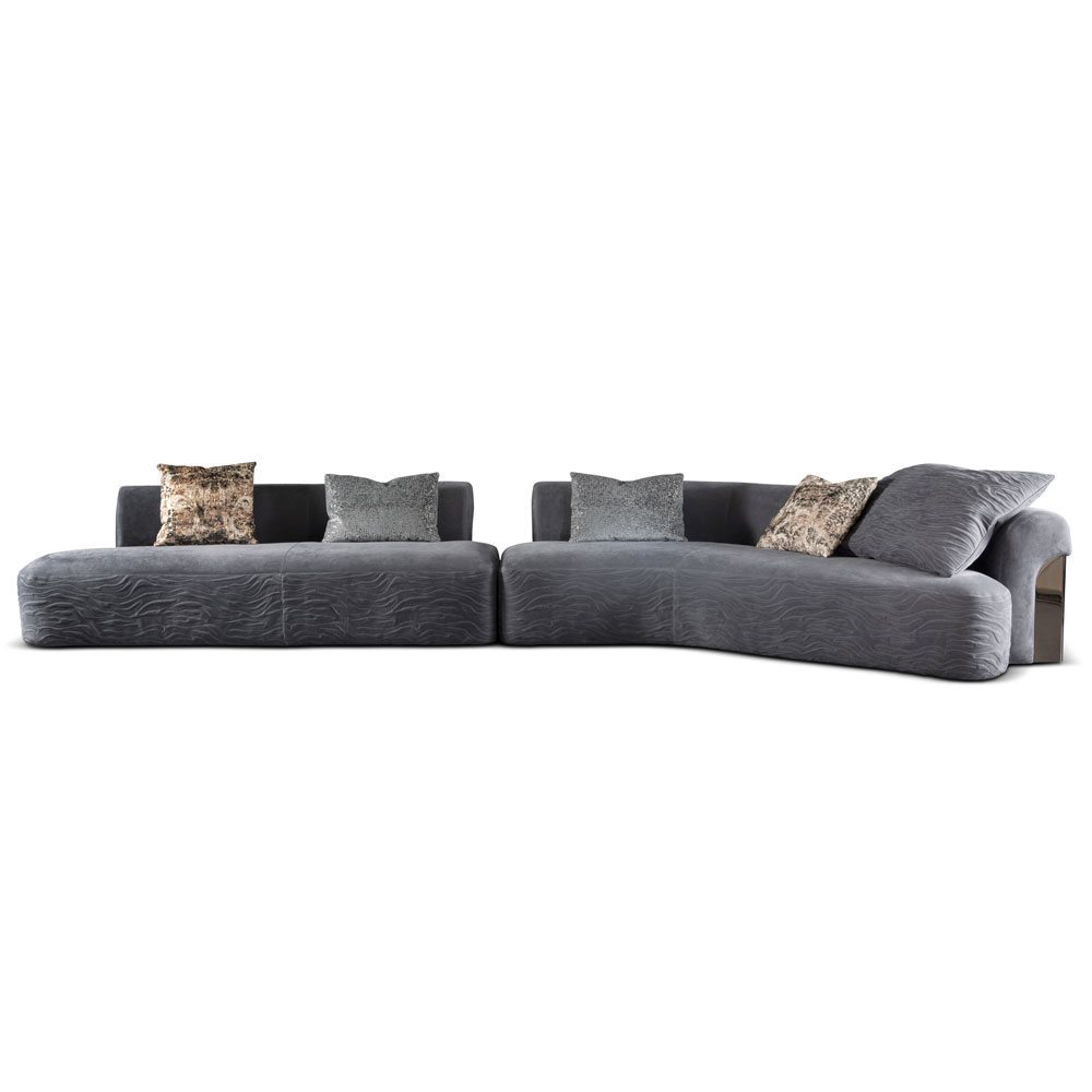 This sofa has a simple design and is suitable for linear or semi-circular combinations. The armrest and backrest are integrated with polished metal plates, making the curves softer. The cushion adopts specially formulated multi density polyurethane foam, which is flexible and compressive, supported by elastic PVC board and solid wood structure. The sofa fabric is non removable, but the surface covering of the cushion and seat cushion can be removed.