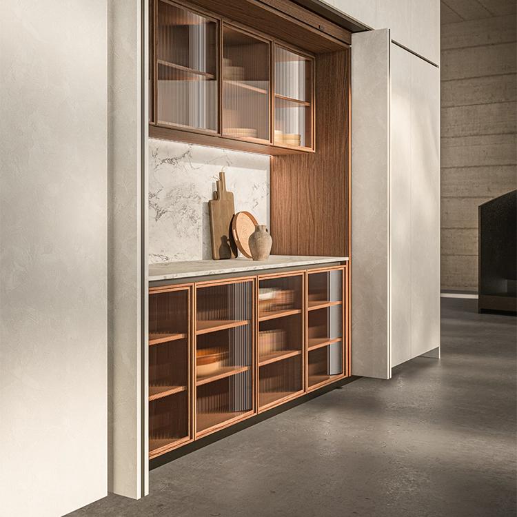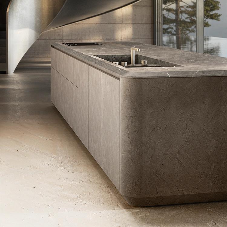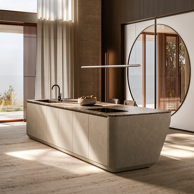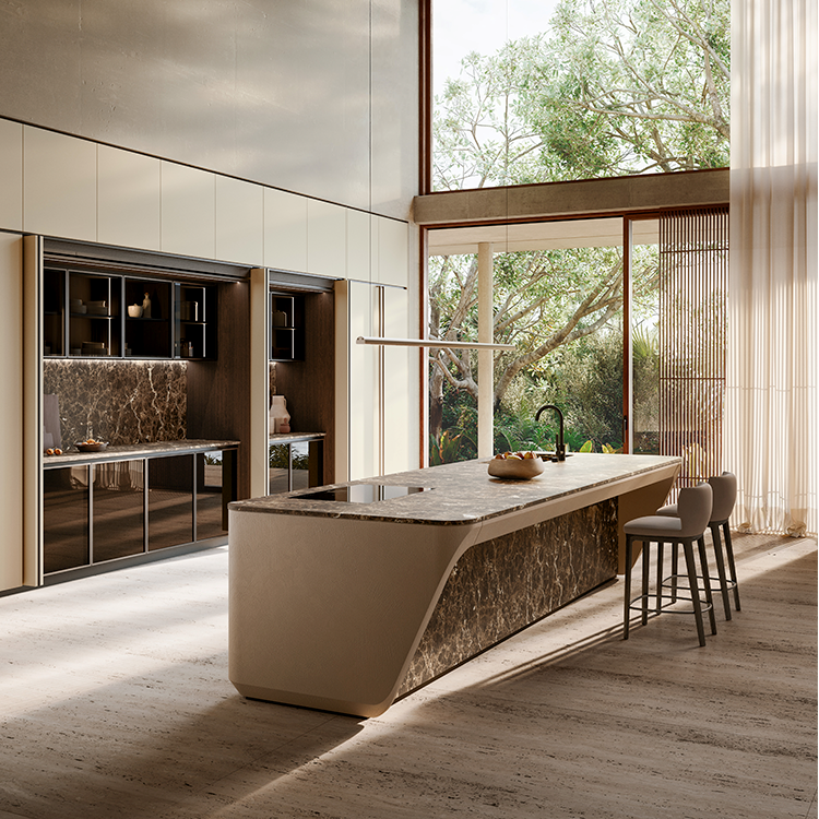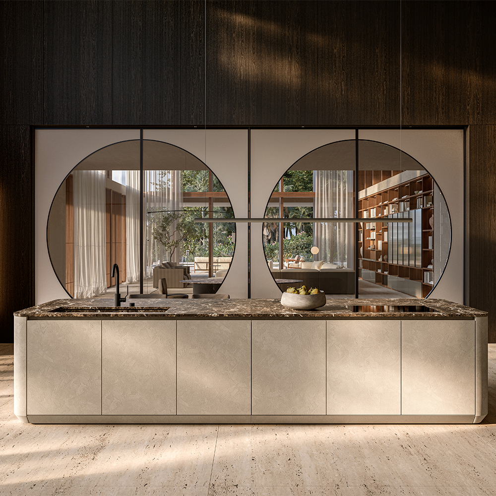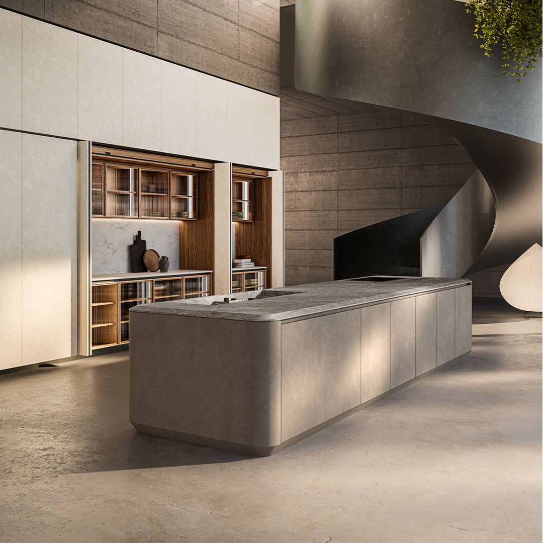 This cabinet perfectly blends iconic architectural aesthetics, combining innovation with tradition through smooth and dynamic shapes, creating a kitchen that is both sculptural and functionally advanced, providing a refined and uncompromising user experience.