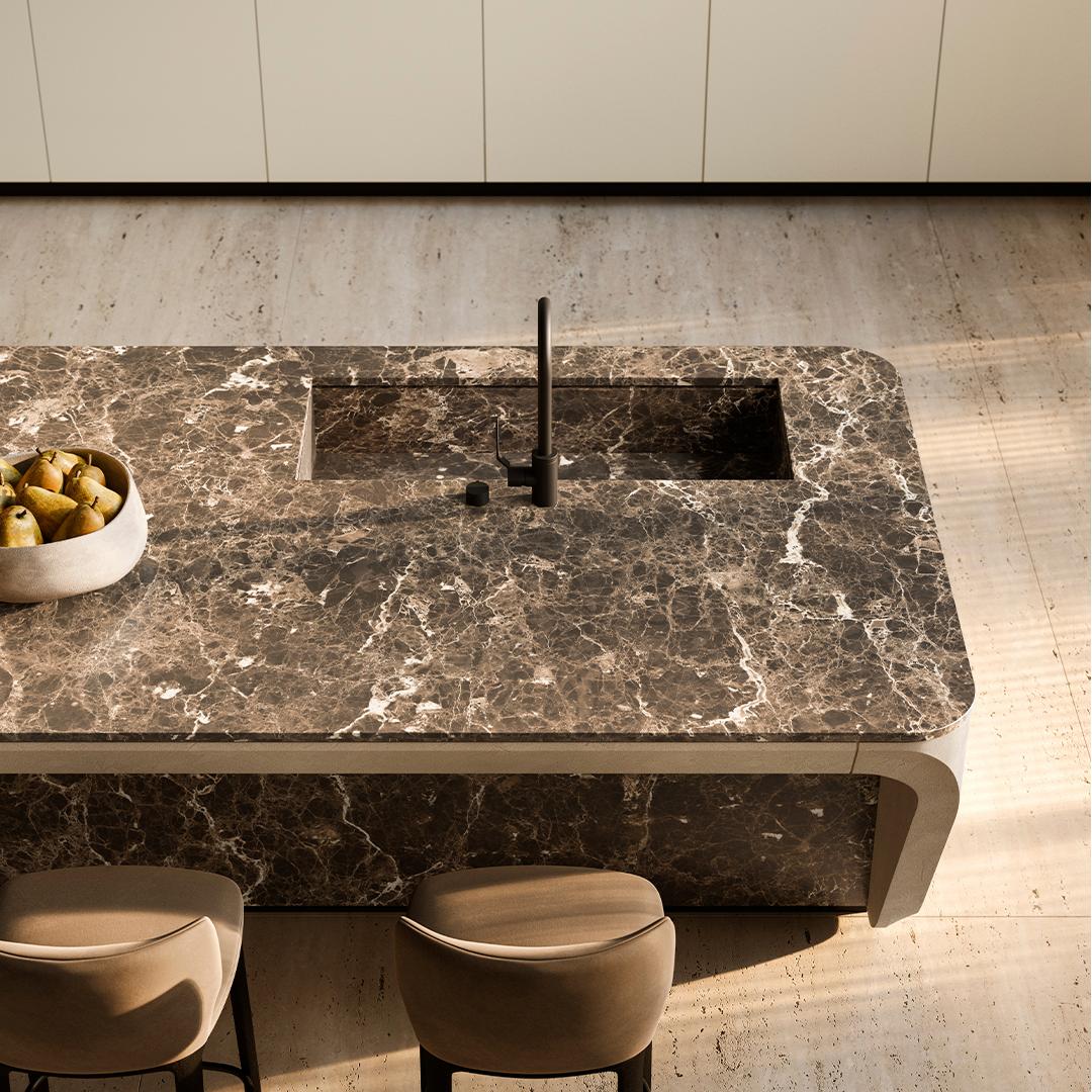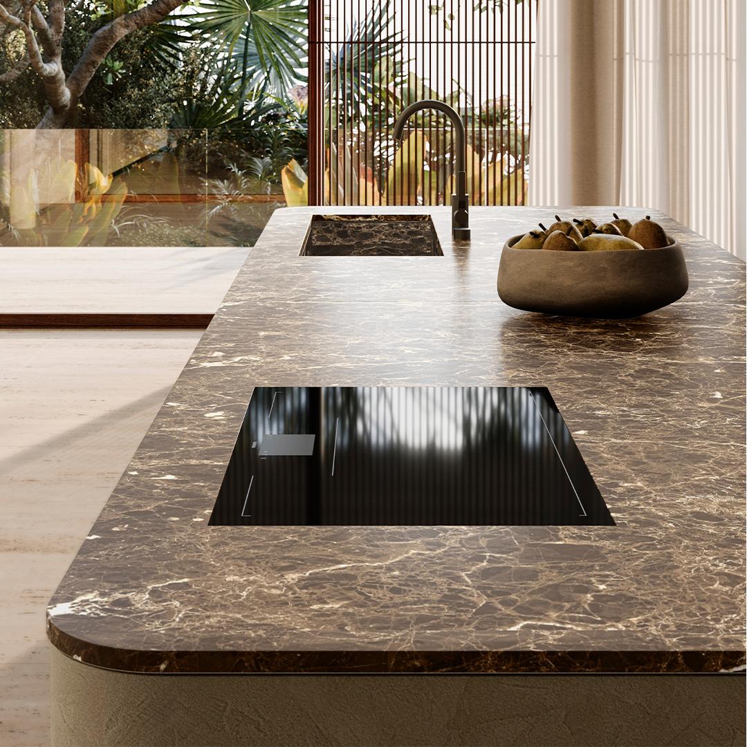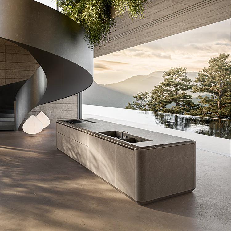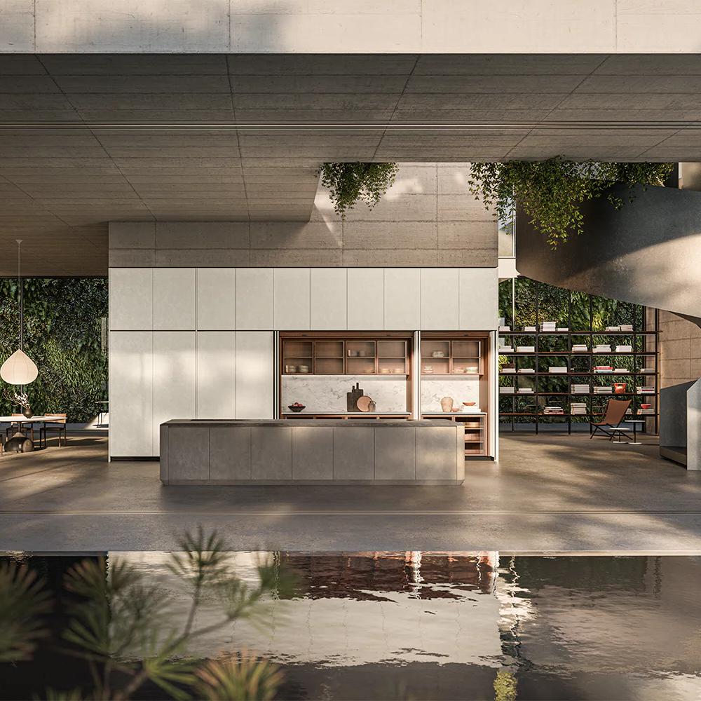 This cabinet perfectly blends iconic architectural aesthetics, combining innovation with tradition through smooth and dynamic shapes, creating a kitchen that is both sculptural and functionally advanced, providing a refined and uncompromising user experience.