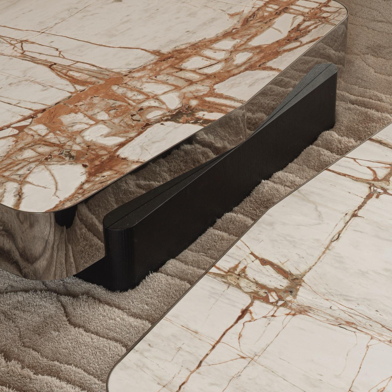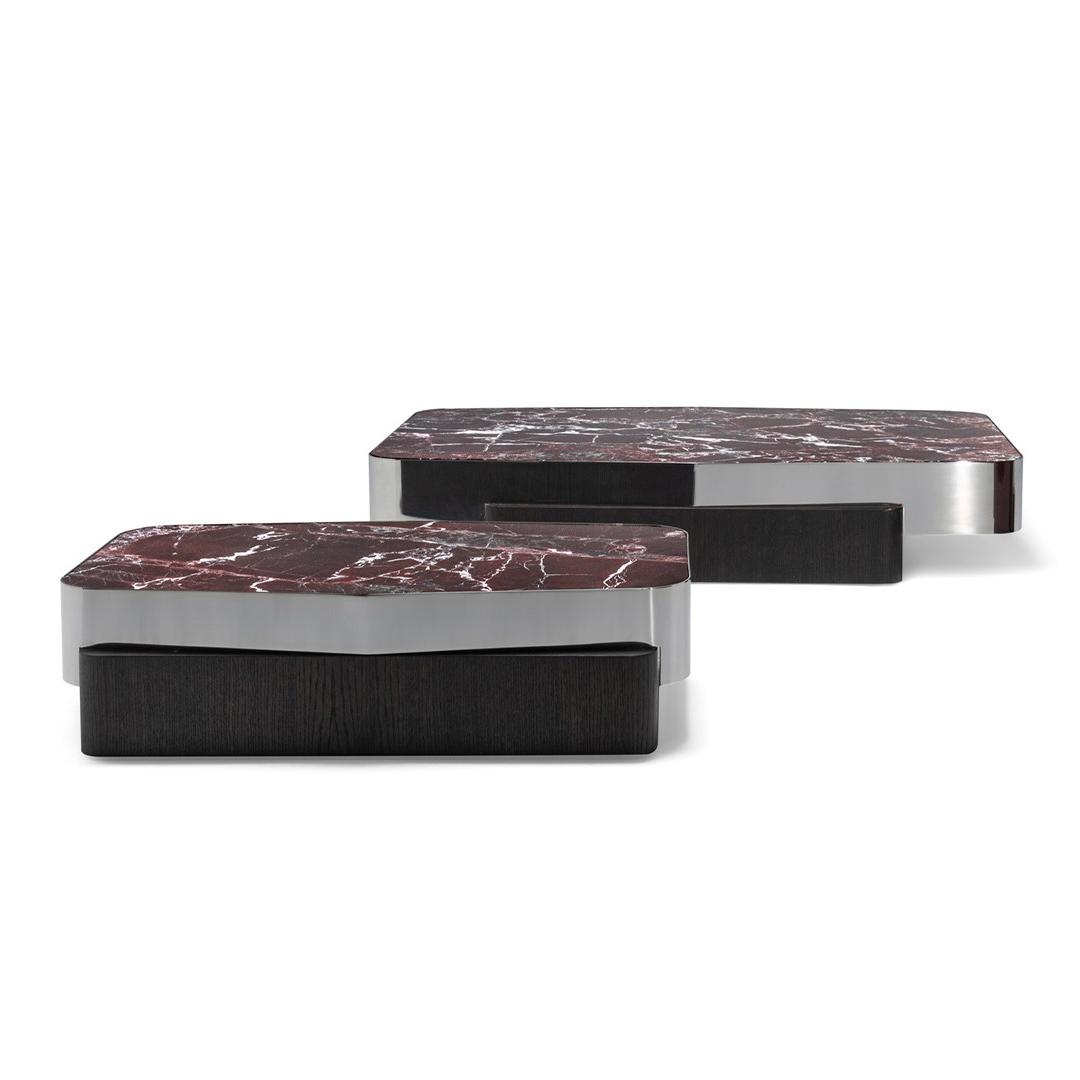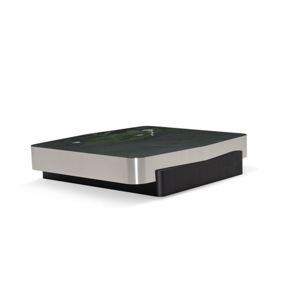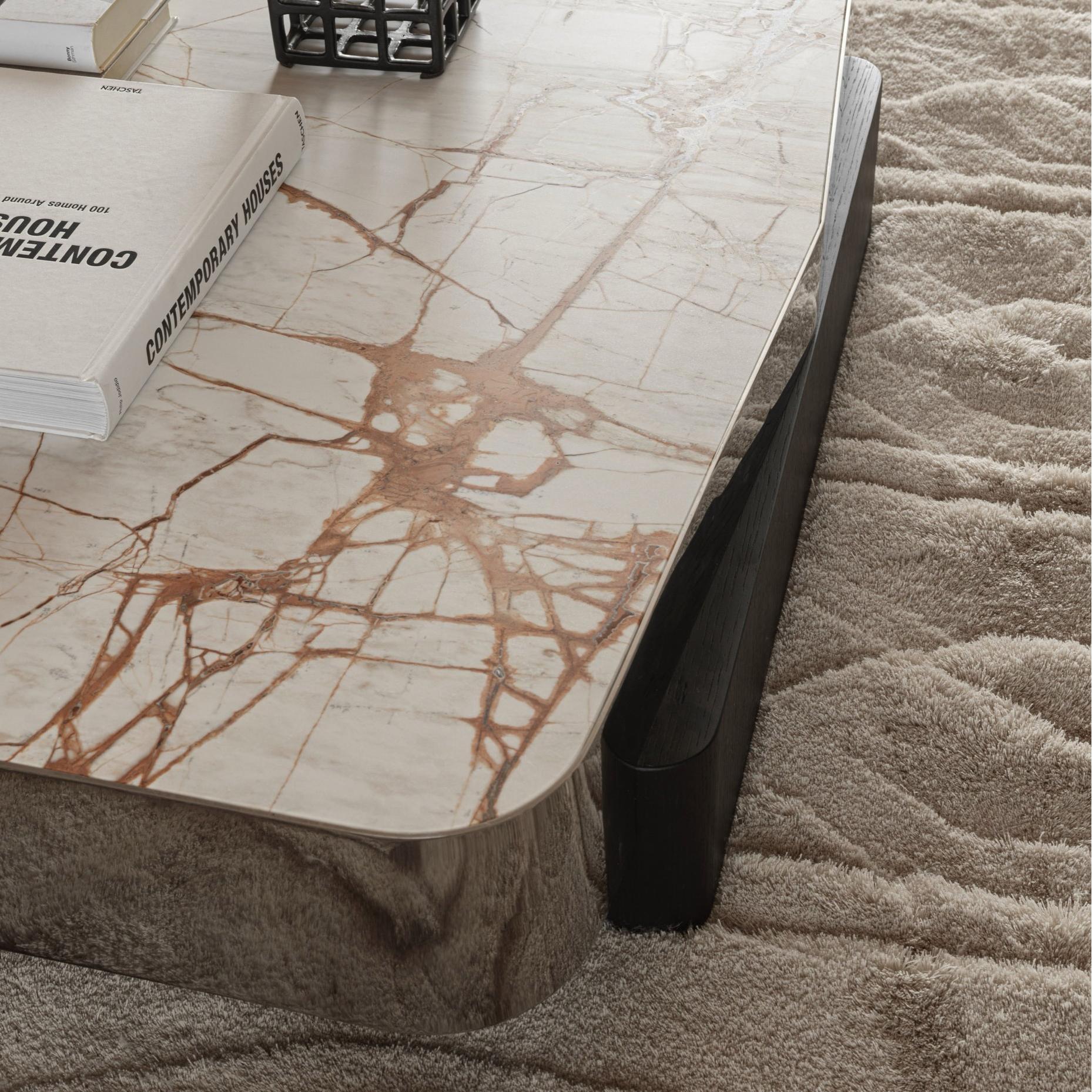 This coffee table has a distinct style and diverse functions, suitable for modern spaces. It integrates graphic lines and dynamic shapes into sofa combinations, and can also be used independently. Modular design supports flexible configuration, with a desktop made of high gloss paint or marble material, paired with bright steel edges, and a base available in coffee oak or black oak for a striking contrast.