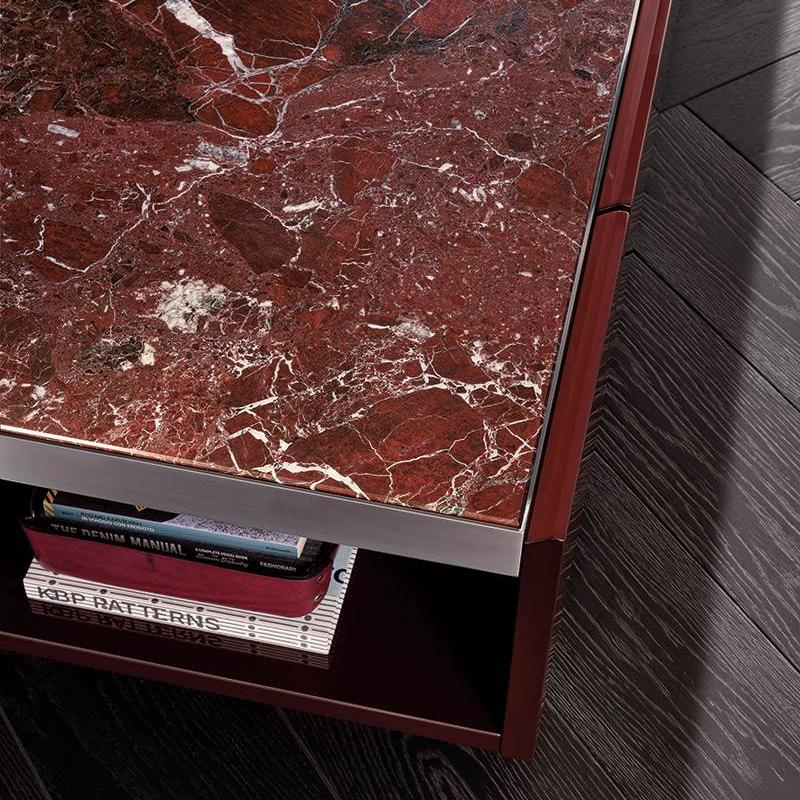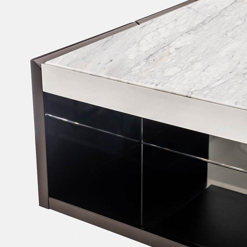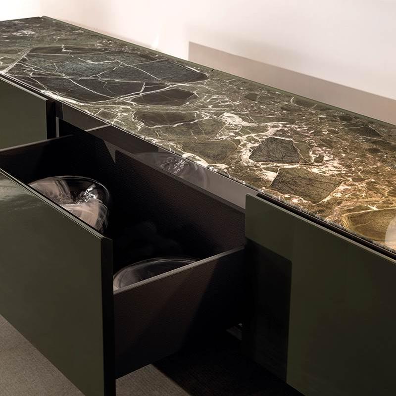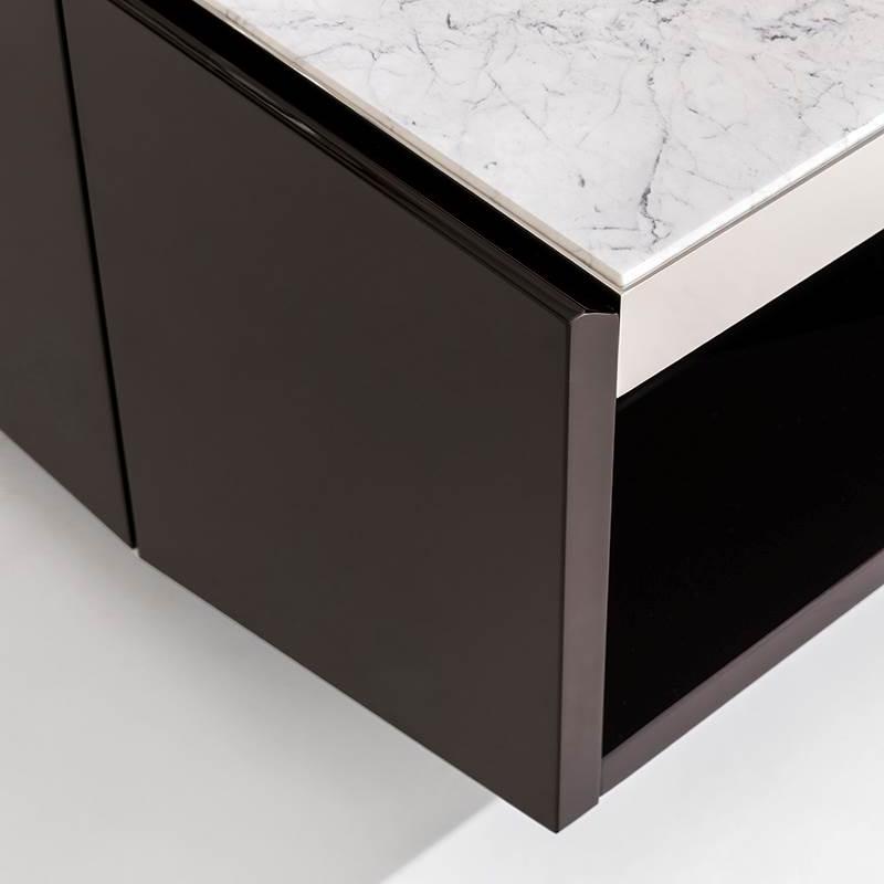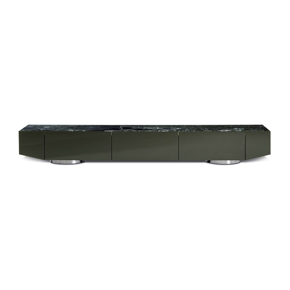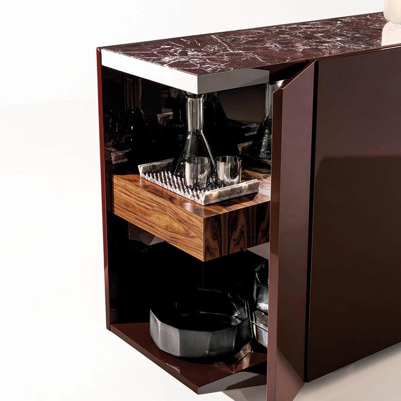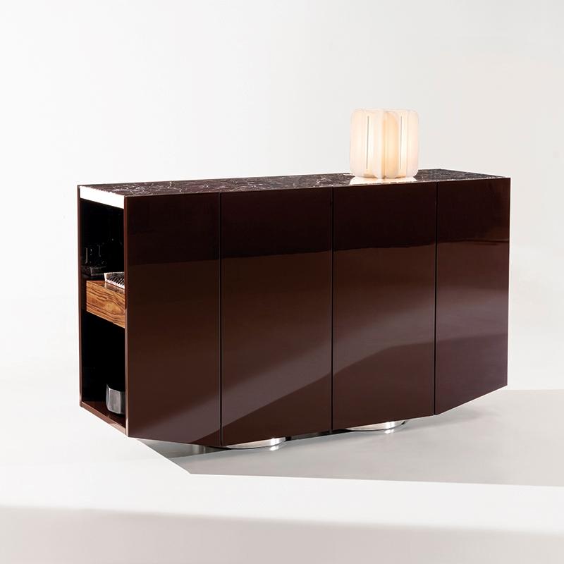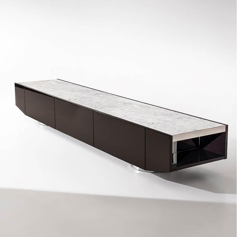 This Sideboard features a trapezoidal appearance and a tilted end storage design. Its elegant and modern silhouette and diverse materials (glossy paint finish, steel frame embedded with wood/marble roof) create a powerful visual impact. Placed on a large stainless steel base, showcasing unique personality.