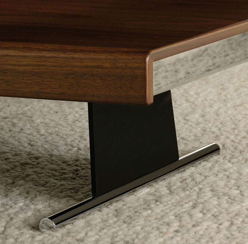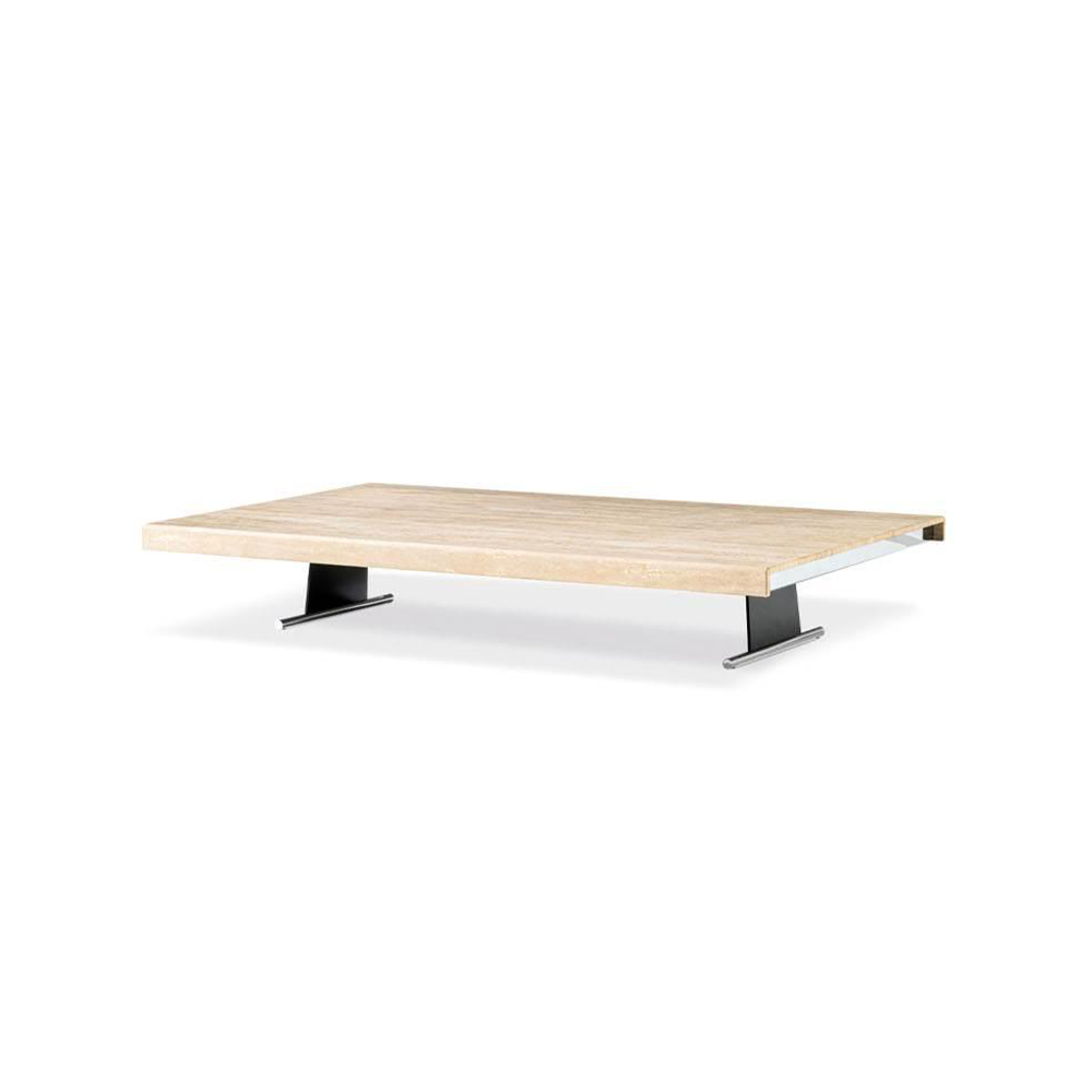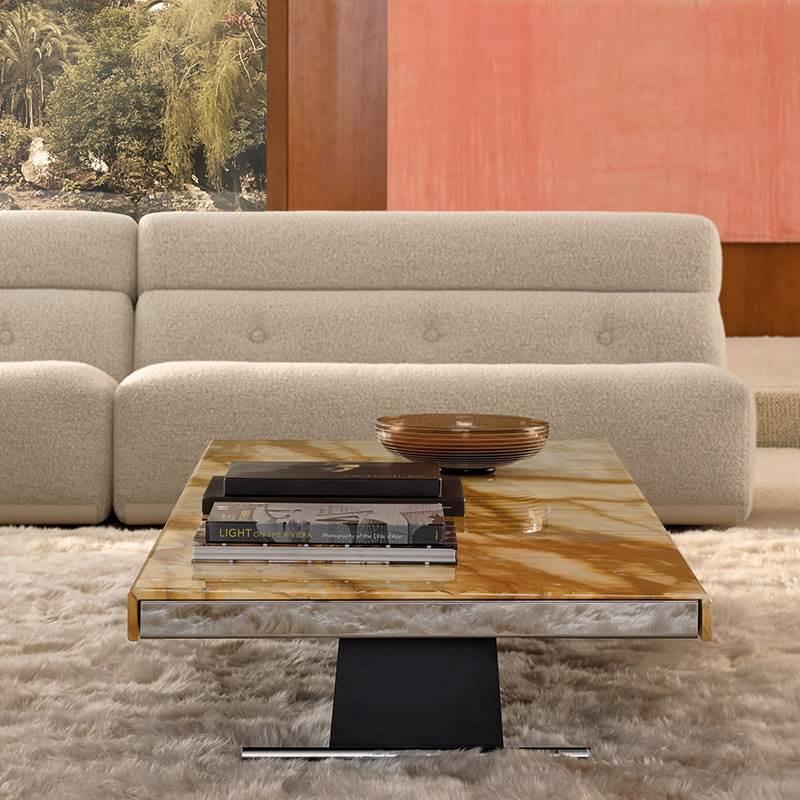 This coffee table comes in two forms: rectangular and square. The material is marble, stone or wood, with chrome plated metal strips embedded at the edges. The table legs are made of polished chrome plated pipes, paired with metal plates to support the tabletop, creating a lightweight and modern overall design.