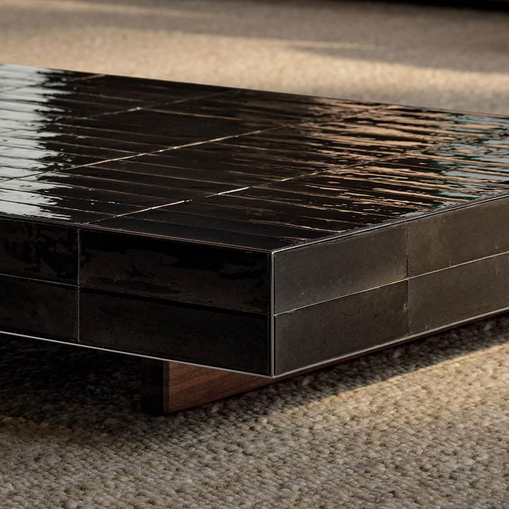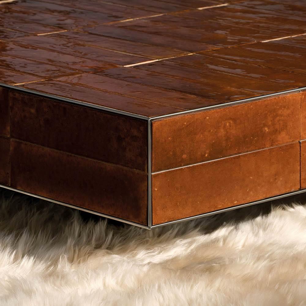 This coffee table features a glazed ceramic tile tabletop with a unique texture that shines in the light, making the space more vibrant. The edge of the desktop is decorated with chrome aluminum strips to reduce the overall visual weight, coupled with recessed wooden feet, making the table appear suspended and more lightweight.