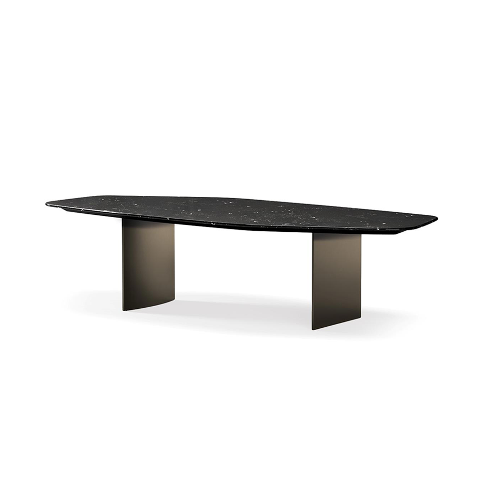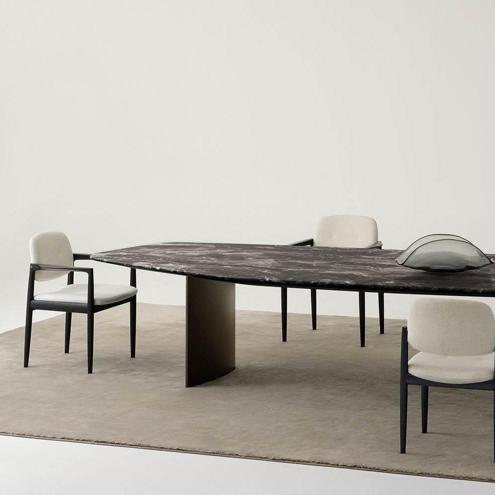 This dining table showcases a pursuit of elegant proportion and detail, with the tabletop transforming from a rectangle to a vibrant geometric shape. The slender bronze colored wooden table legs support a large tabletop in a lightweight posture, with a variety of materials. Their unique shape supports flexible seating arrangements, adding a sense of familiarity to the dining environment.