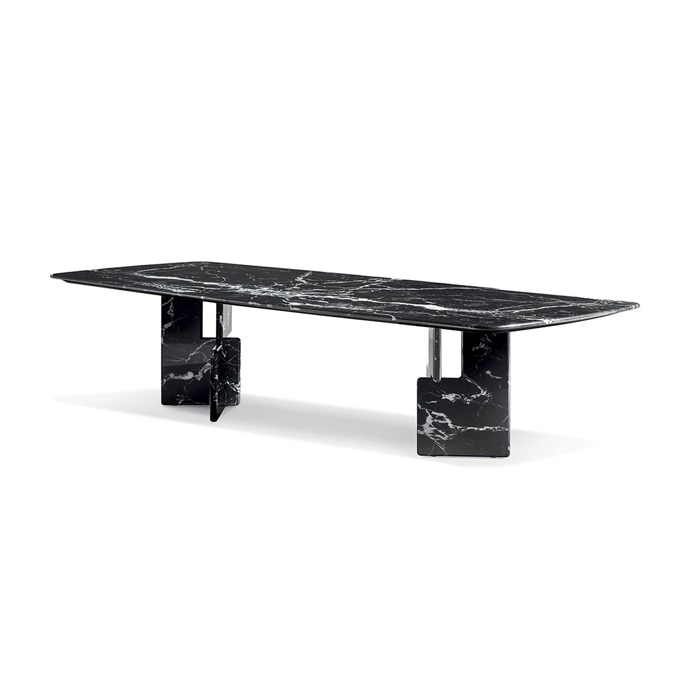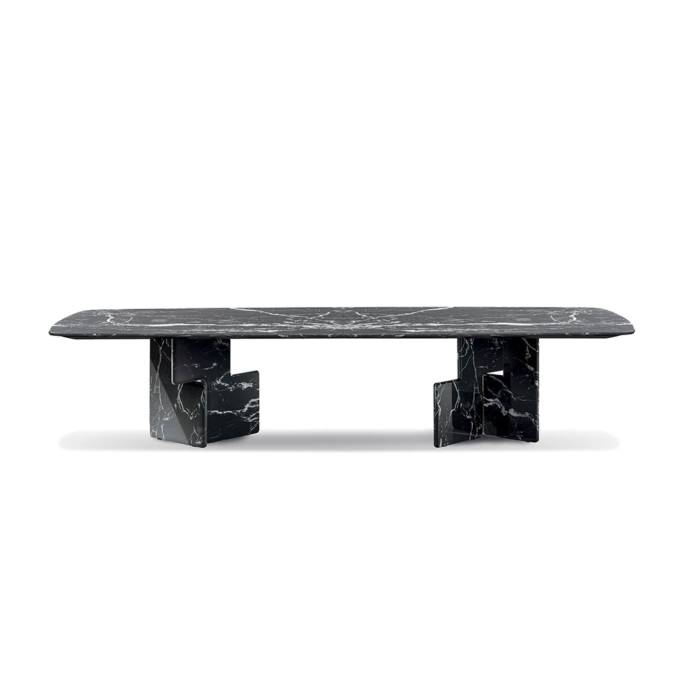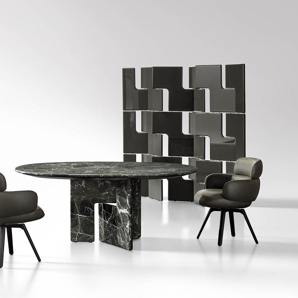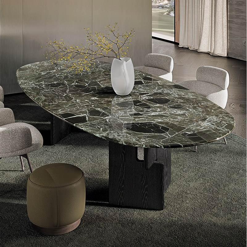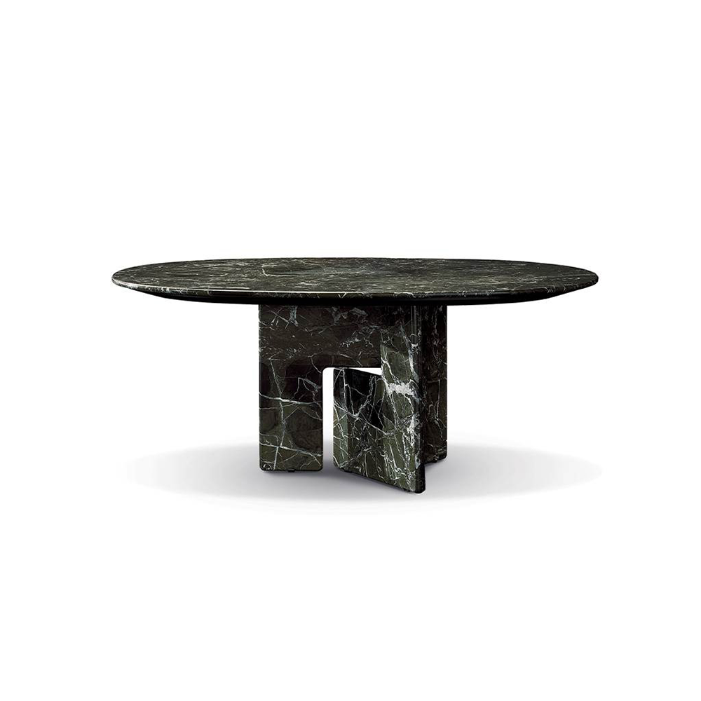 This dining table combines poetic and sculptural beauty, featuring a geometric interlocking base. The base can be made of marble or wood, supporting various shapes of rounded tabletops. Unified materials endow the table with strong visual tension and eternal appeal, like a bridge connecting the past and present.