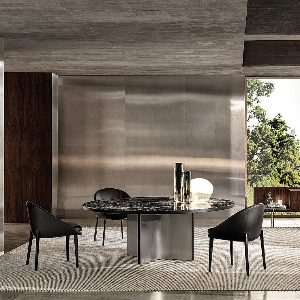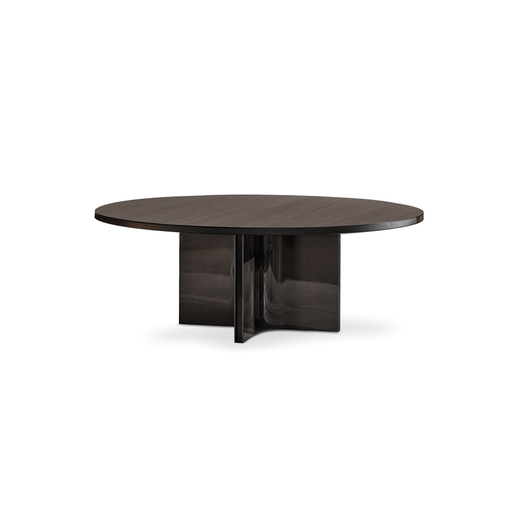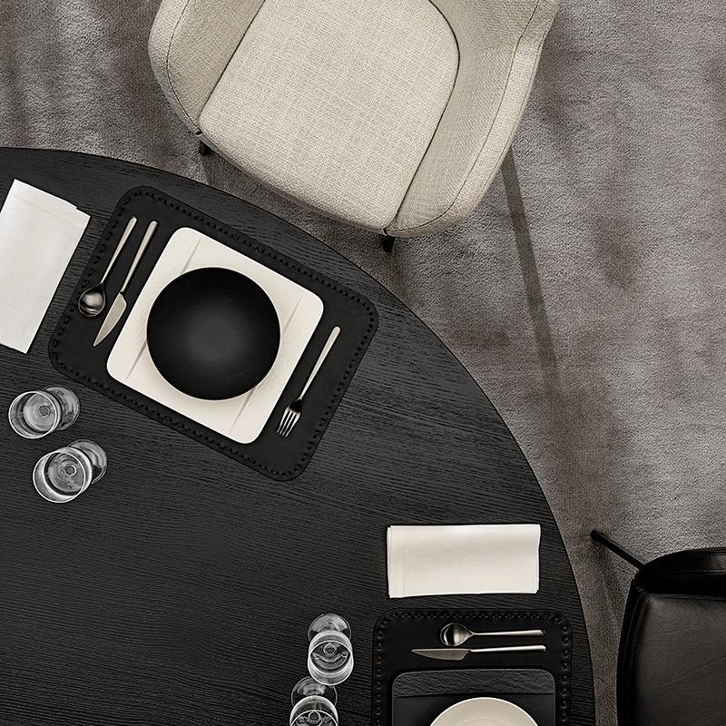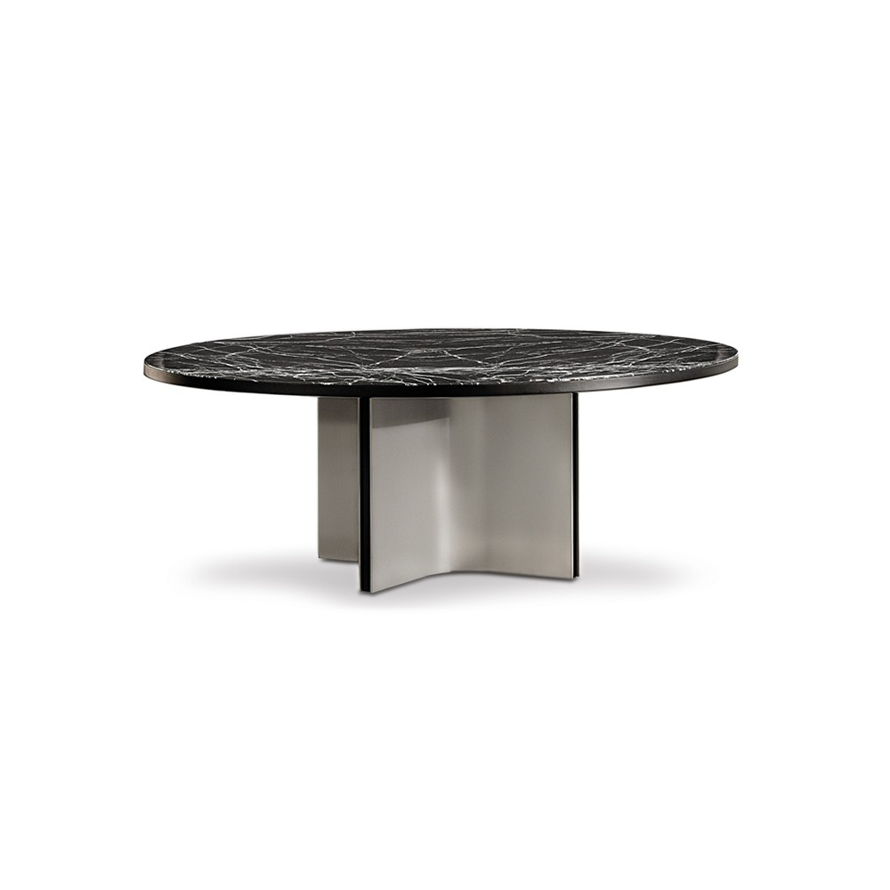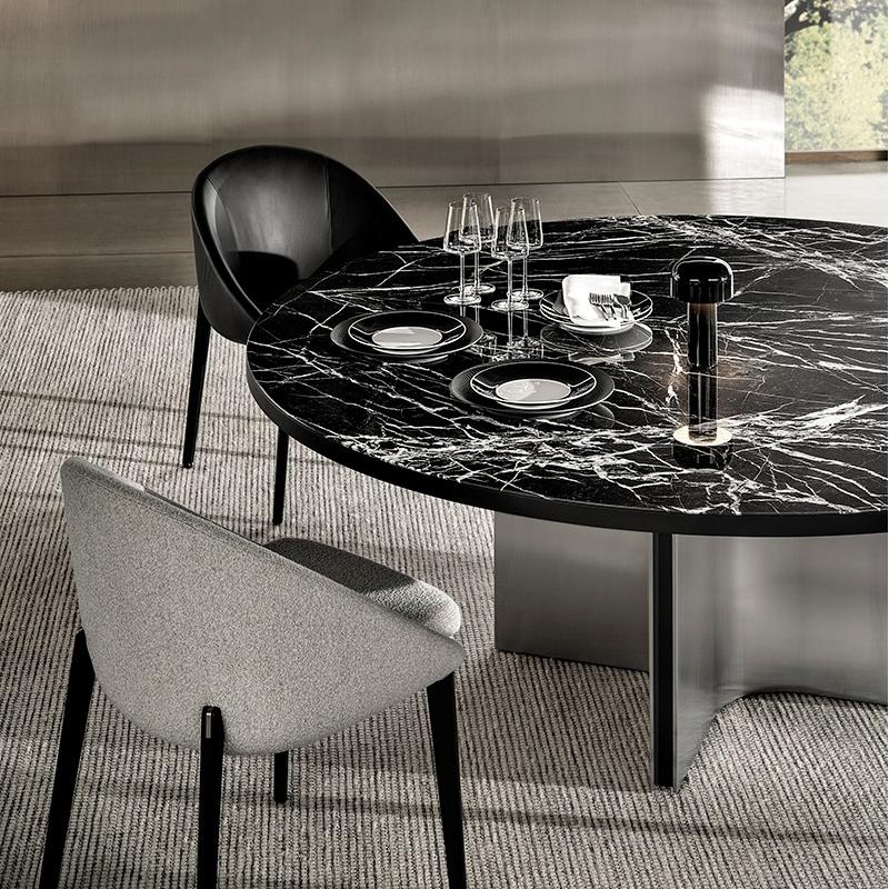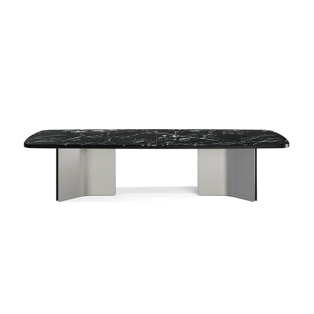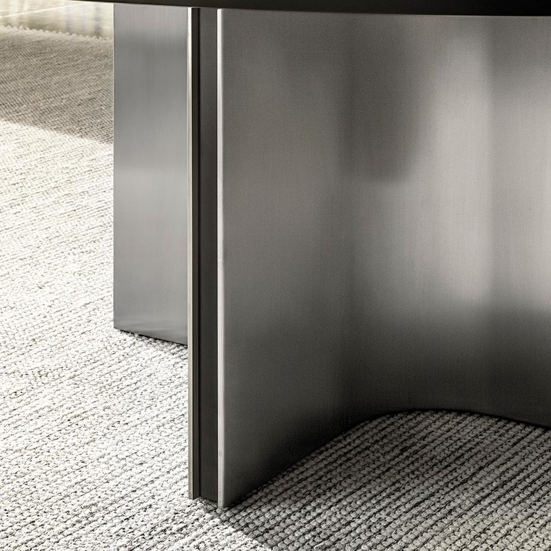 This dining table is exquisitely designed, with a sculptural curve base and quarter arc decoration. The metallic luster and black inserts complement each other, showing off its grandeur. Desktop design is flexible, and the base can be customized according to the shape and size of the desktop, adapting to various spaces.