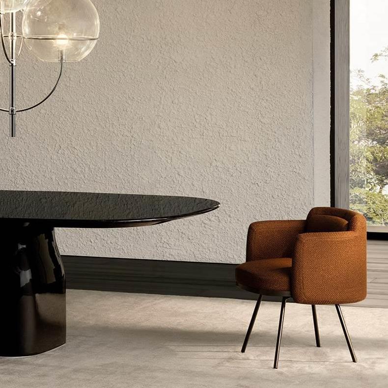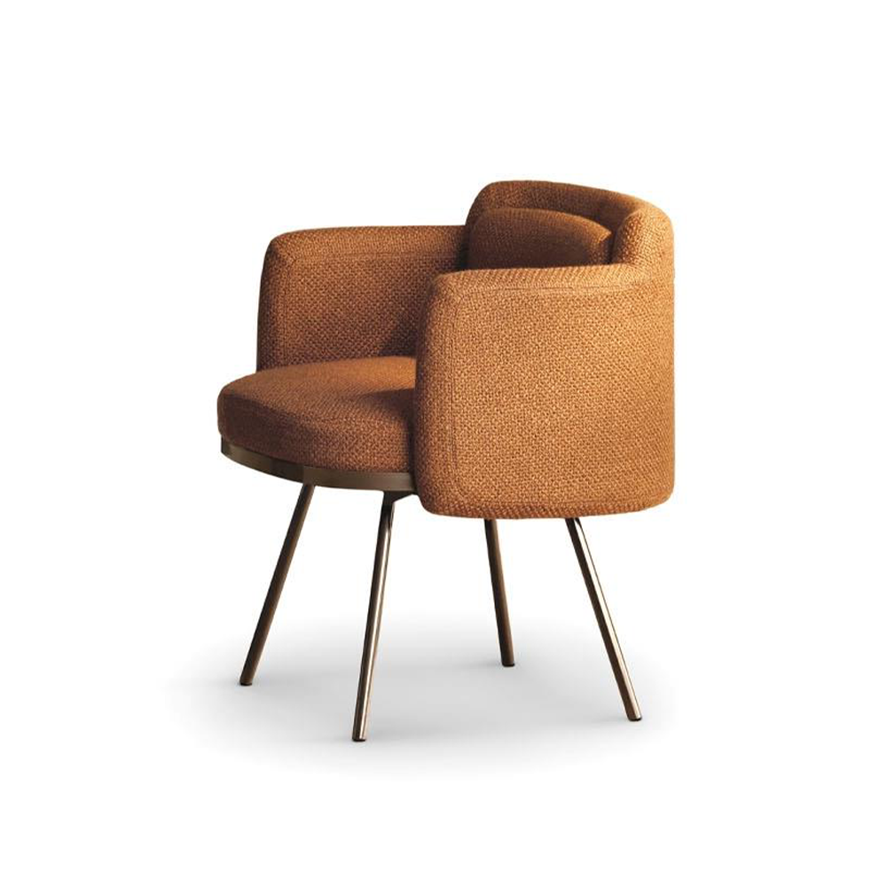 This dining chair features a thickened body to enhance visual comfort. Its soft curves surround the chair body, and the backrest naturally connects with the lumbar pad, providing a comfortable and wrapped feeling. The deep coffee colored metal base is paired with nickel or champagne gold plated details, creating an elegant contrast with the leather or fabric seat surface. Tape features compact comfort, 360 ° rotation function, and classic design, making it suitable for residential and hotel spaces.