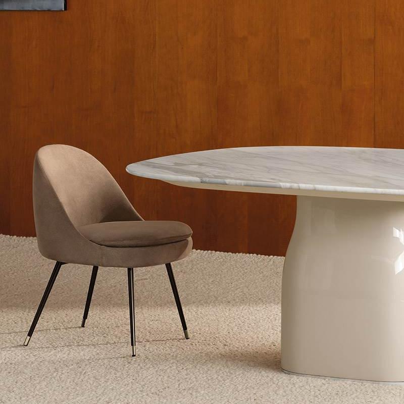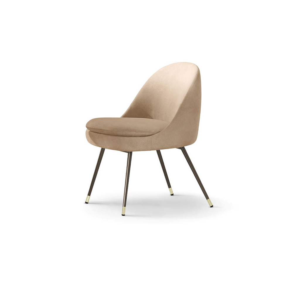 This dining chair features elegant and slender leg designs, made of light brown walnut wood or dark painted walnut wood, paired with a soft cloth covered chair body to create a vertical and dynamic line. The seat has a compact contour and coordinated proportions, suitable for both home and hotel environments, and can be flexibly arranged in social spaces, combining functionality and design aesthetics.